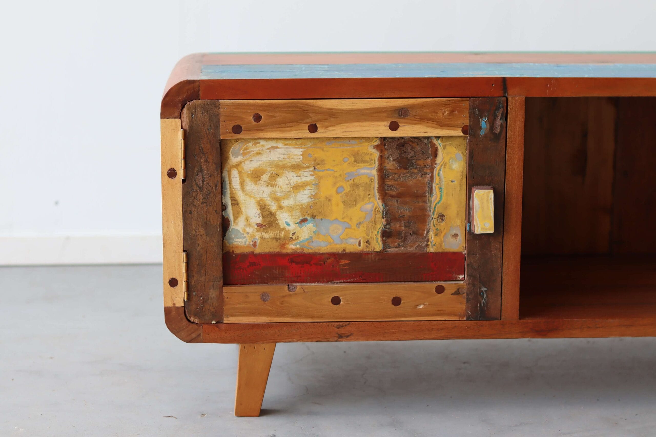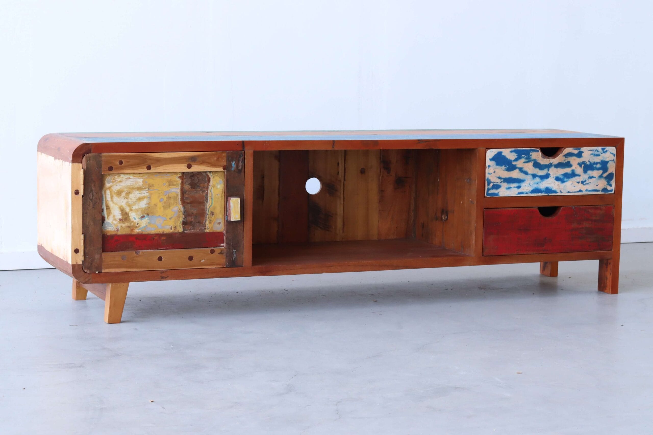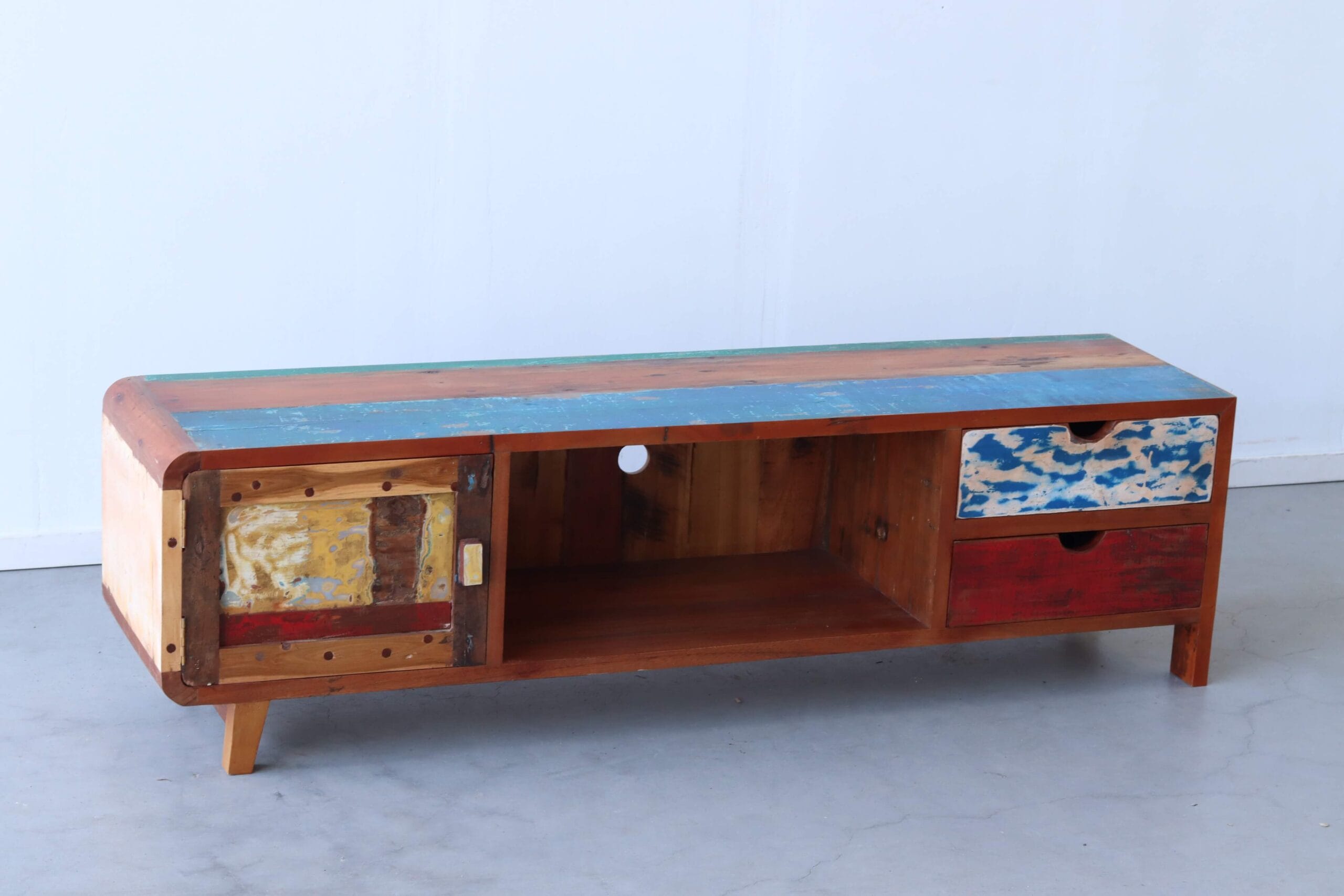 Kleurrijk, duurzaam, authentiek en op en top design. Het tv meubel Sanur behoort duidelijk niet tot de standaard meubels. Dit meubel is met de hand gemaakt op Bali van hout van oude vissersbootjes.
