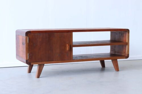 Binnen deze maten is er volop keuze in uitvoering. Je vindt TV meubels van boothout met handige deurtjes en laden om spullen netjes op te bergen, of met open vakken waarin je apparatuur en decoratie mooi tot hun recht komen. Je kunt kiezen voor een strak model met vierkante hoeken of een zachter ontwerp met afgeronde vormen. Wat je ook kiest: elk meubel is gemaakt van massief hout en zo stevig dat je er met gemak zelf op kunt gaan zitten.