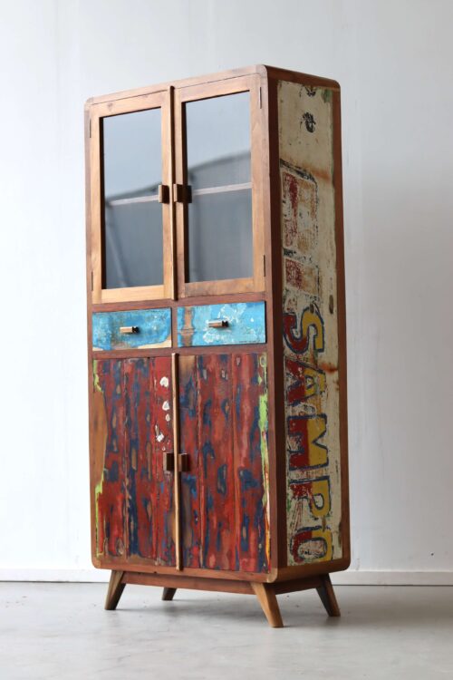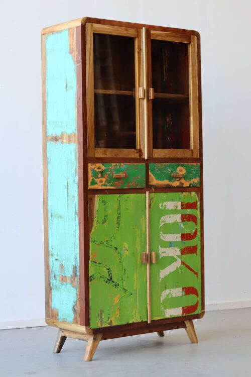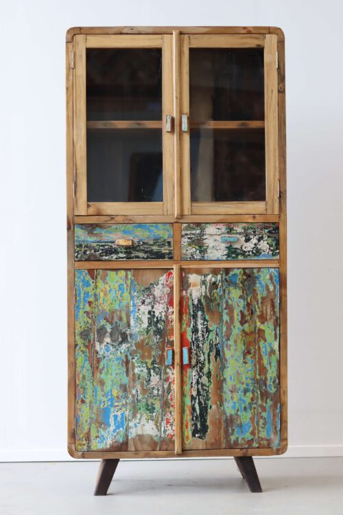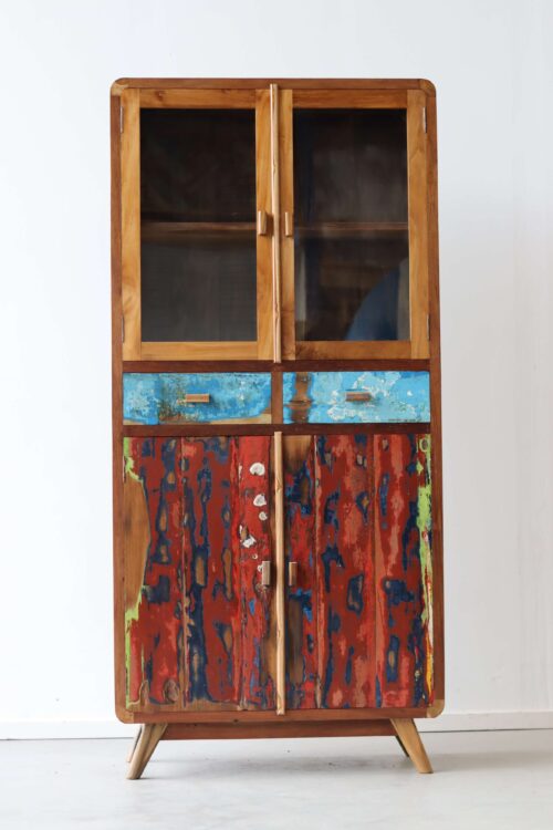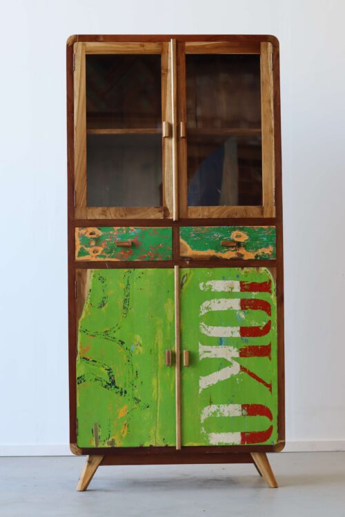 Je beste servies zet je boven in de kast, waar het achter de glazen deuren tentoongesteld kan worden. Doordat de kast door het glas toch dicht is, komt er ook nagenoeg geen stof bij. Dat scheelt poetsen! Als je geen servies hebt, heb je misschien wel een mooie verzameling van iets anders. Zet er bijvoorbeeld leuke kop en schotels, de legoverzameling van je kinderen, edelstenen en mineralen die je hebt verzameld, een erfstukje van je ouders of grootouders, je kan het zo gek niet verzinnen of het verdient een ereplekje achter het glas van deze retro vitrinekasten. Mooie souveniertjes van een reis naar Indonesië zouden natuurlijk een pronkstuk zijn.