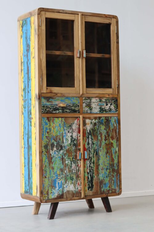 Deze retro vitrinekasten stralen kwaliteit uit. Nergens anders vind je deze mooie kasten. Uiteraard sowieso niet vanwege het unieke gekleurde hout, maar ook niet vanwege het vakmanschap waarmee deze retro vitrinekasten zijn gemaakt. De afwerking is subliem. De ronde hoeken en uit elkaar staande pootjes maken dit meubel tot een pronkstuk in je woonkamer. Hier kan je meer lezen over het productieproces van deze unieke kasten.