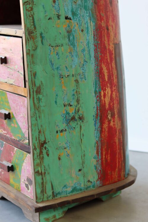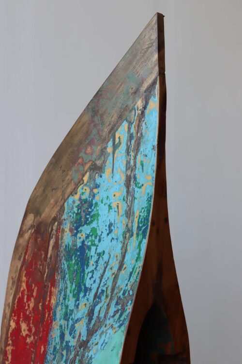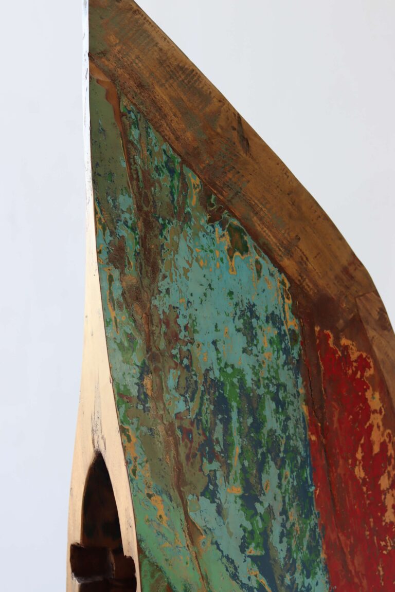 De vissersboten in Indonesië zijn vaak jarenlang blootgesteld aan de zee en hebben door de vele lagen verf unieke kleurenpatronen gekregen. Namen van boten of families zijn soms nog zichtbaar, wat elk meubel een stukje geschiedenis meegeeft. Door het hergebruik van dit hout dragen we bij aan een duurzamere omgang met grondstoffen, zonder concessies te doen aan stijl of kwaliteit.