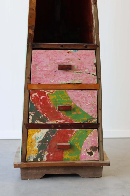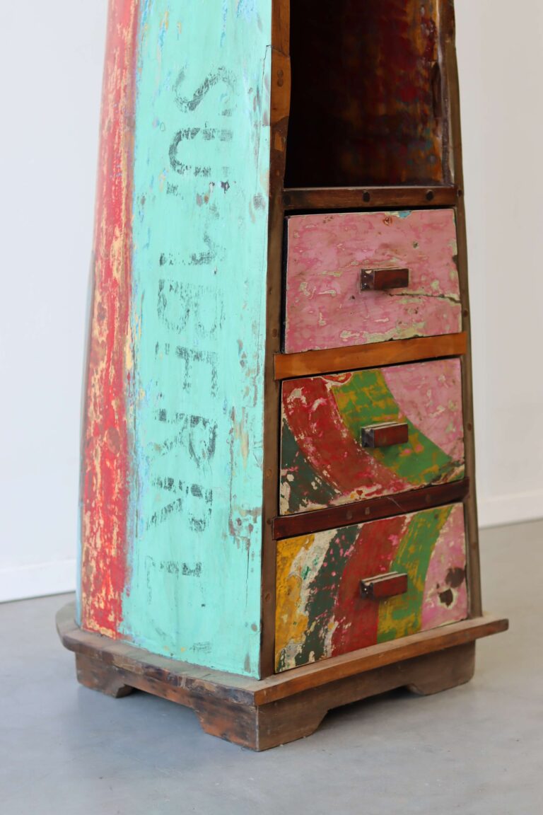 Een authentiek meubel gemaakt van hout van oude vissersbootjes van Bali, Java, Sumba, Lombok, Sulawesi of één van de vele andere eilanden van Indonesië. Voor het maken van onze meubels gebruiken wij uitsluitend hout van vissersboten die niet meer zeewaardig zijn. Dit hout, van uitzonderlijke kwaliteit, is door zijn kleurrijke en verweerde uitstraling een ware bron van inspiratie.