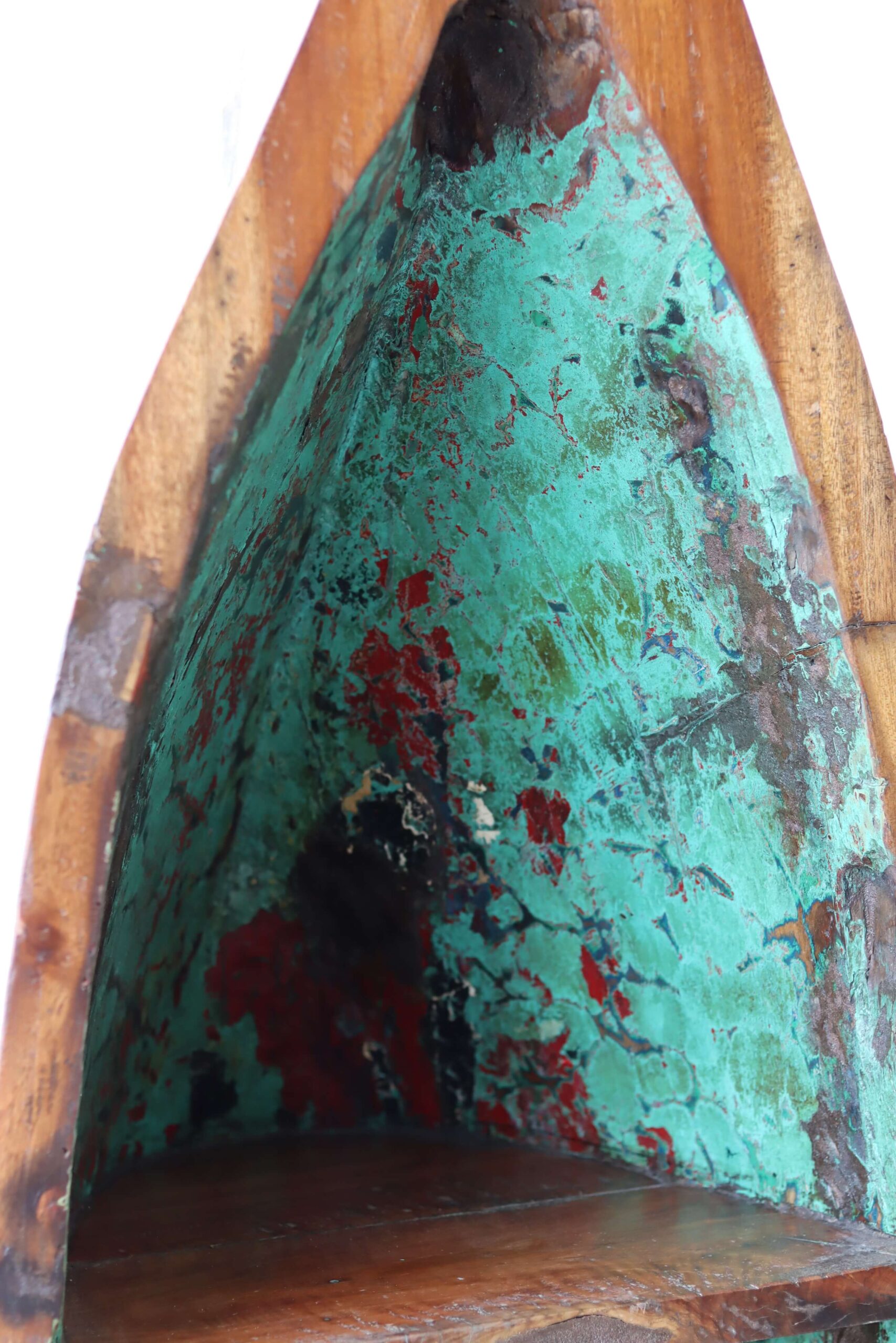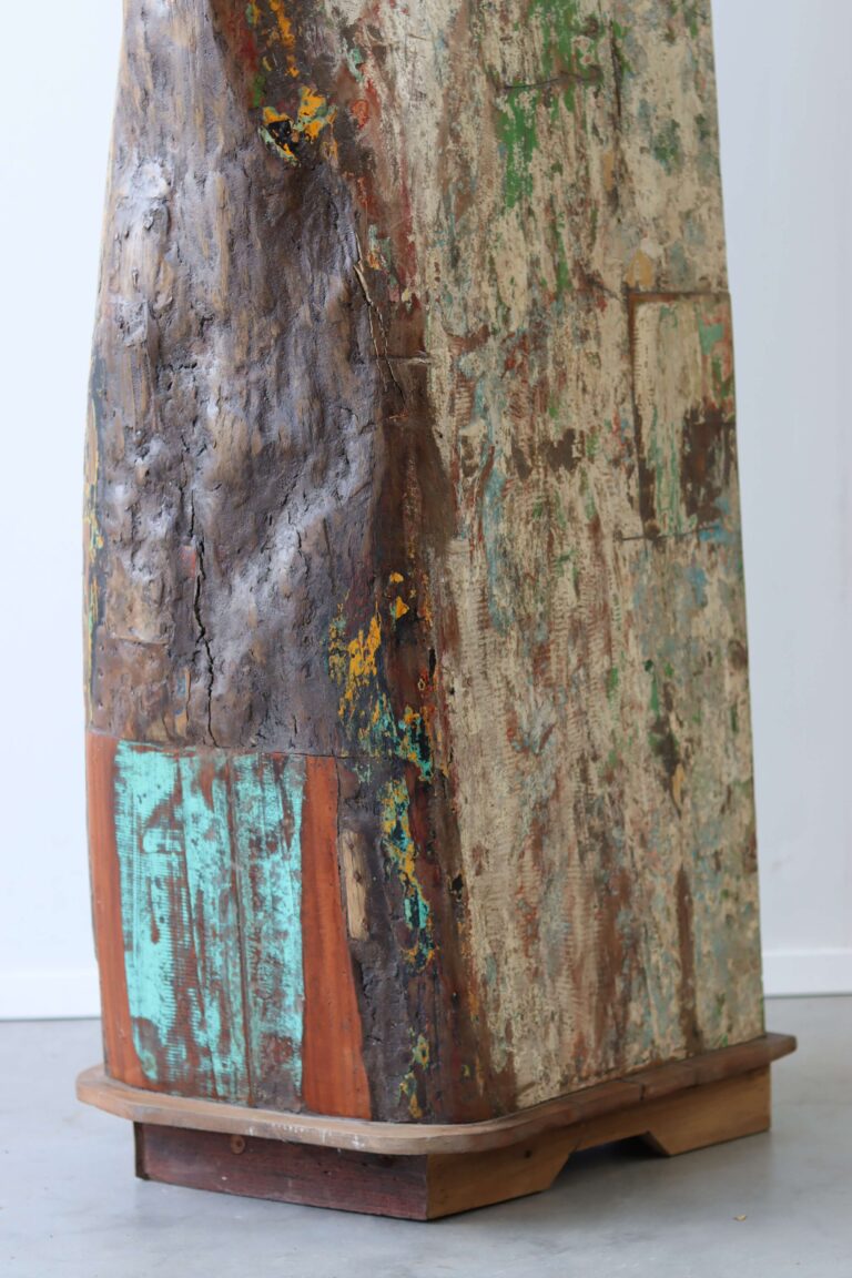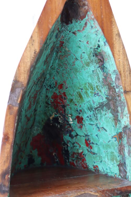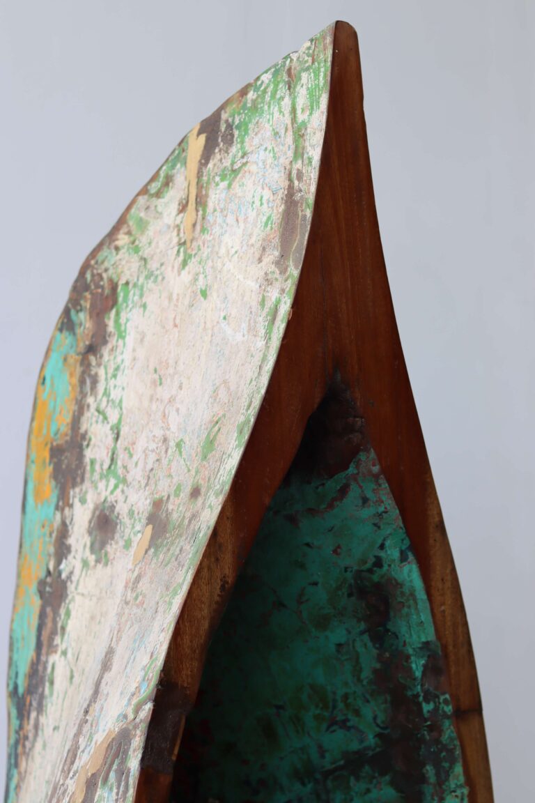 De vissersboten in Indonesië zijn vaak jarenlang blootgesteld aan de zee en hebben door de vele lagen verf unieke kleurenpatronen gekregen. Namen van boten of families zijn soms nog zichtbaar, wat elk meubel een stukje geschiedenis meegeeft. Door het hergebruik van dit hout dragen we bij aan een duurzamere omgang met grondstoffen, zonder concessies te doen aan stijl of kwaliteit.