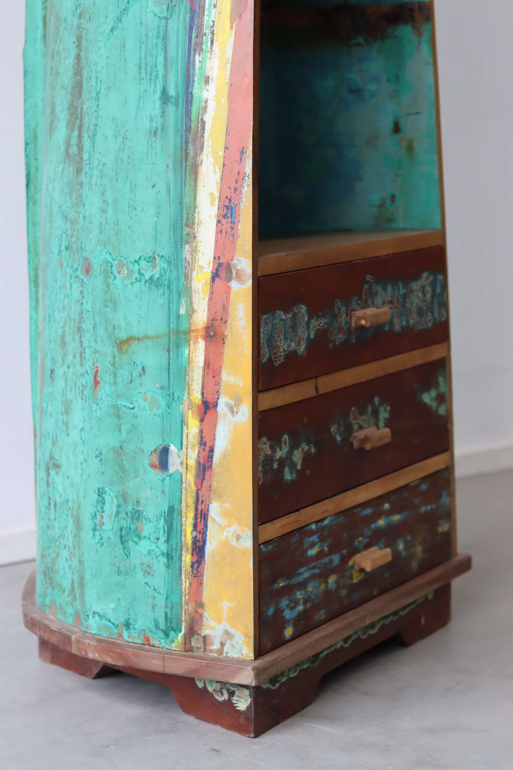 Sommige meubels voel je meteen. Niet alleen omdat ze opvallen, maar omdat ze een verhaal met zich meebrengen. De bootkast Kapal is zo’n meubel. Gemaakt van gerecycled hout van oude vissersboten uit Indonesië, opgebouwd uit kleuren, nerven en sporen van een leven op het water. Deze kast brengt karakter, kleur en een vleugje avontuur in je interieur.