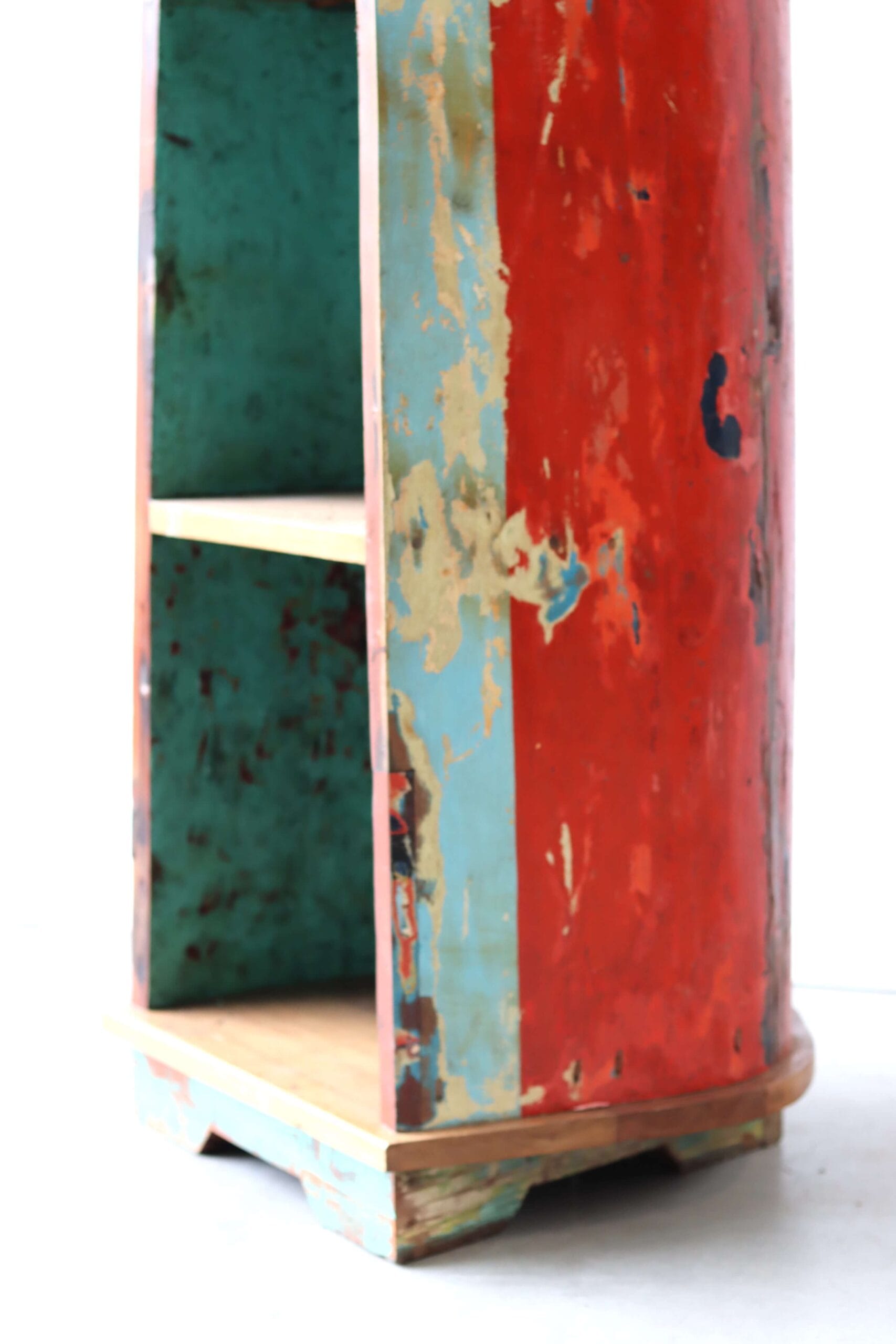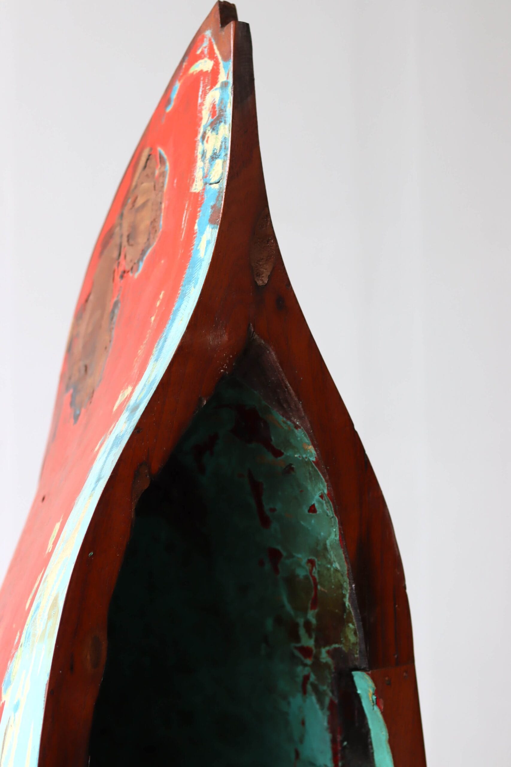 De vissersboten in Indonesië zijn vaak jarenlang blootgesteld aan de zee en hebben door de vele lagen verf unieke kleurenpatronen gekregen. Namen van boten of families zijn soms nog zichtbaar, wat elk meubel een stukje geschiedenis meegeeft. Door het hergebruik van dit hout dragen we bij aan een duurzamere omgang met grondstoffen, zonder concessies te doen aan stijl of kwaliteit.