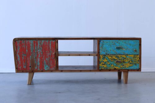 Tv meubel van sloophout met kleurrijke deuren – handgemaakt meubel van Daan Hout