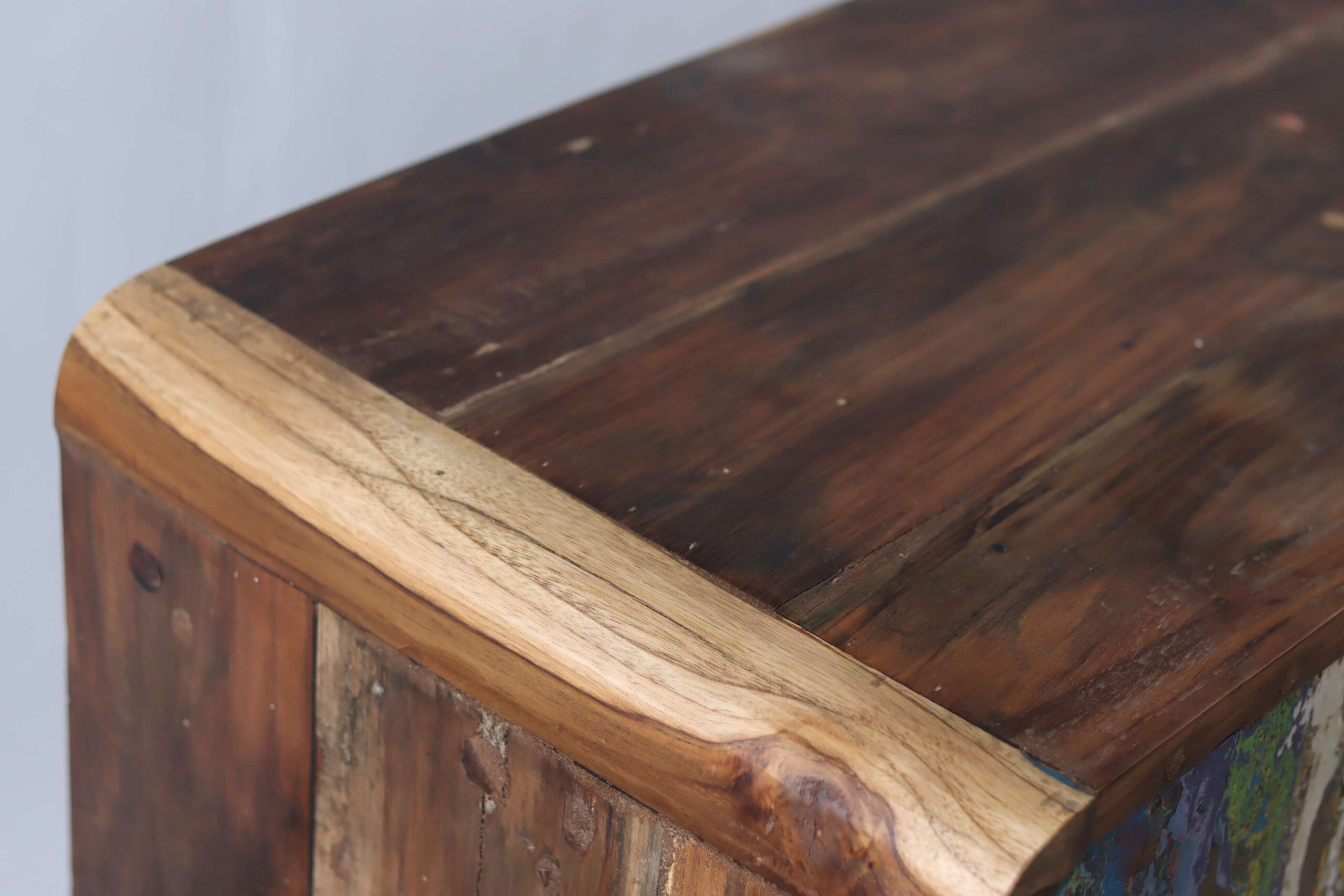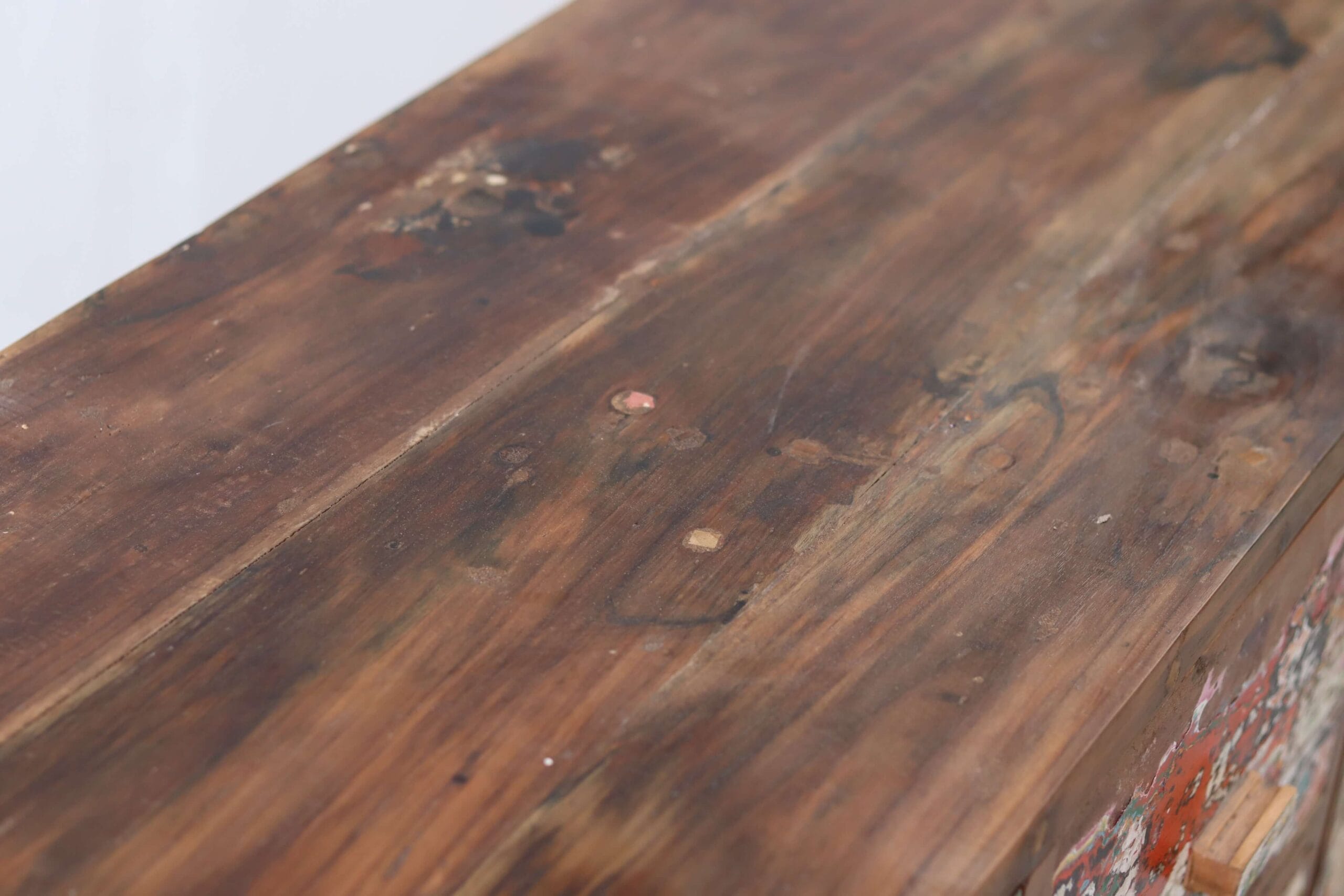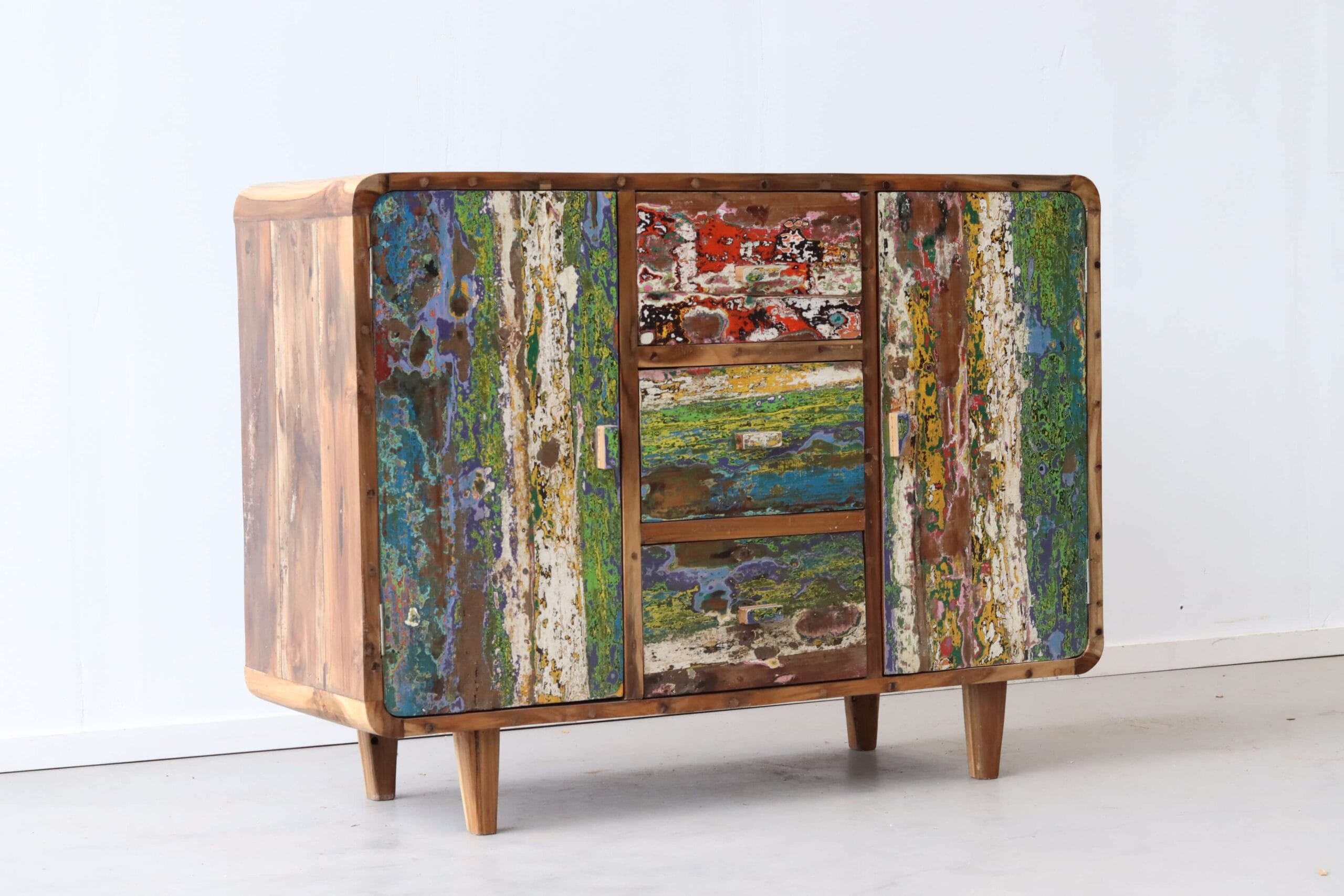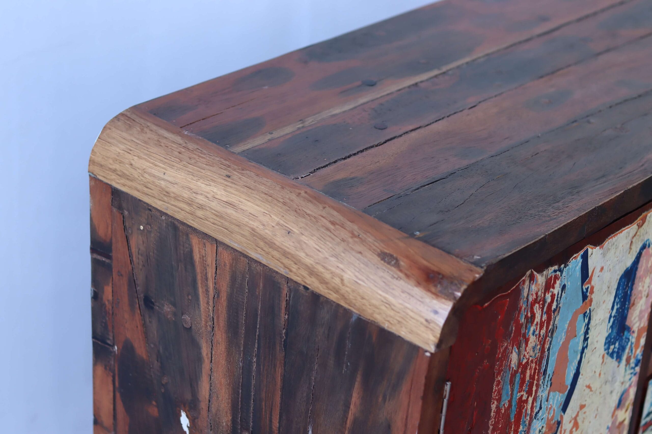 De vissersbootjes zijn door de jaren heen steeds opnieuw geverfd, waardoor meerdere lagen verf op het hout zijn achtergebleven. Deze verweerde restlagen zorgen voor een speels en kleurrijk effect. Ieder dressoir is daardoor eenmalig en authentiek. Met dit meubel haal je niet alleen een praktisch opbergstuk in huis, maar ook een stukje wereldgeschiedenis – en draag je bij aan een circulaire toekomst.