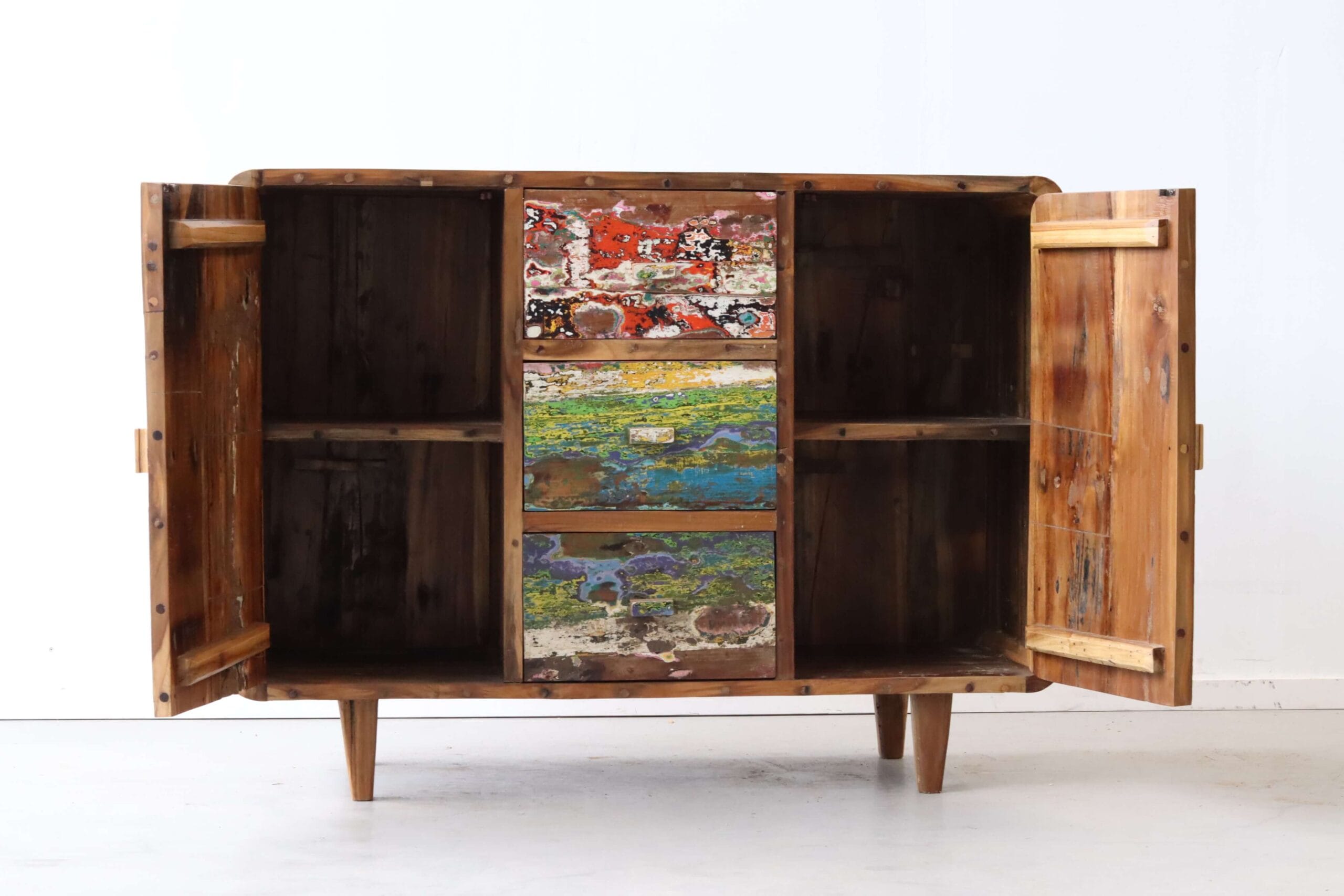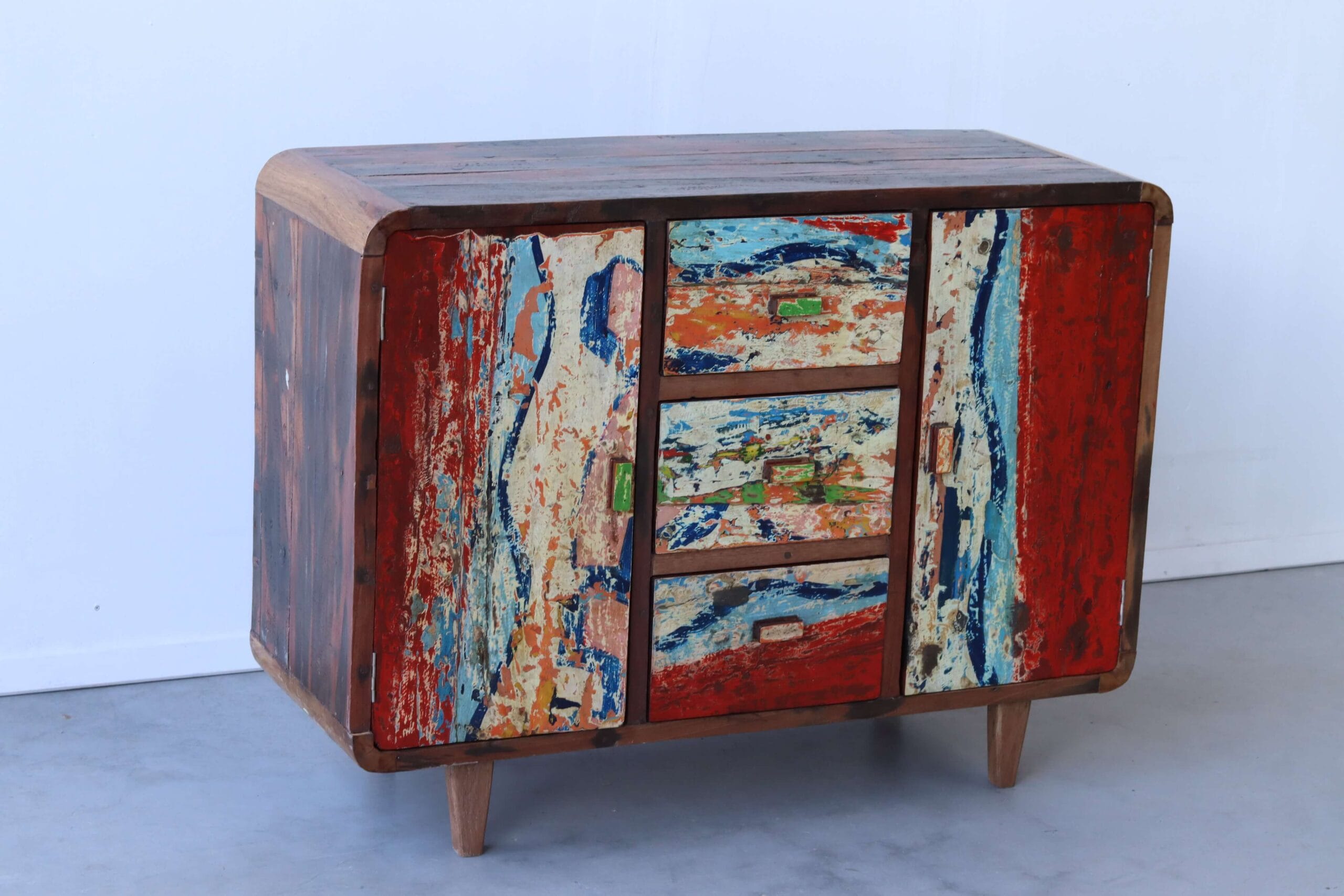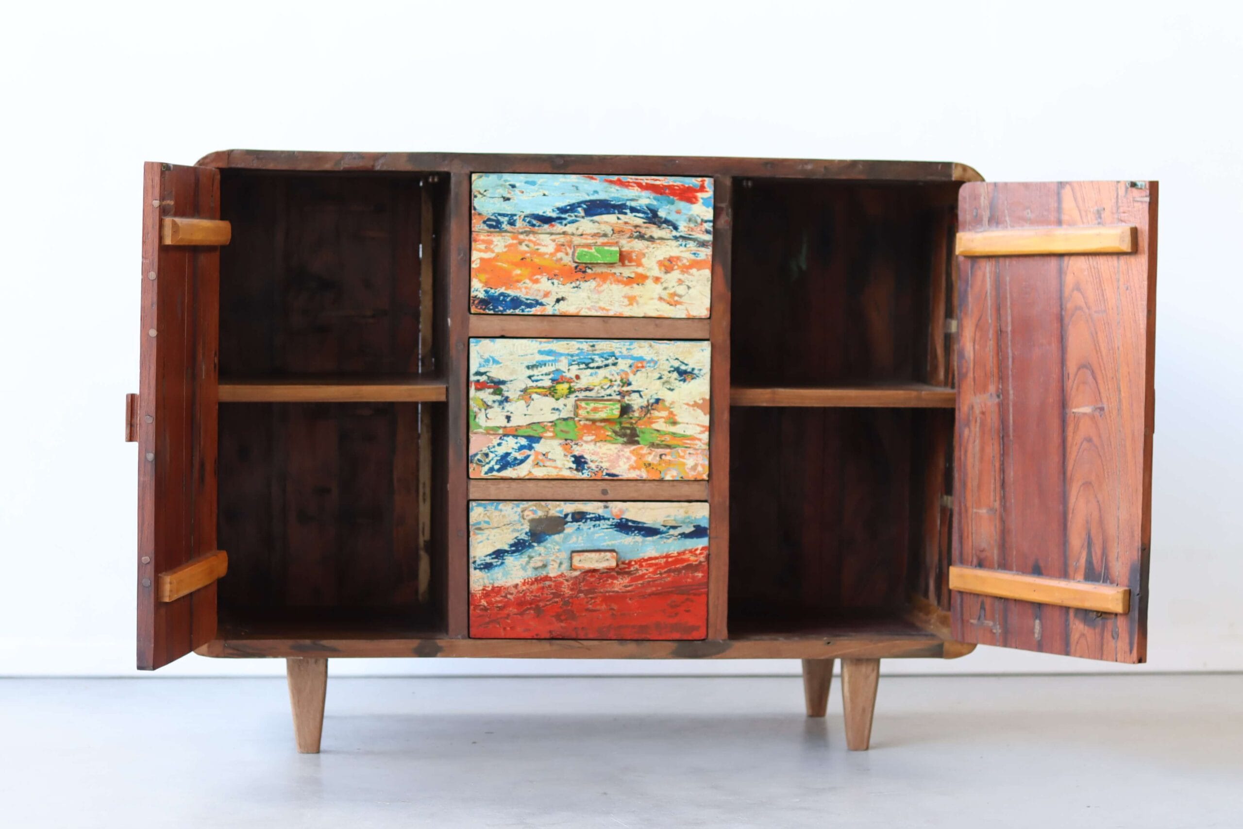Dit bijzondere dressoir is gemaakt van het hout van oude vissersbootjes uit Bali en Java. Met zijn twee deuren met legplank en drie handige laden in het midden is het een meubel dat functionaliteit en karakter perfect samenbrengt.