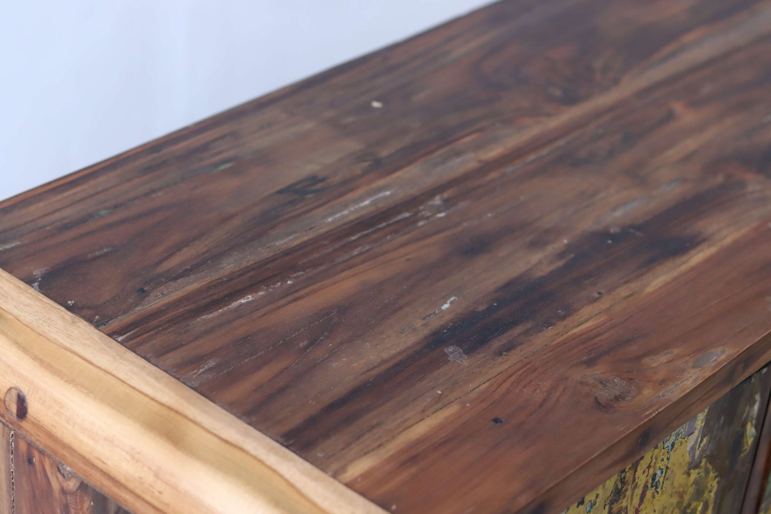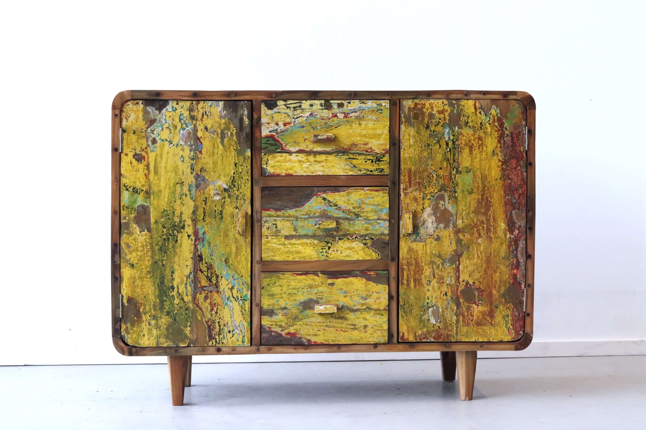 Dit dressoir is gemaakt op Bali van herwonnen boothout van oude vissersbootjes. Door de verf die de bootjes gedurende hun bestaan gekregen hebben is ieder item uniek.