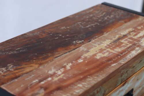 Het verweerde hout herinnert aan oude gebouwen in India, terwijl het stalen frame het meubel een moderne, robuuste uitstraling geeft.