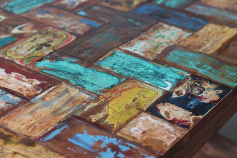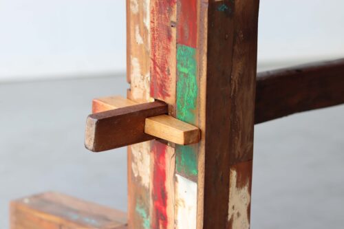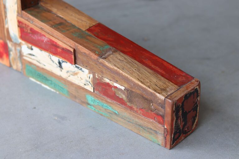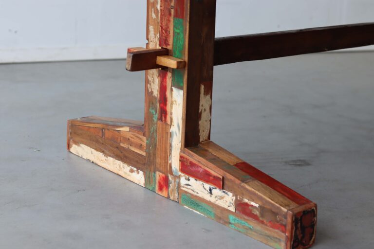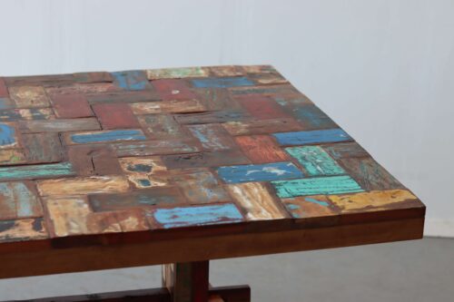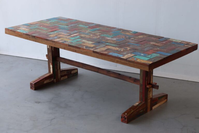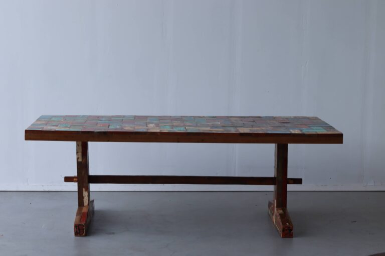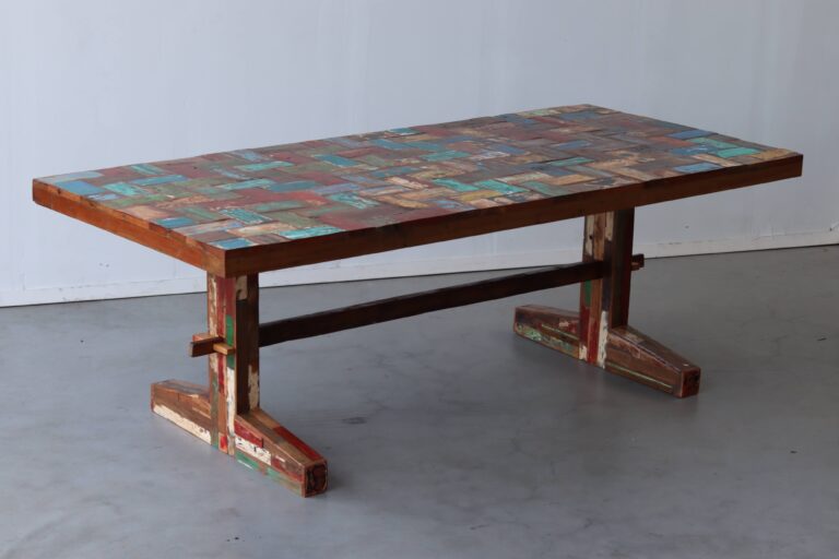 De kloostertafel sloophout Bali Oceaan is allesbehalve standaard. Deze robuuste eettafel is met de hand gemaakt van gerecycled hout uit oude vissersbootjes en huizen op Bali. Het mozaïekblad met zijn kleurrijke inleg vertelt het verhaal van zee, zon en tijd. Elk stuk hout is uniek — en dus is elke tafel dat ook.