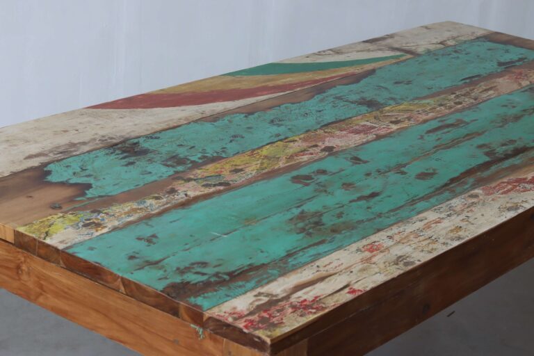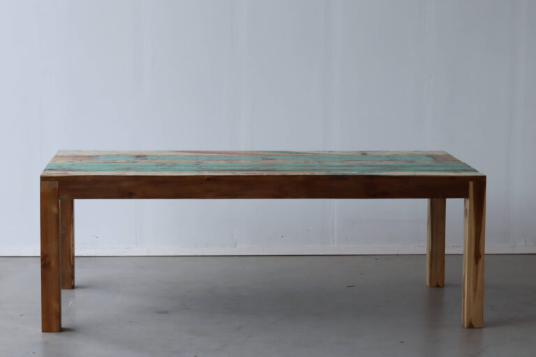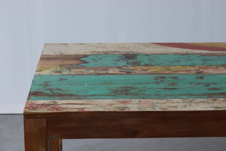 Elke houten eettafel van sloophout wordt met de hand gemaakt door ervaren ambachtslieden. Het gebruik van sloophout zorgt ervoor dat geen enkele tafel hetzelfde is. De verweerde verfresten, natuurlijke kleurschakeringen en originele houtstructuur geven de tafel een uniek karakter. Het hout is niet alleen stevig en duurzaam, maar draagt ook bij aan een milieuvriendelijk interieur.