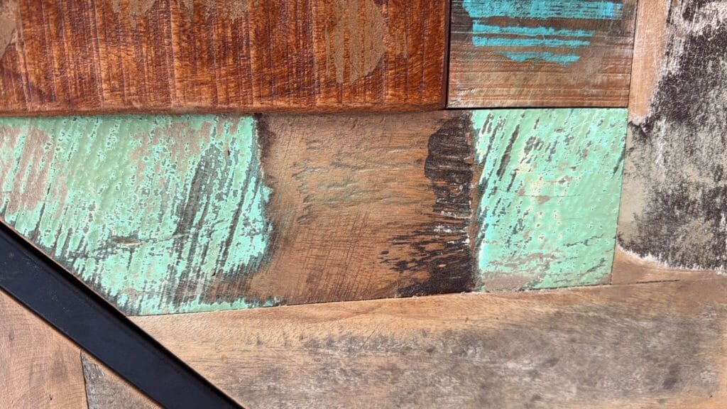 Dat verleden zie je terug. In kleurverschillen. In kleine imperfecties. In sporen van gebruik die het meubel juist eigen maken.