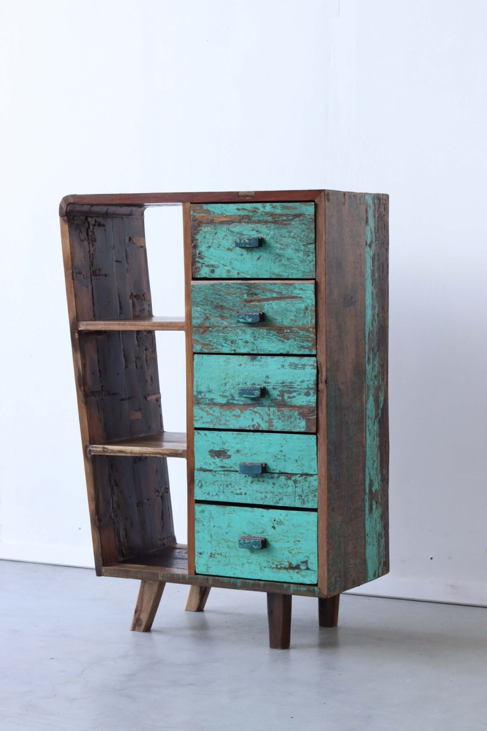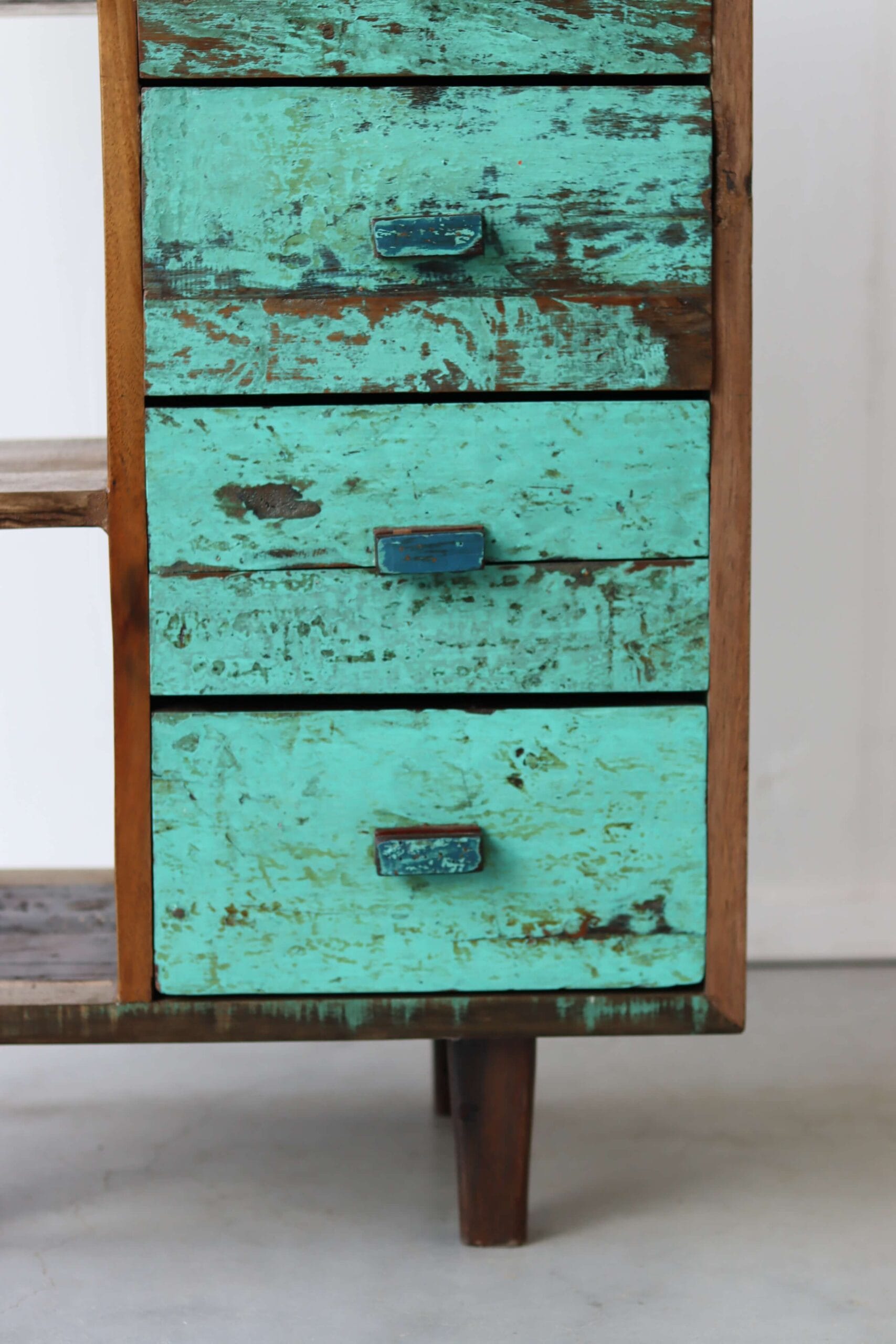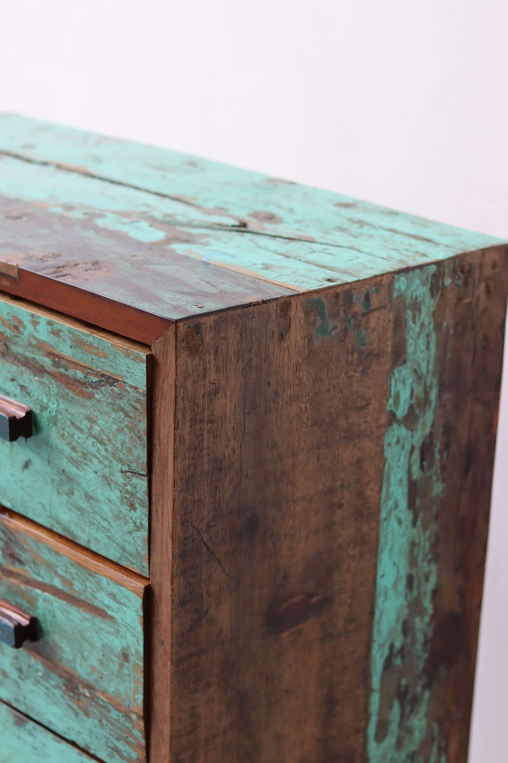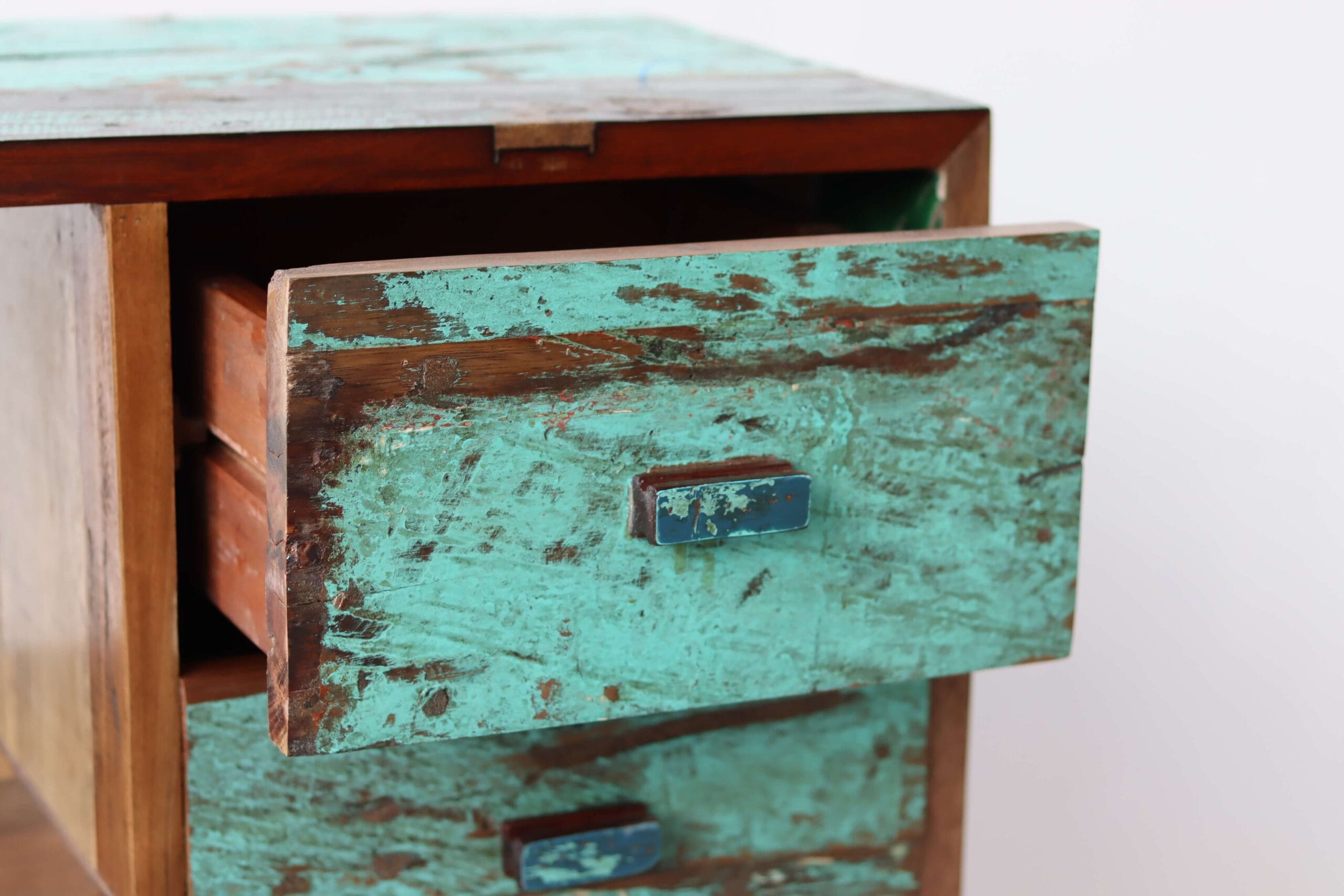 Breng een stukje geschiedenis in huis met een vintage ladekast sloophout. Deze bijzondere meubels worden met de hand gemaakt van gerecycled hout uit oude vissersboten uit Indonesië. Elke plank draagt sporen van een avontuurlijk verleden op zee – van verweerde verfresten tot robuuste houtstructuren. Dit zorgt voor een uniek en duurzaam meubelstuk met een warme, authentieke uitstraling.