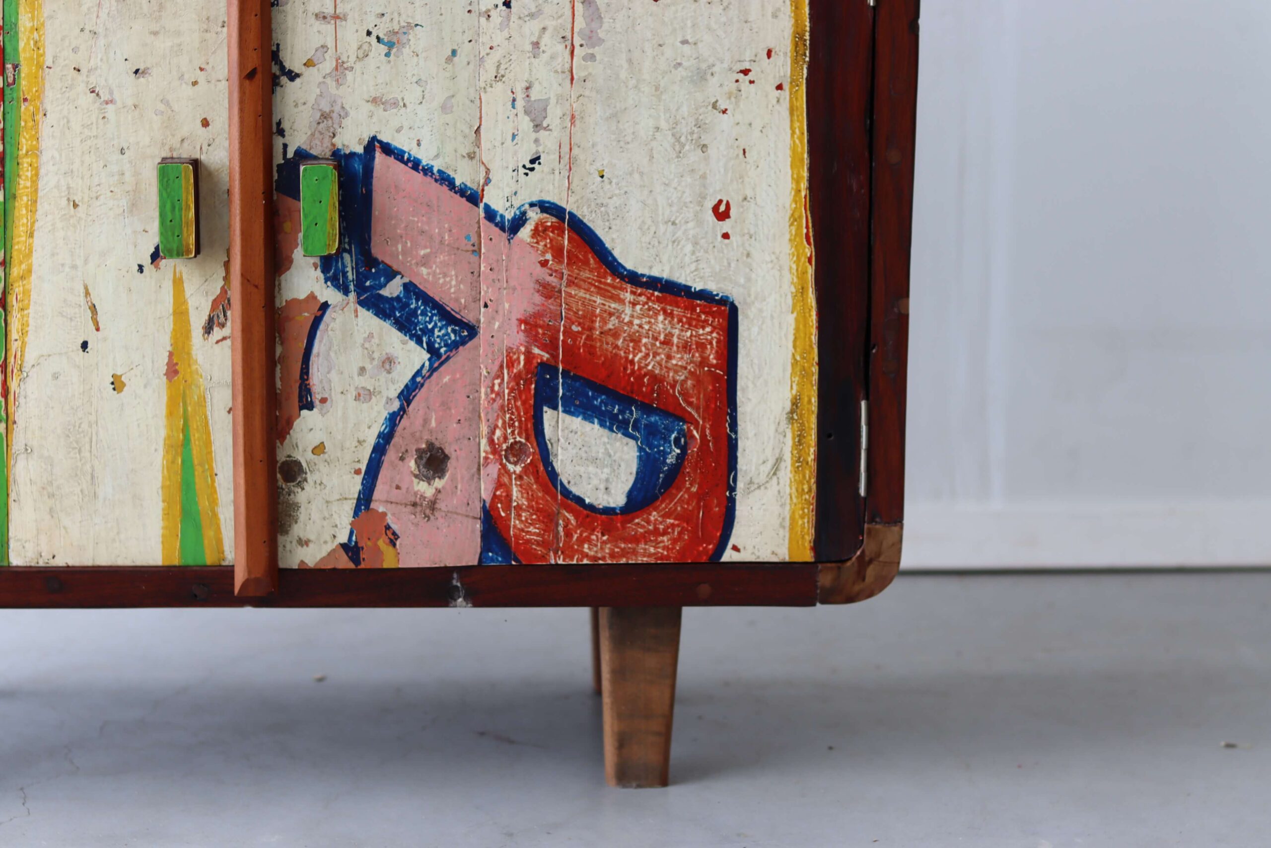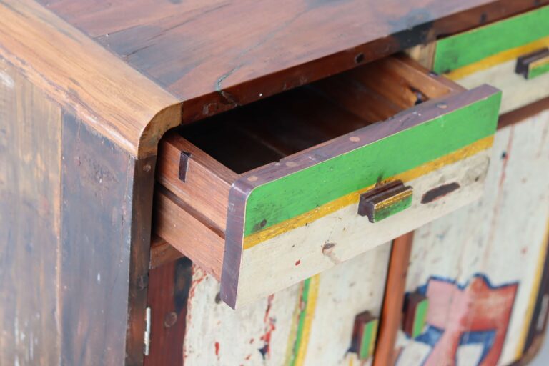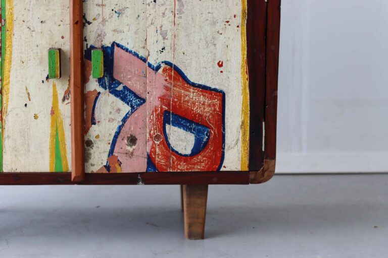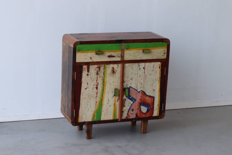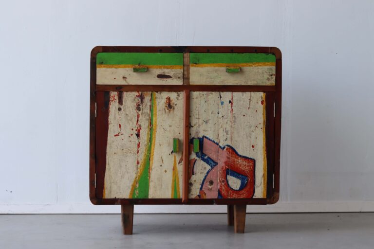 De vissersboten in Indonesië zijn vaak jarenlang blootgesteld aan de zee en hebben door de vele lagen verf unieke kleurenpatronen gekregen. Namen van boten of families zijn soms nog zichtbaar, wat elk meubel een stukje geschiedenis meegeeft. Door het hergebruik van dit hout dragen we bij aan een duurzamere omgang met grondstoffen, zonder concessies te doen aan stijl of kwaliteit.