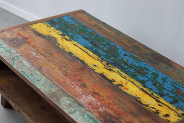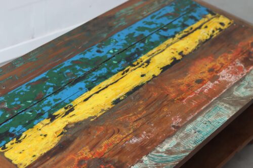 Deze retro salontafel is handgemaakt van oud boothout dat jarenlang de zeeën rond Bali trotseerde. De kleurrijke verflagen zijn laag op laag ontstaan door tientallen jaren onderhoud, gebruik en zon. Ze werden niet bedacht, ze zijn ontstaan. Van okergeel tot oceaanblauw, van verweerd rood tot vergrijsd hout: elk kleurvlak heeft een eigen verleden, zichtbaar in de nerven en verweerde texturen.
