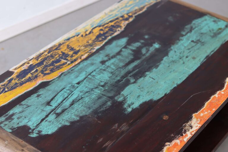 De vissersboten in Indonesië zijn vaak jarenlang blootgesteld aan de zee en hebben door de vele lagen verf unieke kleurenpatronen gekregen. Namen van boten of families zijn soms nog zichtbaar, wat elk meubel een stukje geschiedenis meegeeft. Door het hergebruik van dit hout dragen we bij aan een duurzamere omgang met grondstoffen, zonder concessies te doen aan stijl of kwaliteit.
