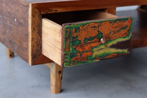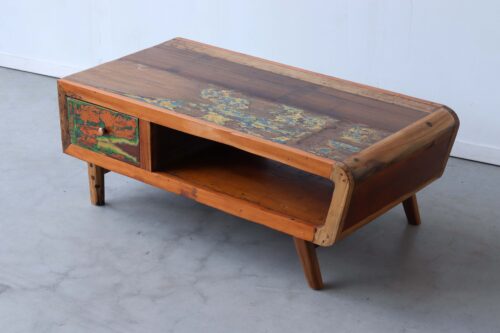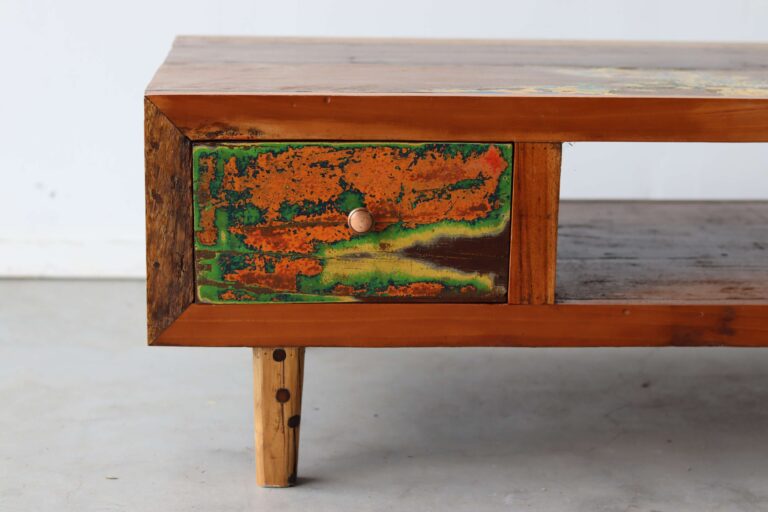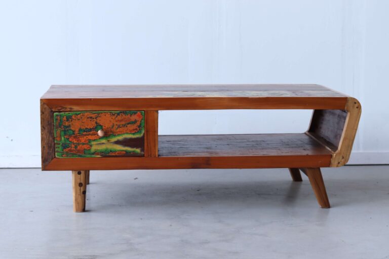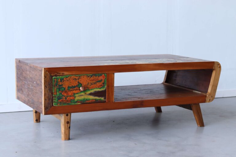 Deze salontafel van 110×55×45 cm is geen doorsnee meubelstuk, maar een tafel met een verhaal. Gemaakt van gerecycled boothout uit Indonesië, afkomstig van oude vissersbootjes die jarenlang de zeeën hebben getrotseerd. Door zon, zout en water heeft het hout zijn unieke kleur en karakter gekregen. Nu krijgt het een tweede leven in jouw woonkamer, in de vorm van een stijlvolle en praktische salontafel.