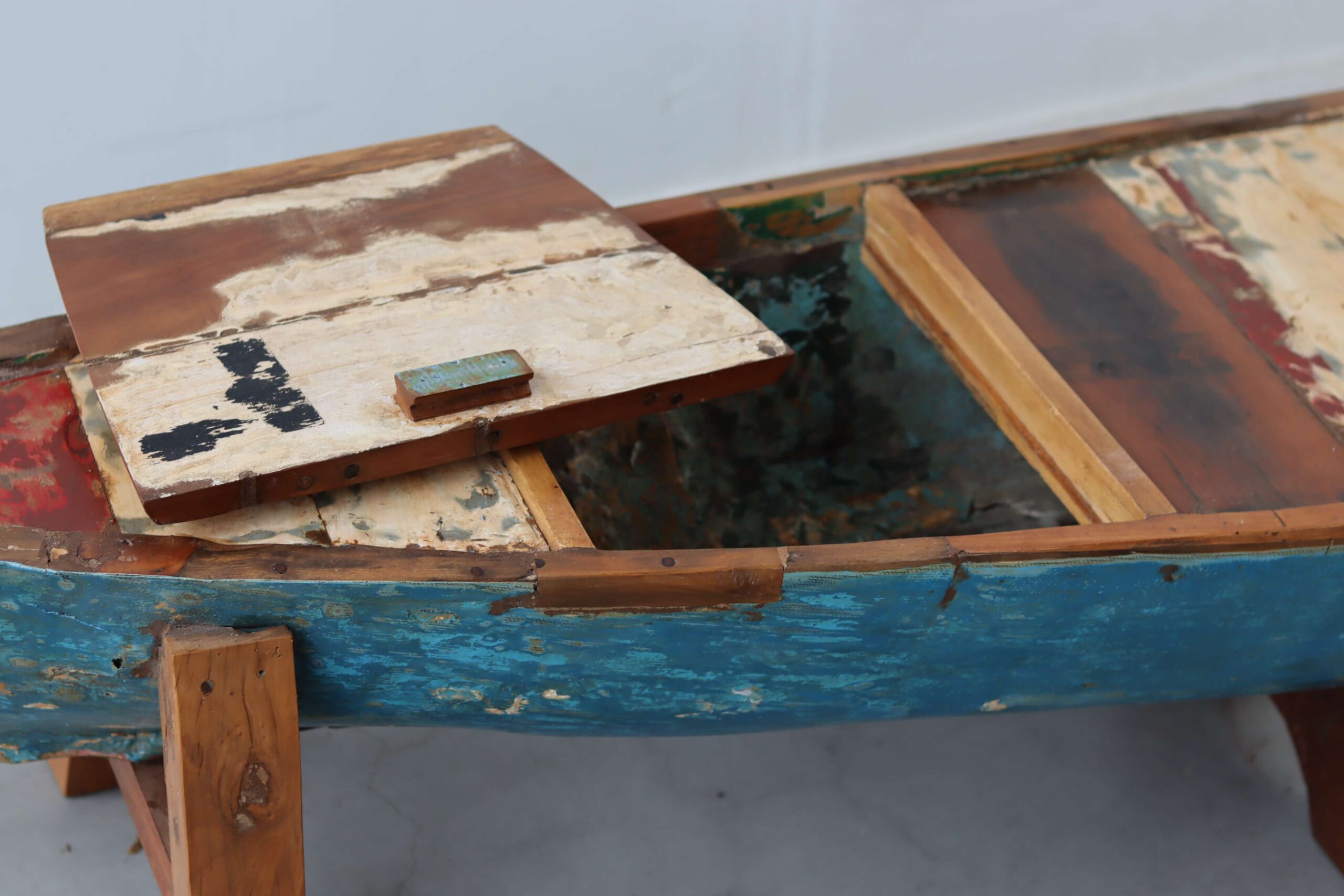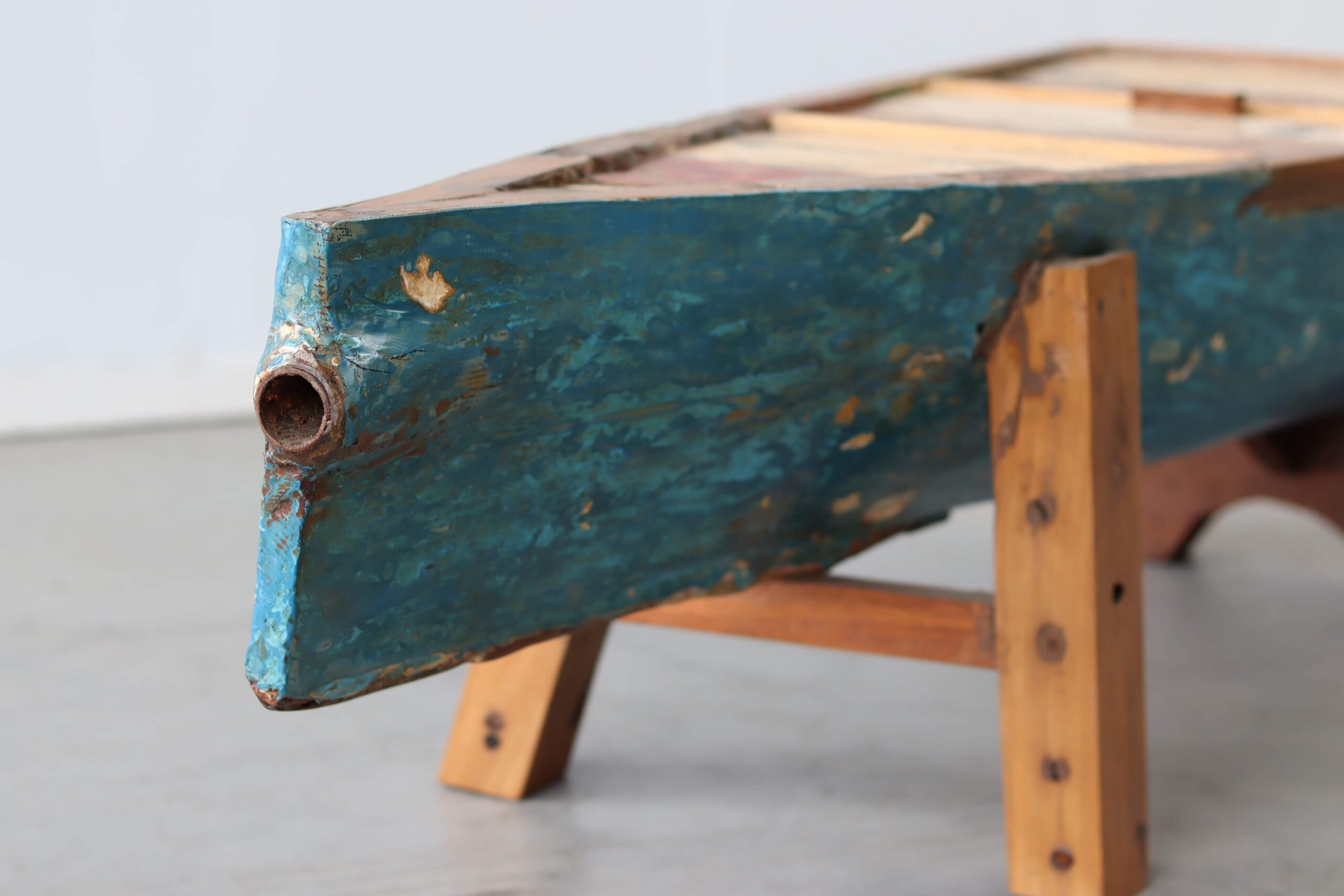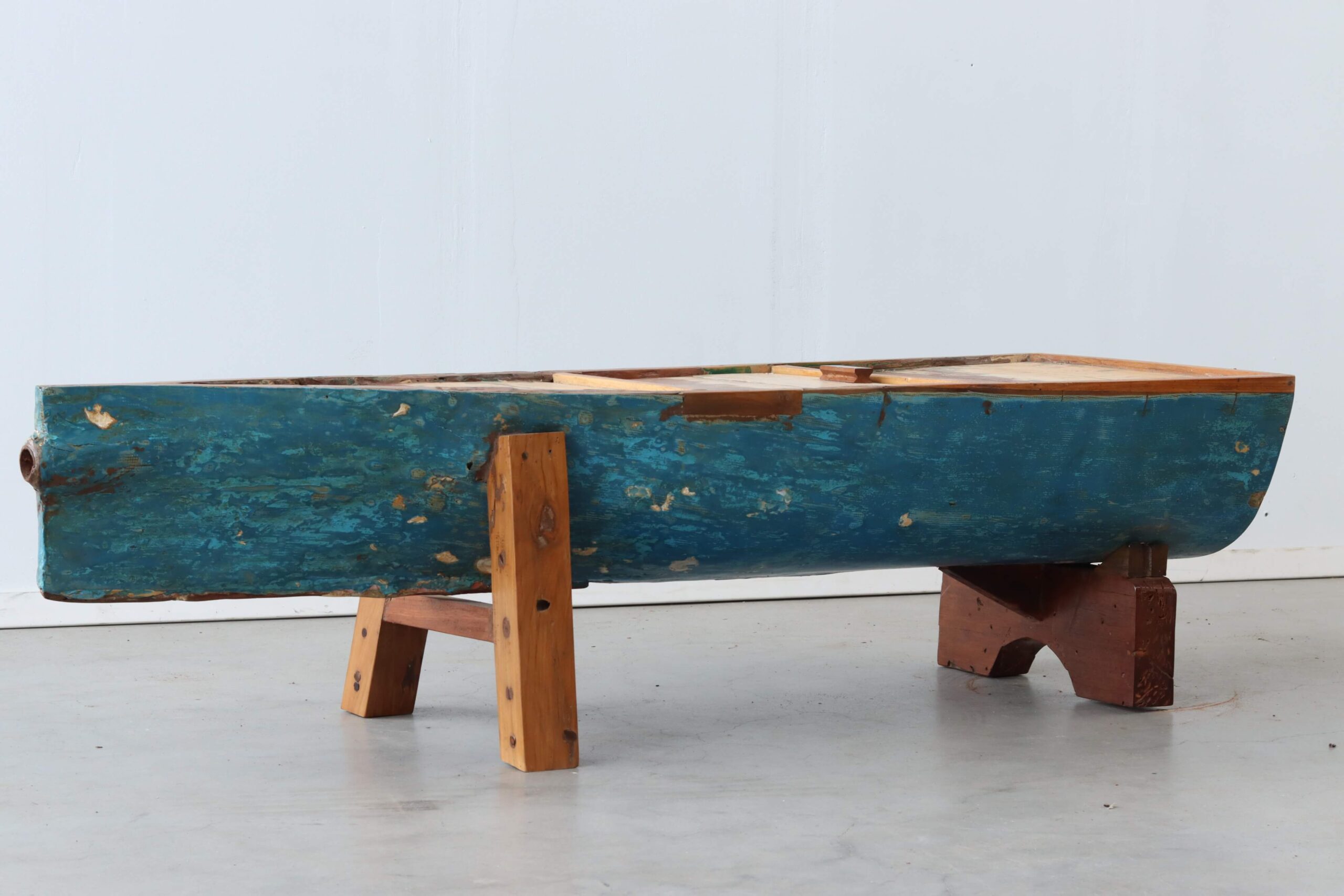 Een oorspronkelijk stukje vissersboot nu als unieke salontafel. Na jaren op de Indische Oceaan gedobberd te hebben, nu als uniek meubelstuk in jouw huiskamer.