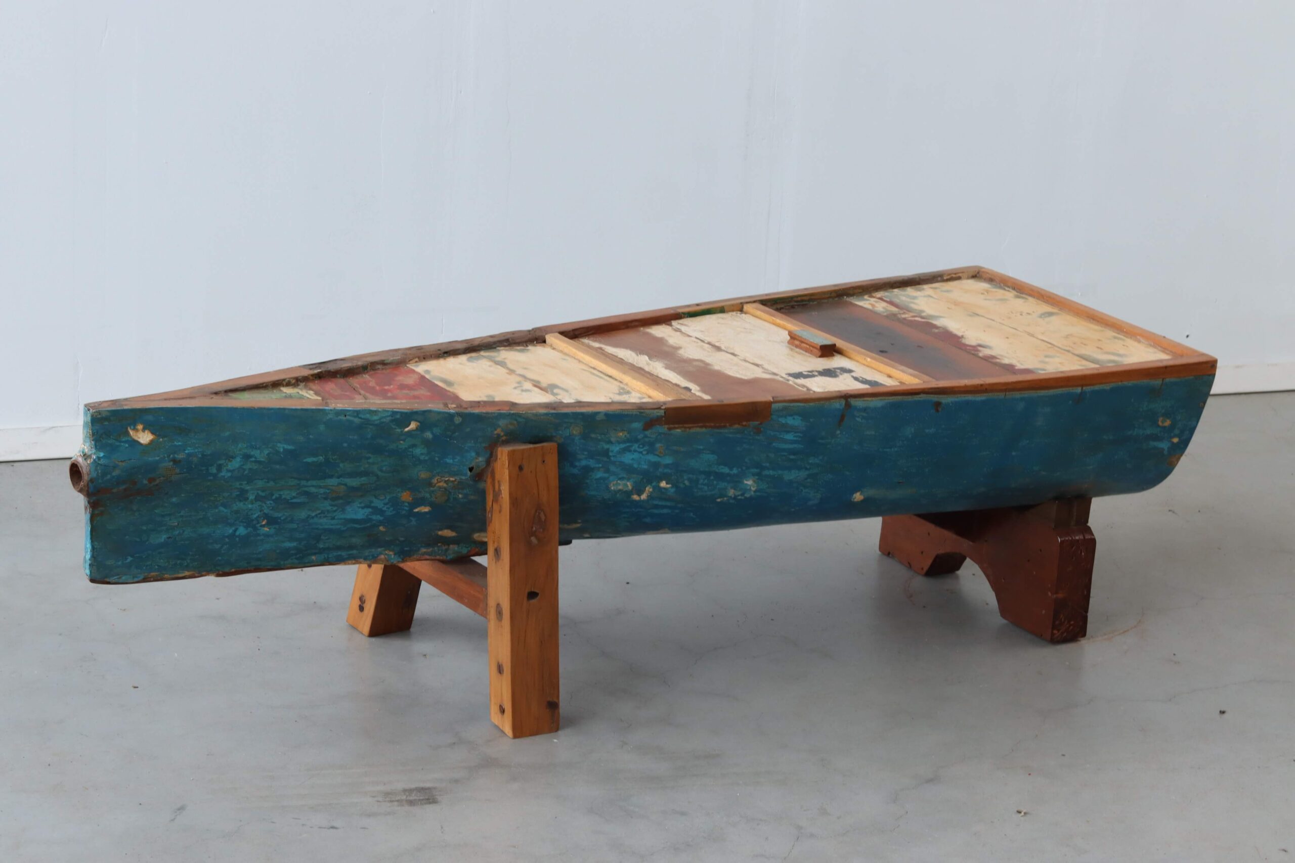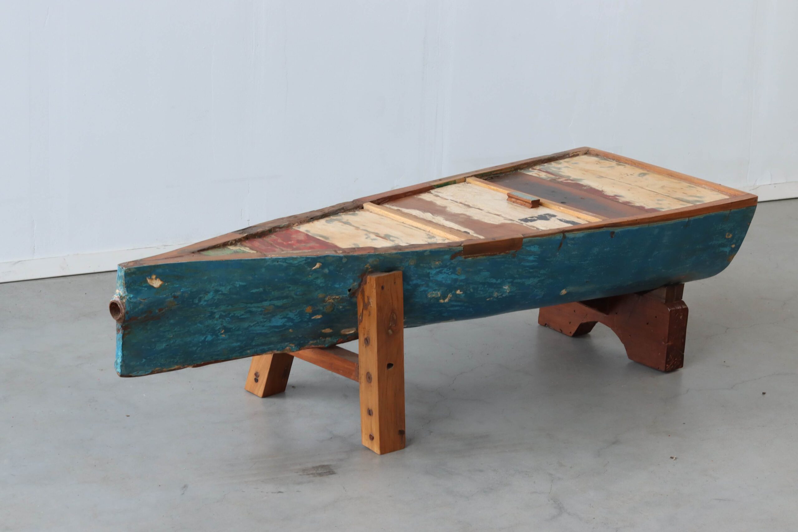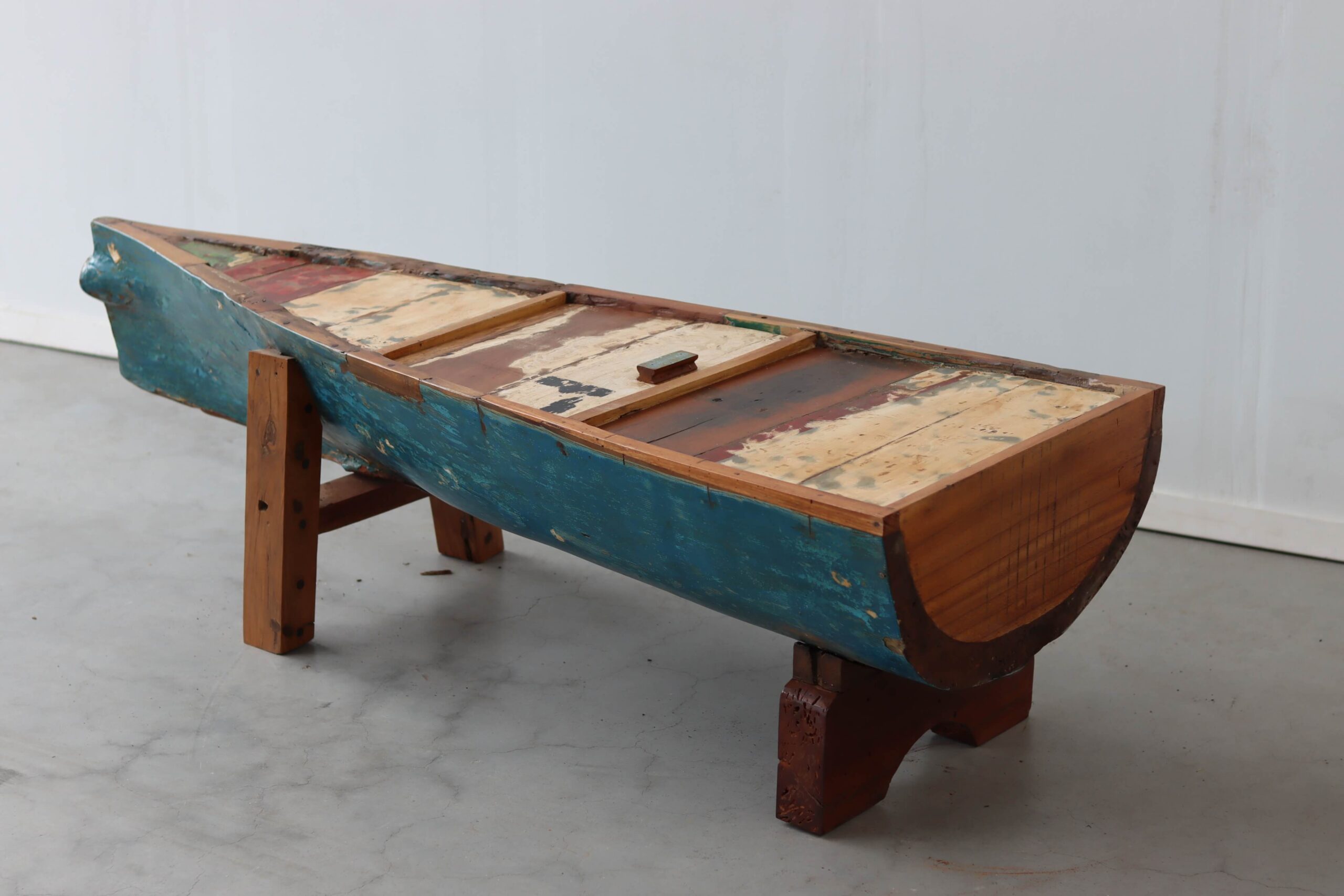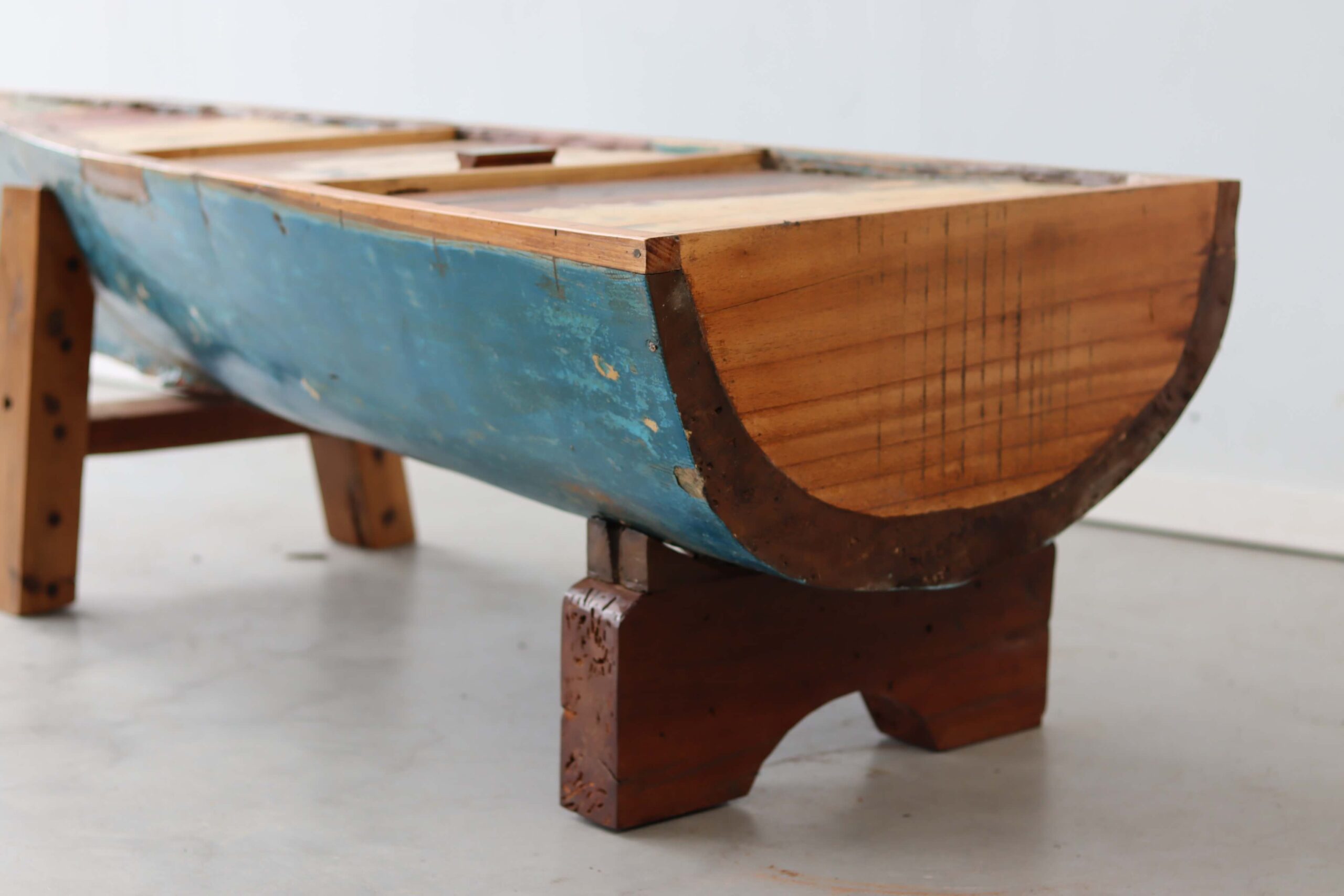 Een oorspronkelijk stukje vissersboot nu als unieke salontafel. Na jaren op de Indische Oceaan gedobberd te hebben, nu als uniek meubelstuk in jouw huiskamer.