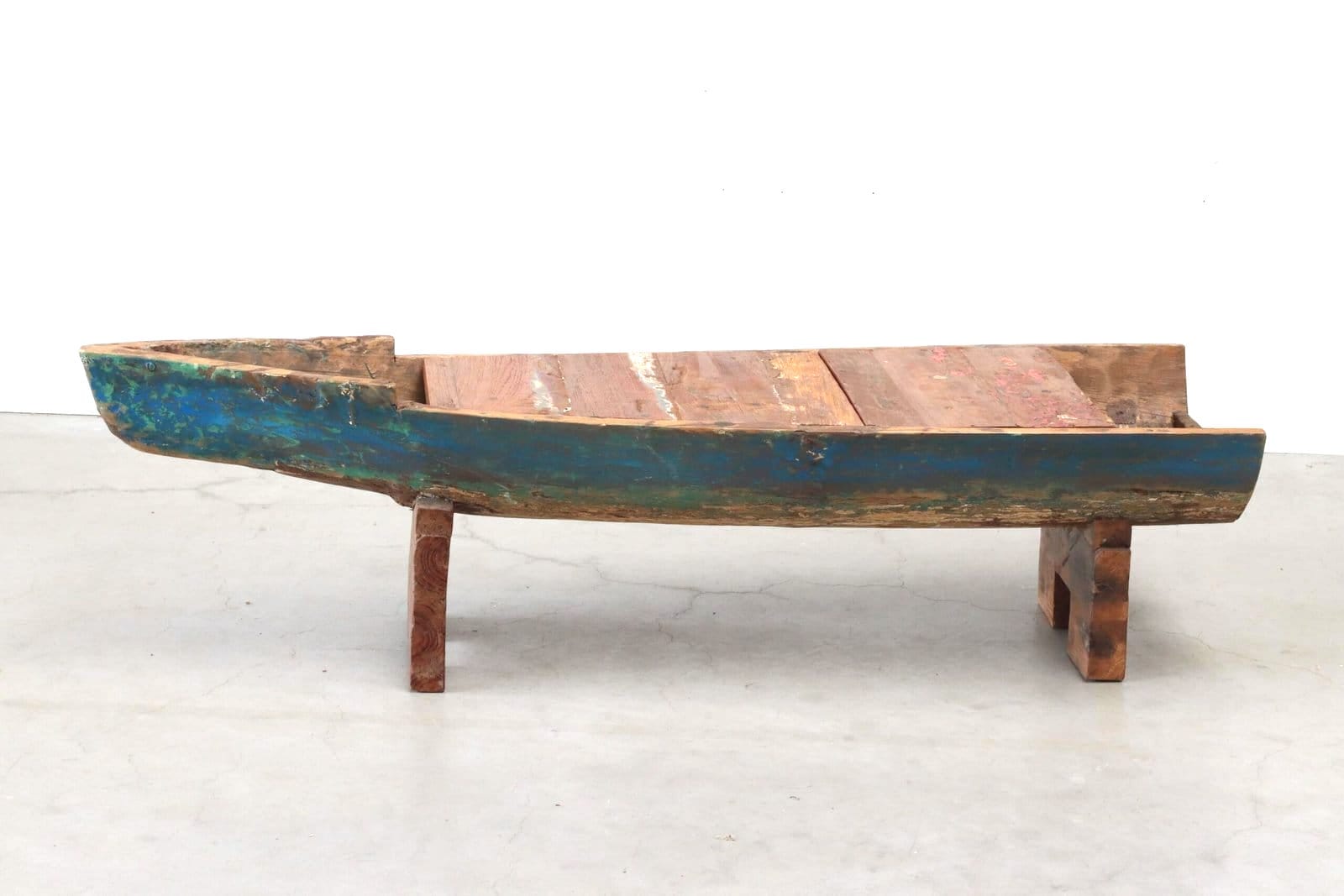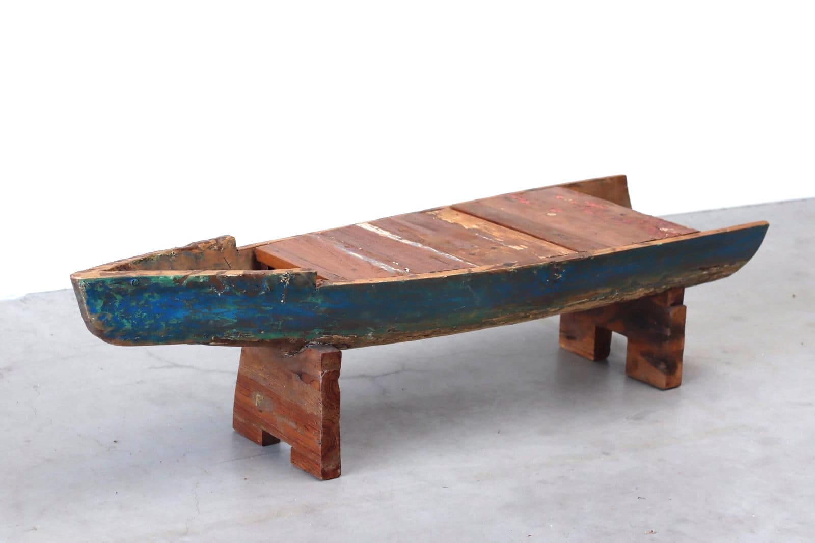 Een oorspronkelijk stukje vissersboot nu als unieke salontafel. Na jaren op de Indische Oceaan gedobberd te hebben, nu als uniek meubelstuk in jouw huiskamer.