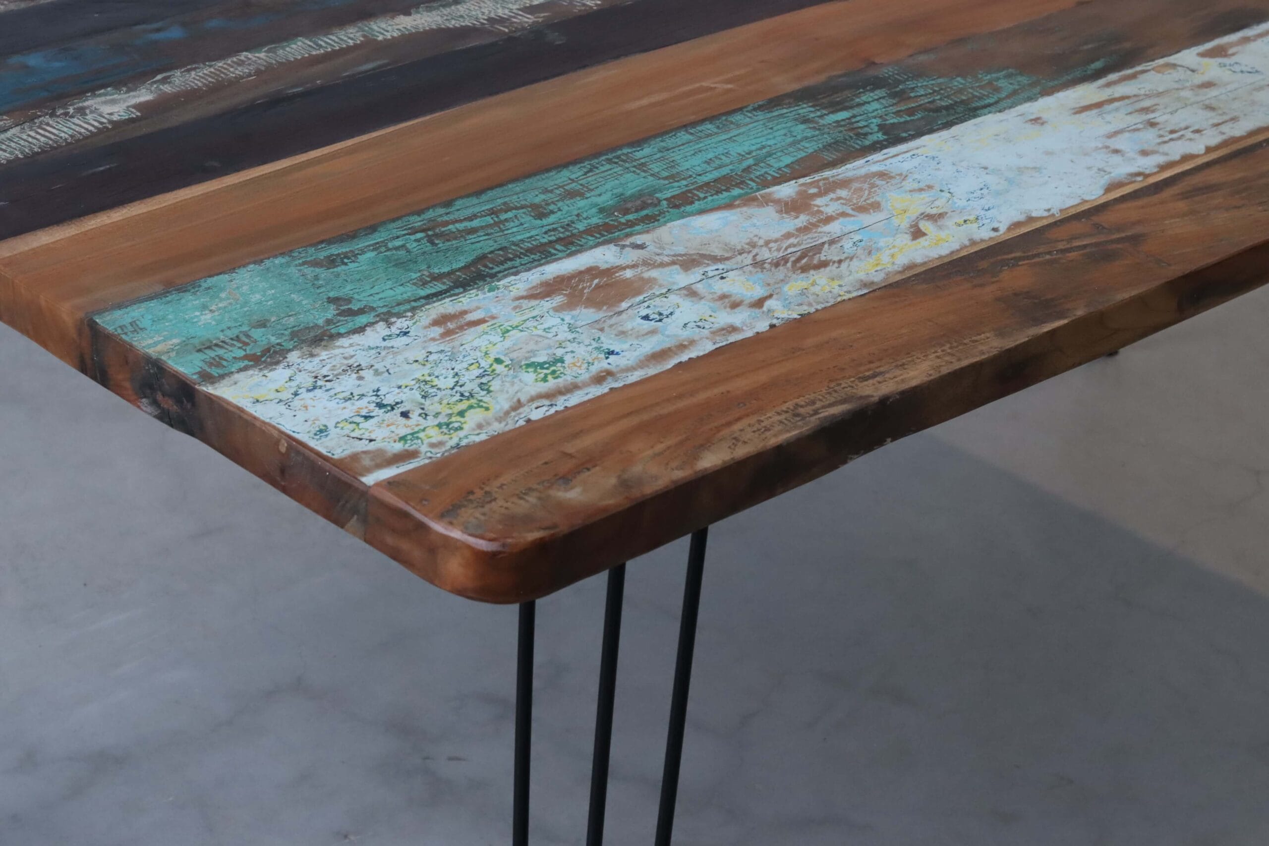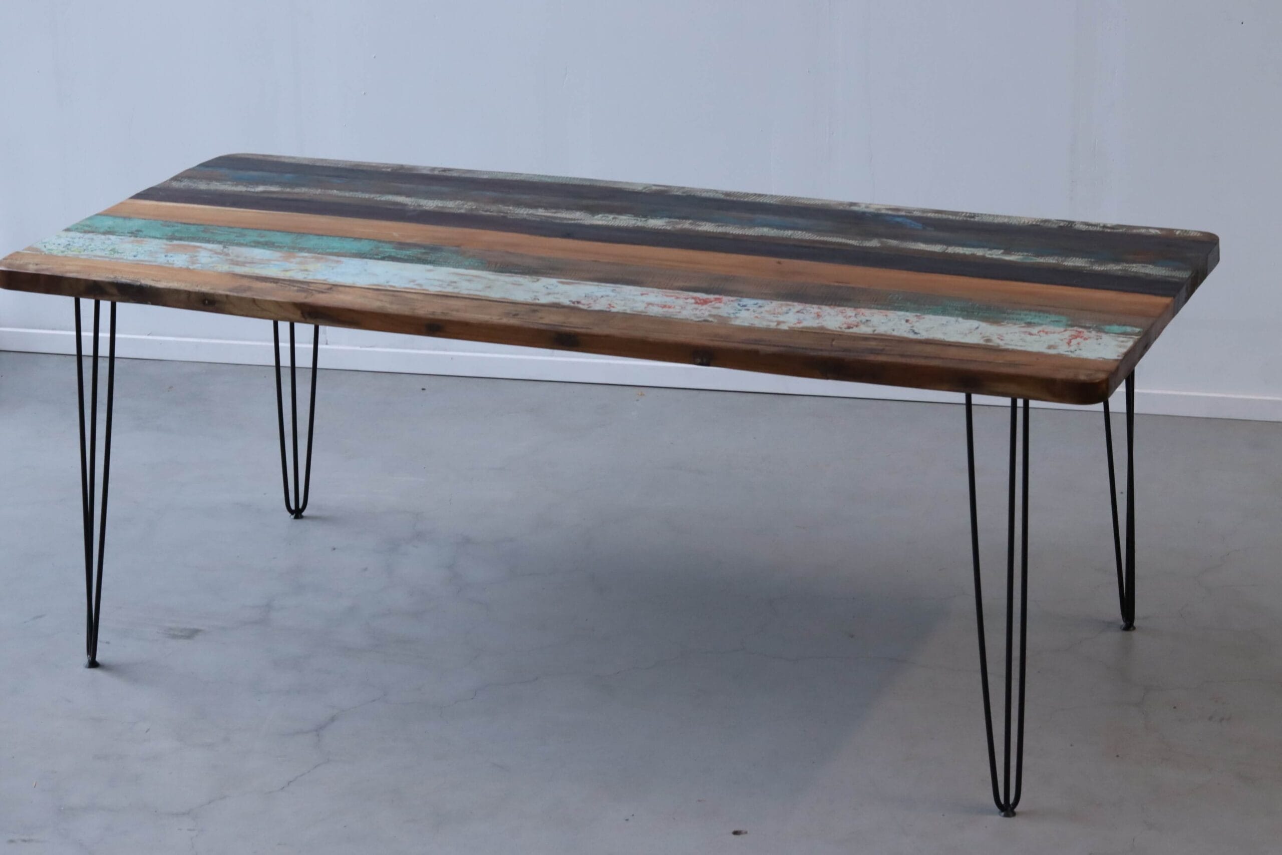 De vissersboten in Indonesië zijn vaak jarenlang blootgesteld aan de zee en hebben door de vele lagen verf unieke kleurenpatronen gekregen. Namen van boten of families zijn soms nog zichtbaar, wat elk meubel een stukje geschiedenis meegeeft. Door het hergebruik van dit hout dragen we bij aan een duurzamere omgang met grondstoffen, zonder concessies te doen aan stijl of kwaliteit.