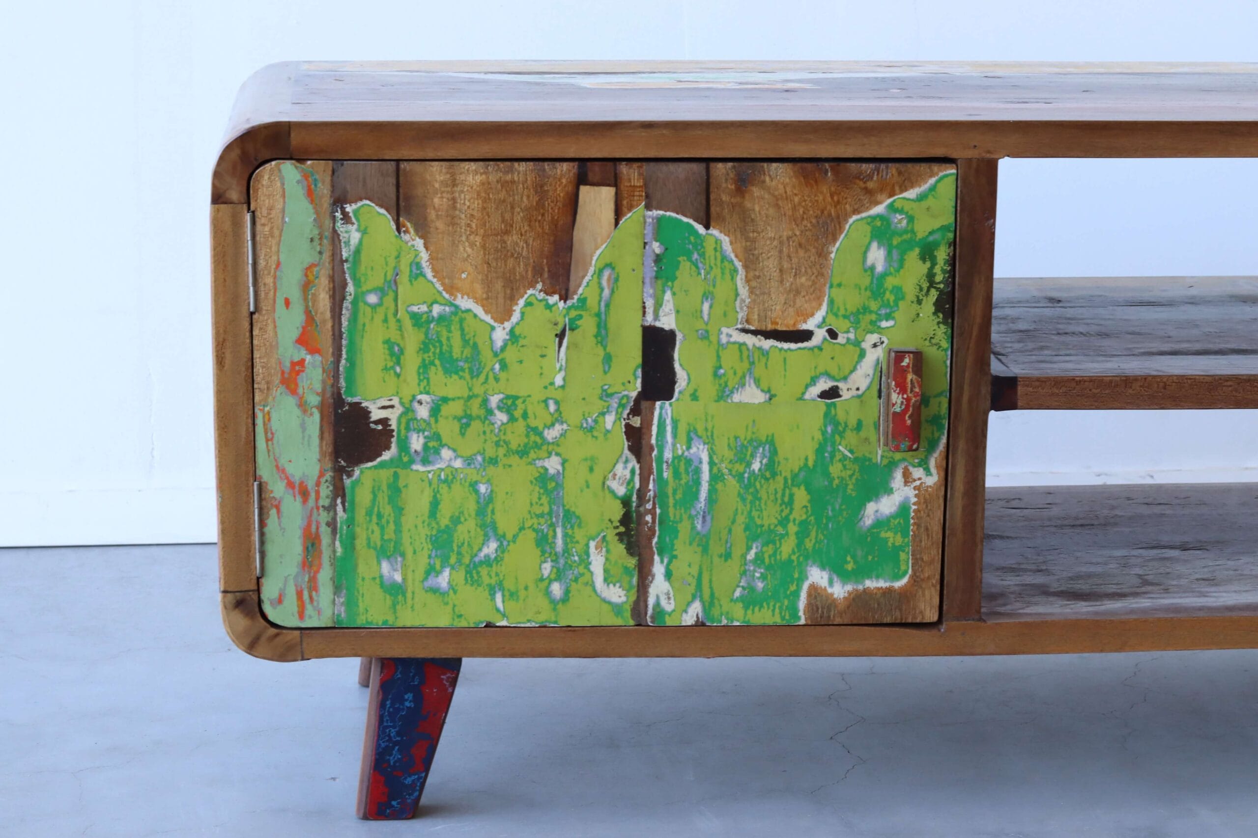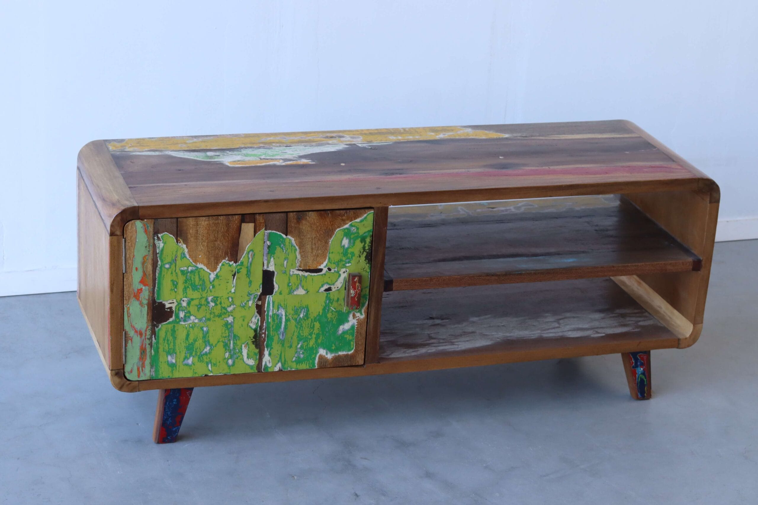 Het hout voor dit TV meubel 125 cm komt van oude vissersboten die jarenlang langs Indonesische stranden lagen. Juist daar kregen de boten hun kenmerkende kleuren. Door zon, zout water en intensief gebruik zijn verf- en kleurresten in lagen opgebouwd. Die rauwe combinatie van tinten is niet aangebracht, maar ontstaan. Dat maakt dit meubel levendig, energiek en volledig authentiek.
