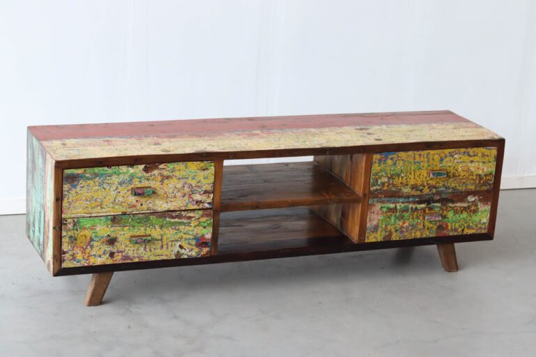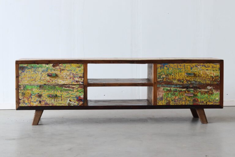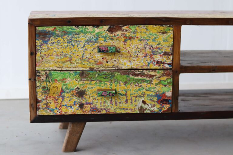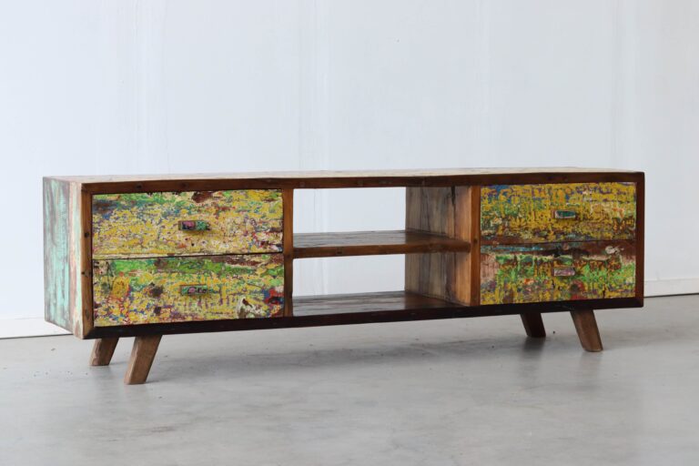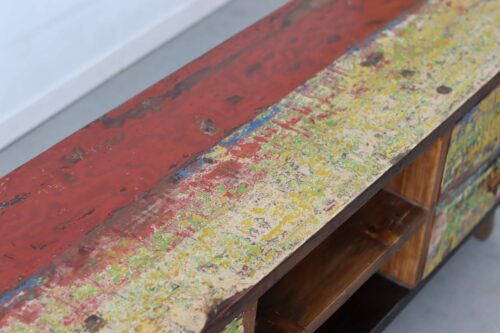Kleurrijk, duurzaam, authentiek en op en top design. Het TV meubel Ambon behoort duidelijk niet tot de standaard meubels. Dit meubel is met de hand gemaakt op Bali van hout van oude vissersbootjes.