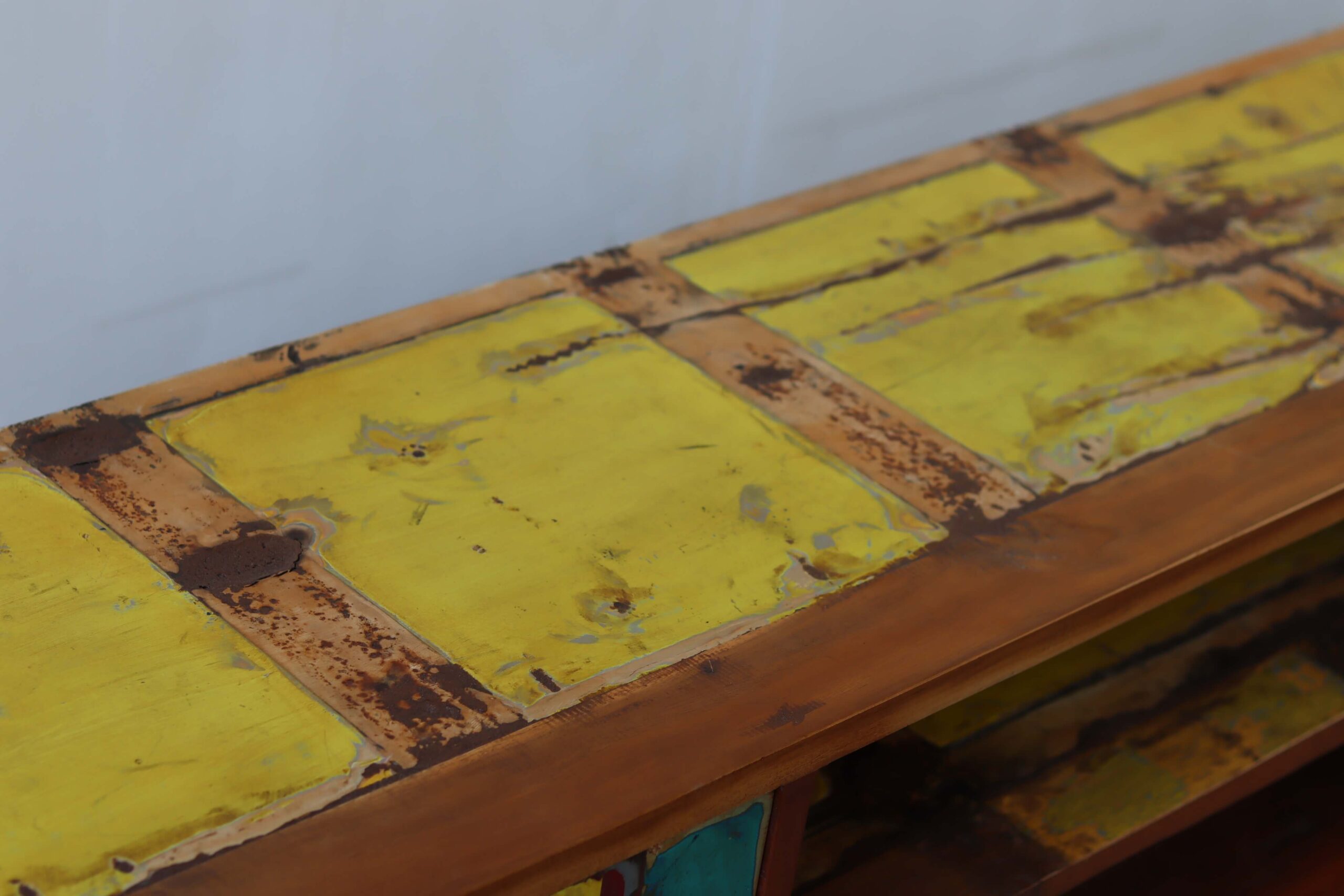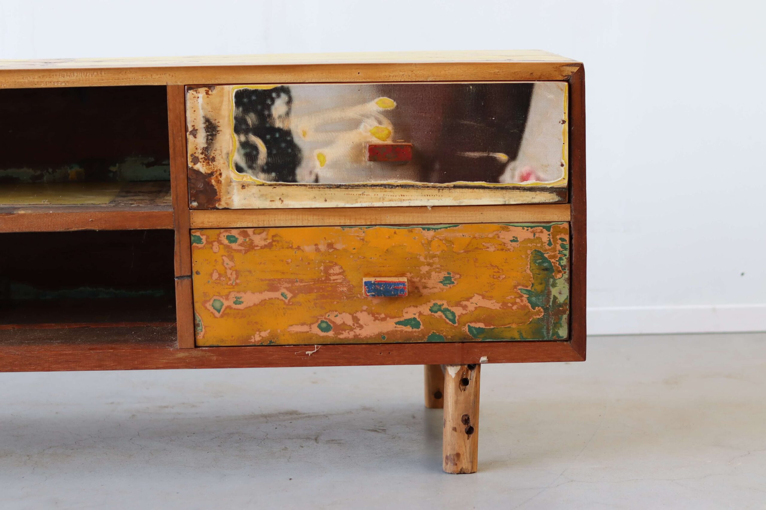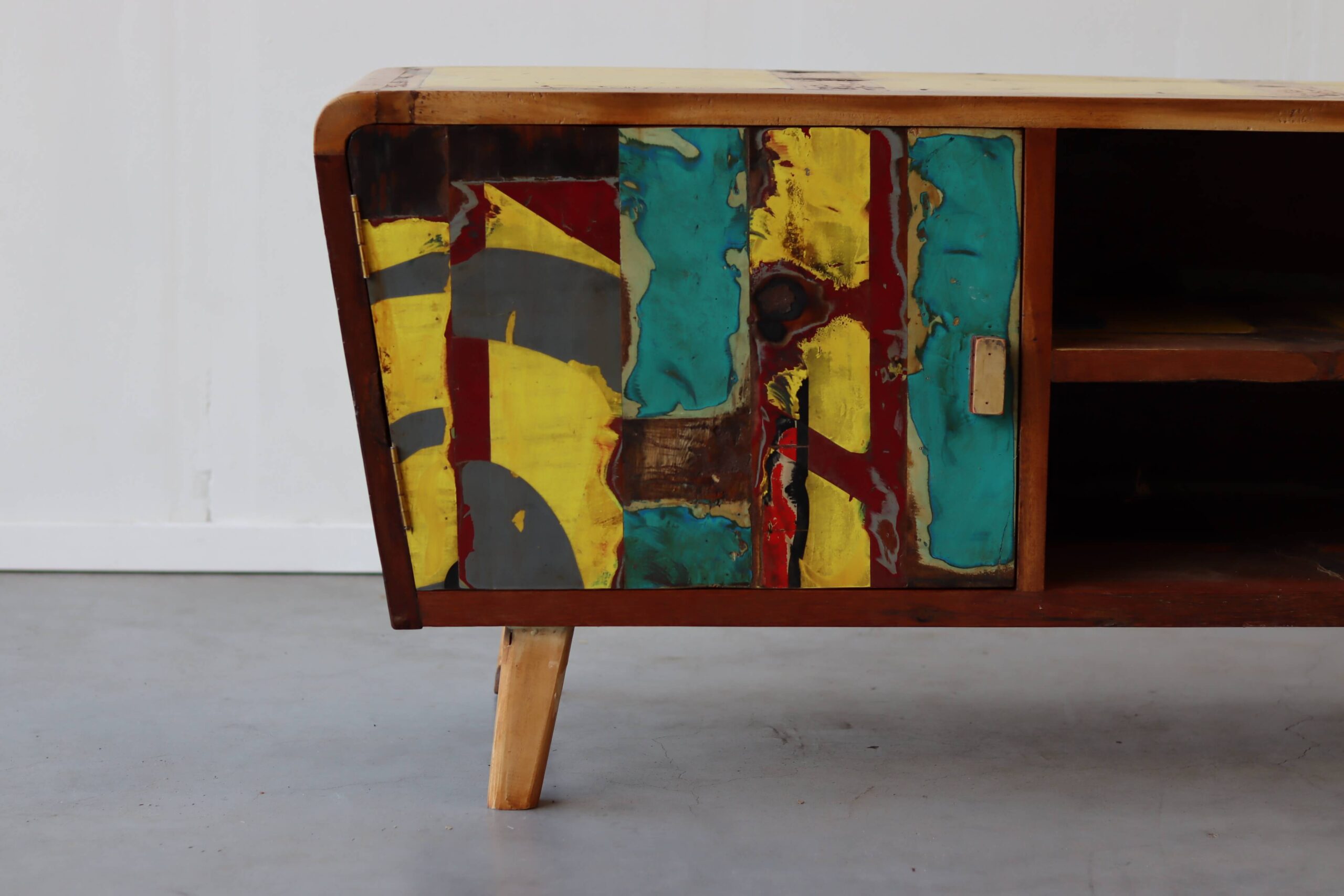 De vissersboten in Indonesië zijn vaak jarenlang blootgesteld aan de zee en hebben door de vele lagen verf unieke kleurenpatronen gekregen. Namen van boten of families zijn soms nog zichtbaar, wat elk meubel een stukje geschiedenis meegeeft. Door het hergebruik van dit hout dragen we bij aan een duurzamere omgang met grondstoffen, zonder concessies te doen aan stijl of kwaliteit.