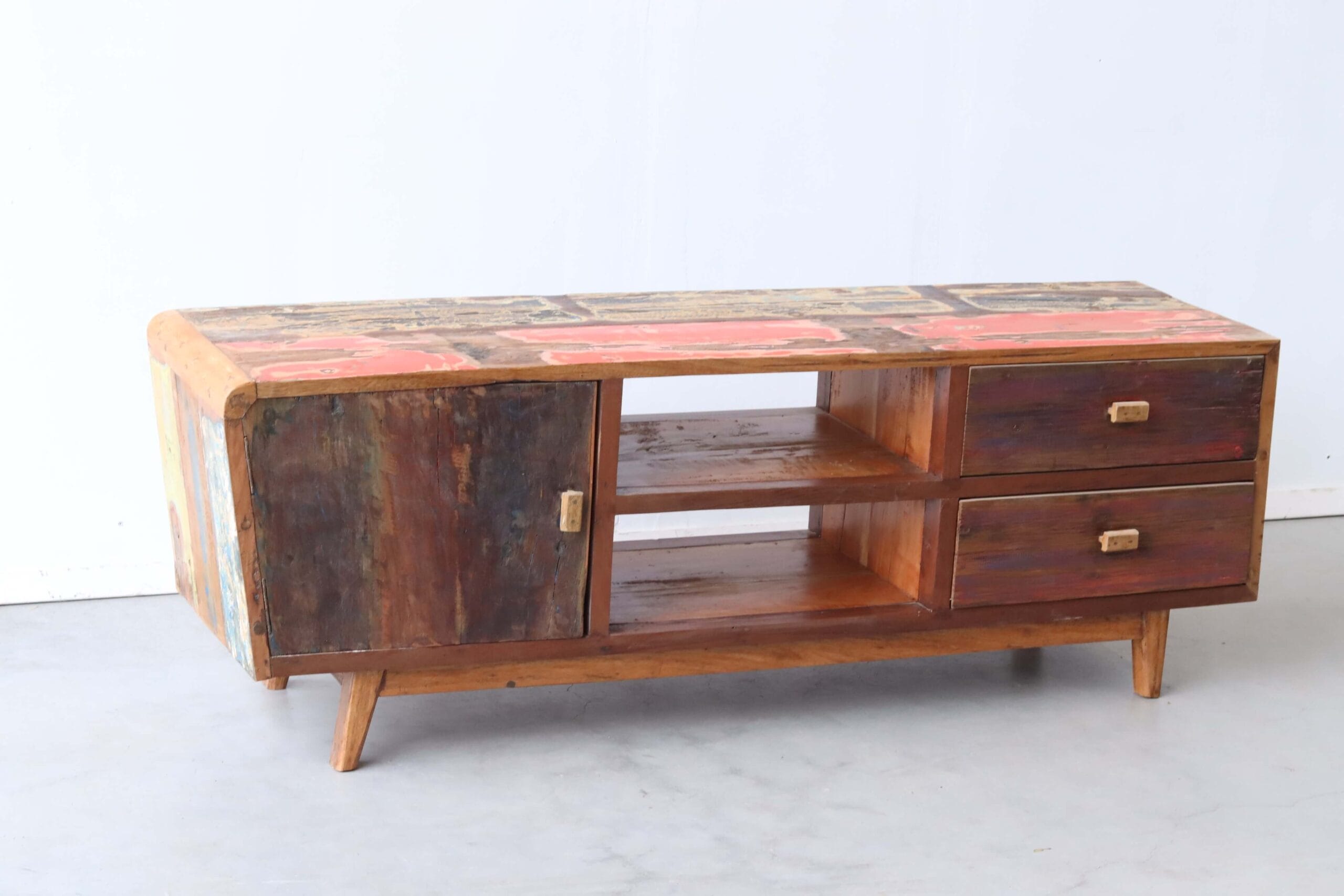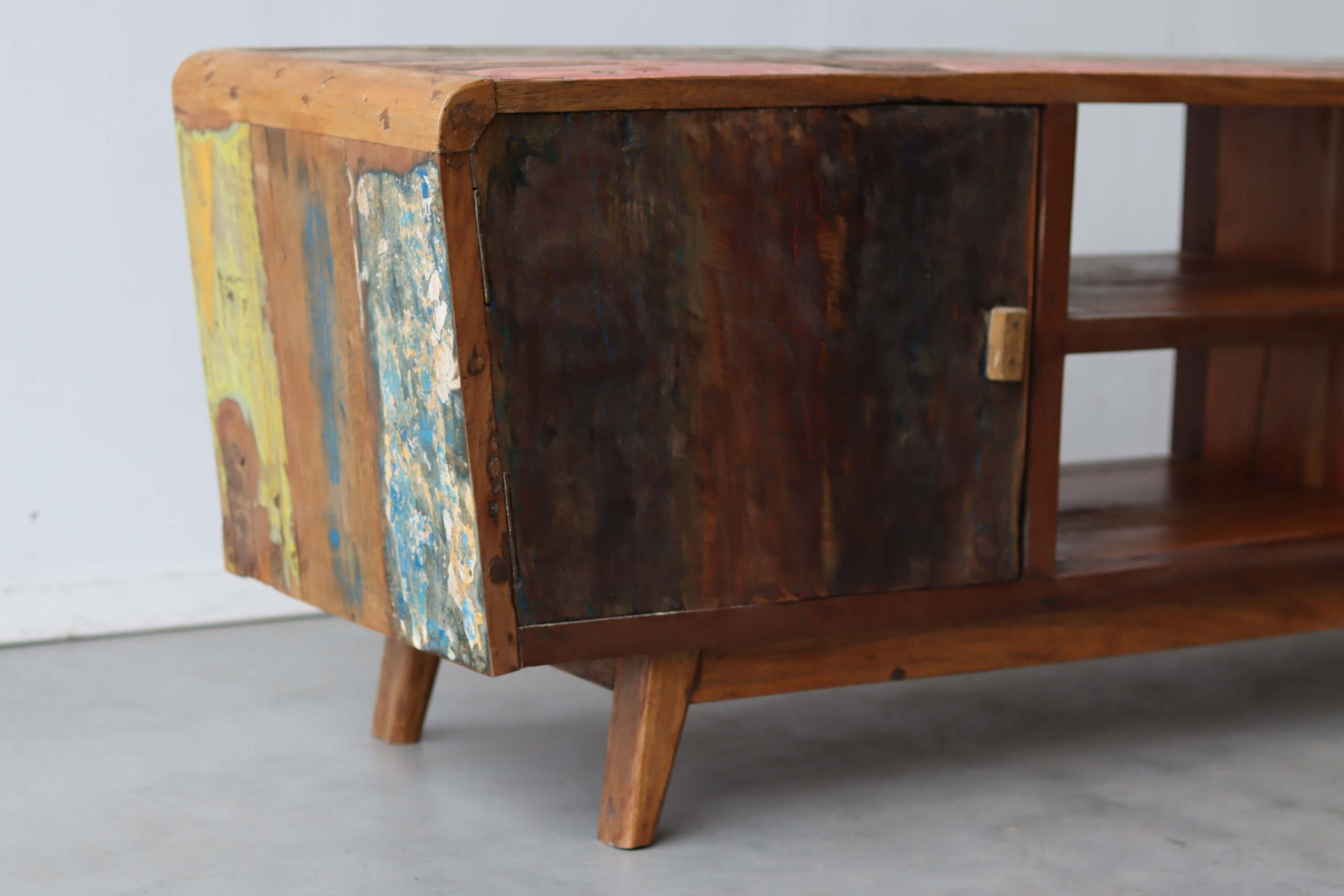 Dit TV meubel is gemaakt van hout dat ooit onderdeel was van kleurrijke vissersbootjes op Bali en Java. In dit Bali naturel-model zijn de meeste verflagen bewust weggeschuurd, waardoor een rustig en tijdloos meubel overblijft. De subtiele sporen van oude kleuren geven het hout nog steeds karakter, maar zonder te overheersen. Zo ontstaat een warm en naturel geheel dat past in vrijwel elk interieur – van boho tot modern Scandinavisch.