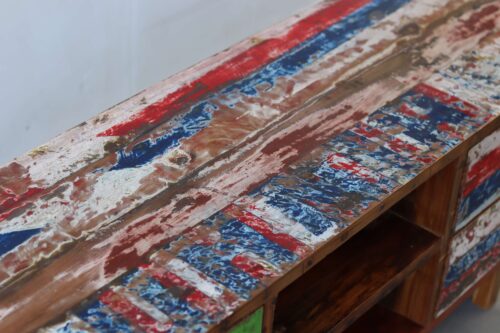 De vissersboten in Indonesië zijn vaak jarenlang blootgesteld aan de zee en hebben door de vele lagen verf unieke kleurenpatronen gekregen. Namen van boten of families zijn soms nog zichtbaar, wat elk meubel een stukje geschiedenis meegeeft. Door het hergebruik van dit hout dragen we bij aan een duurzamere omgang met grondstoffen, zonder concessies te doen aan stijl of kwaliteit.
