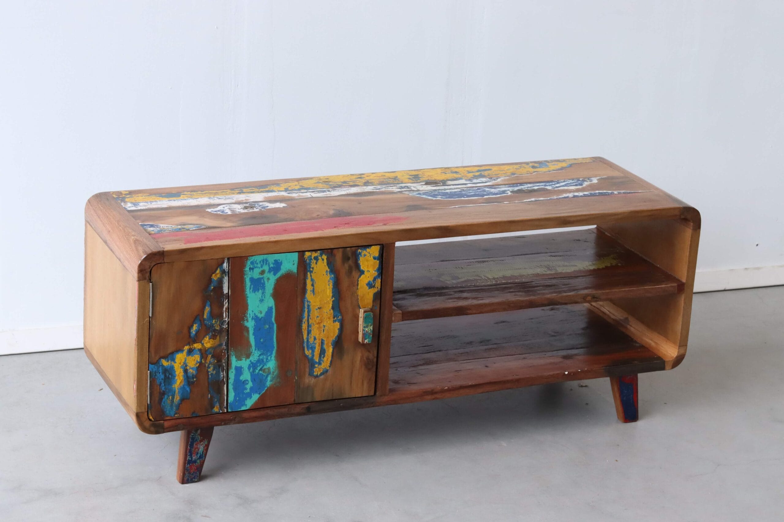Het hout van dit TV meubel heeft jarenlang dienstgedaan op open zee. Oude vissersboten trotseerden wind, water en zout, en juist die omstandigheden hebben hun sporen nagelaten. Je ziet en voelt dat het hout heeft geleefd. Niet gladgestreken of perfect gemaakt, maar puur en eerlijk. Dit meubel maakt deel uit van onze collectie TV meubels van boothout, waarin elk stuk een eigen verleden met zich meebrengt.