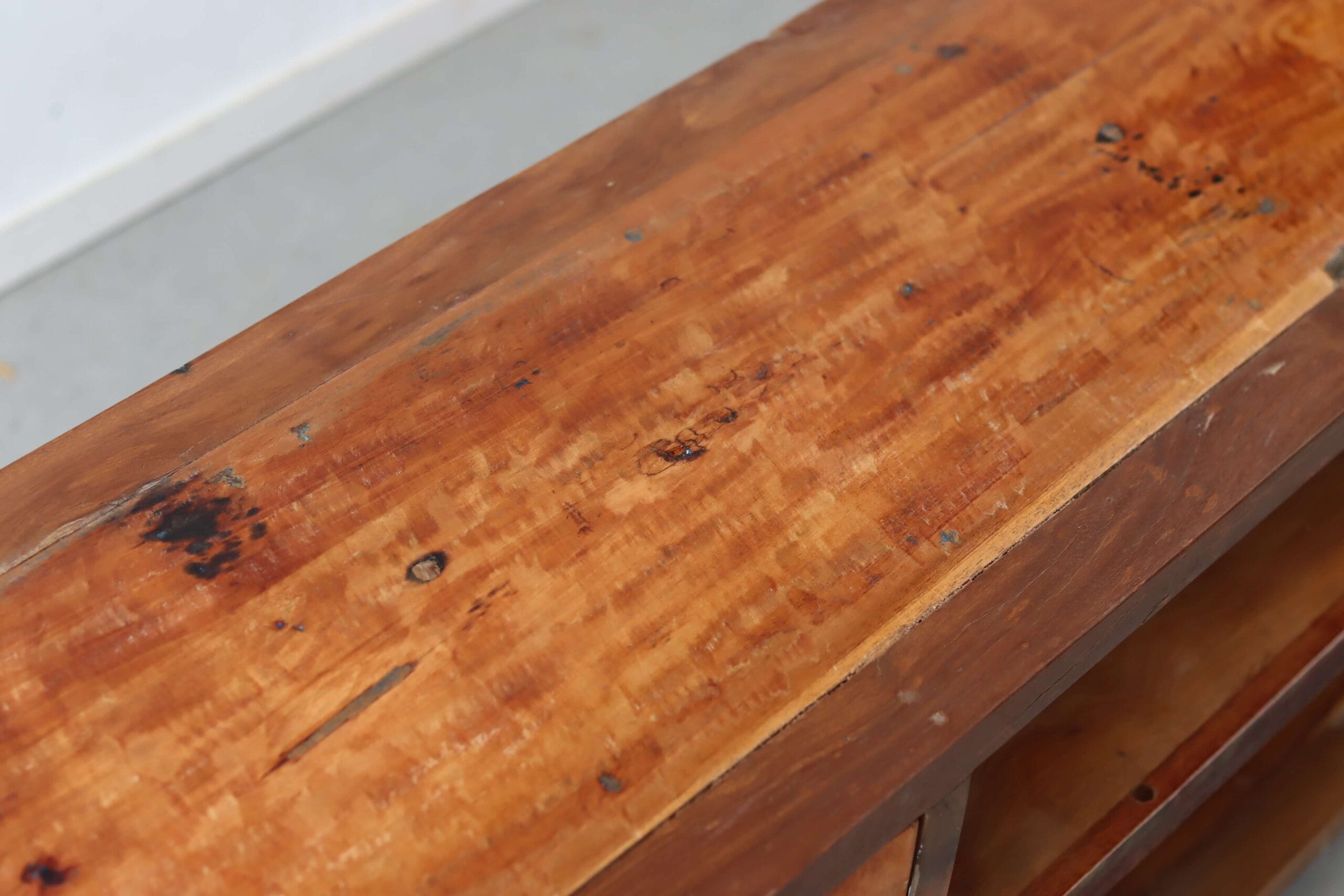 Bij Borneo Naturel draait alles om het materiaal. Het hout komt van oude Indonesische vissersboten en heeft jarenlang op zee geleefd. Dat verleden zie je terug in de nerf, de structuur en de kleine onregelmatigheden. Juist doordat kleur hier geen hoofdrol speelt, krijgt het hout ruimte om zijn eigen verhaal te vertellen. Dat maakt dit TV meubel rustig, puur en tijdloos.