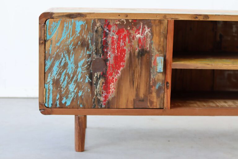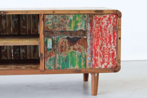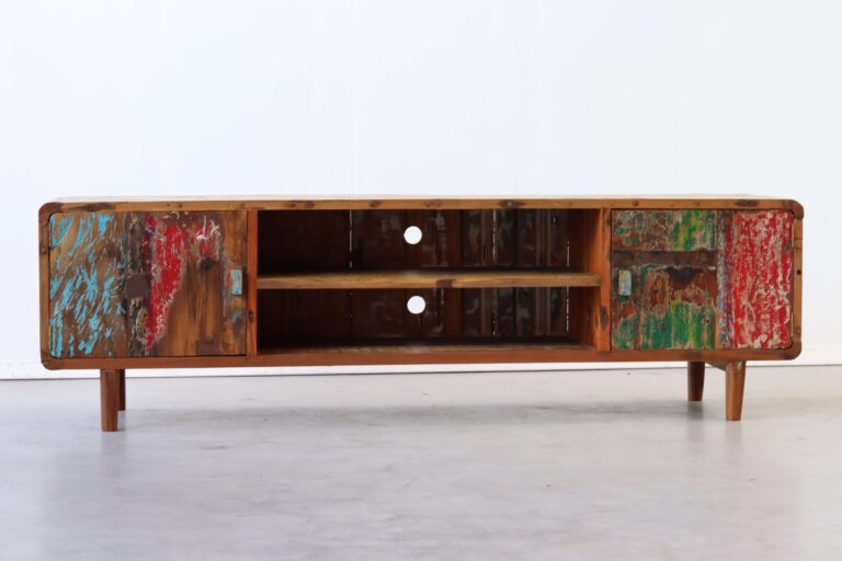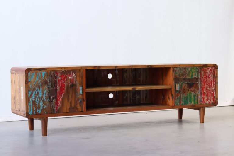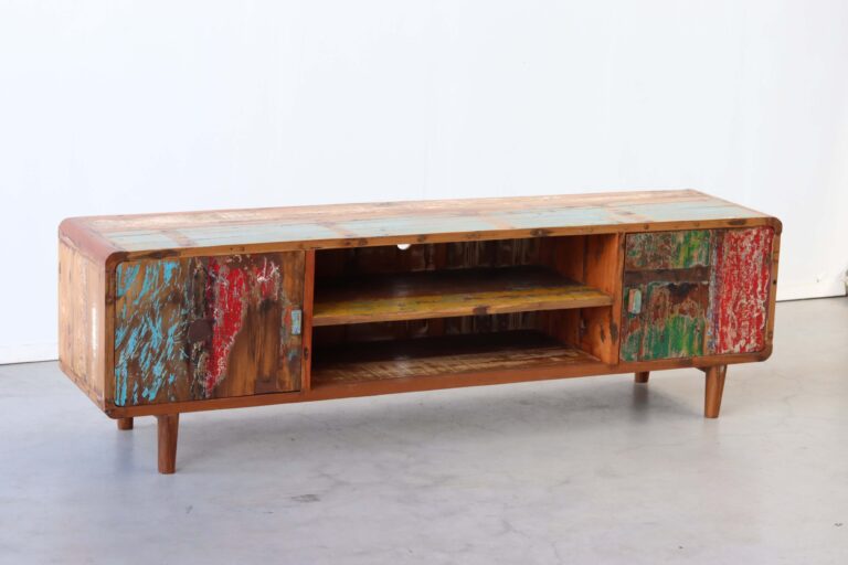 Het TV meubel met deuren Celebes is een echte blikvanger in jouw woonkamer. Dit meubel is handgemaakt van oud vissersboothout uit Indonesië en ademt karakter en authenticiteit. De twee deuren bieden voldoende opbergruimte voor alles wat je uit het zicht wilt bewaren, terwijl de open vakken ruimte bieden voor je apparatuur of decoratie.