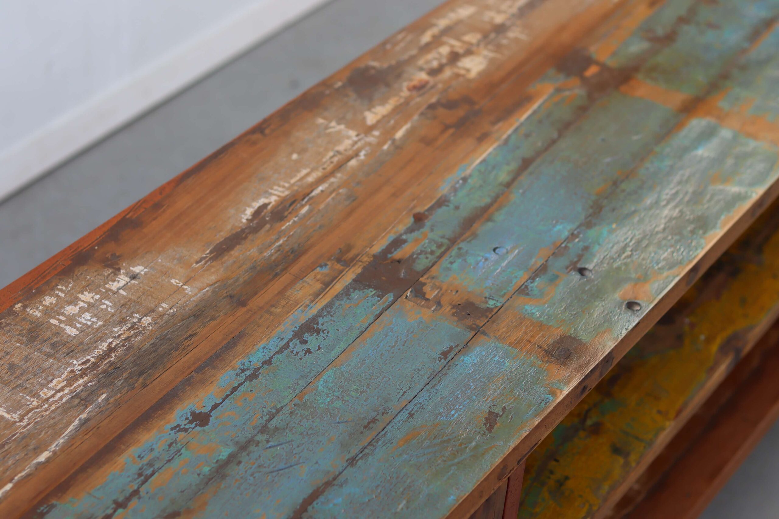 Met zijn royale afmetingen van 200 cm breed, 45 cm diep en 58 cm hoog is dit TV meubel perfect voor grotere woonkamers en geschikt voor televisies tot wel 75 inch. Het doorleefde hout met resten van originele verf vertelt zijn eigen verhaal – geen enkel meubel is hetzelfde, waardoor je altijd een uniek exemplaar in huis haalt.