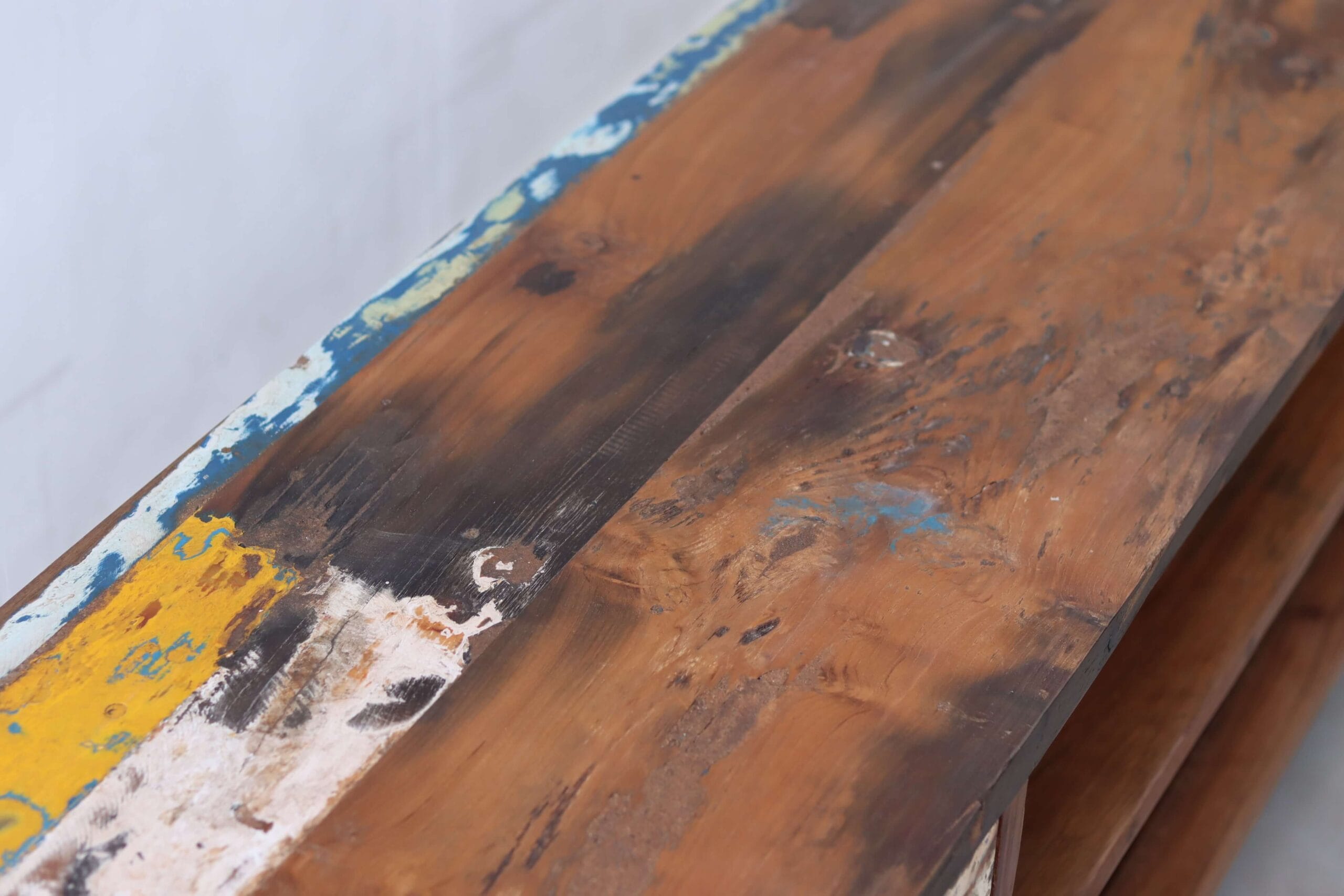 De vissersboten in Indonesië zijn vaak jarenlang blootgesteld aan de zee en hebben door de vele lagen verf unieke kleurenpatronen gekregen. Namen van boten of families zijn soms nog zichtbaar, wat elk meubel een stukje geschiedenis meegeeft. Door het hergebruik van dit hout dragen we bij aan een duurzamere omgang met grondstoffen, zonder concessies te doen aan stijl of kwaliteit.