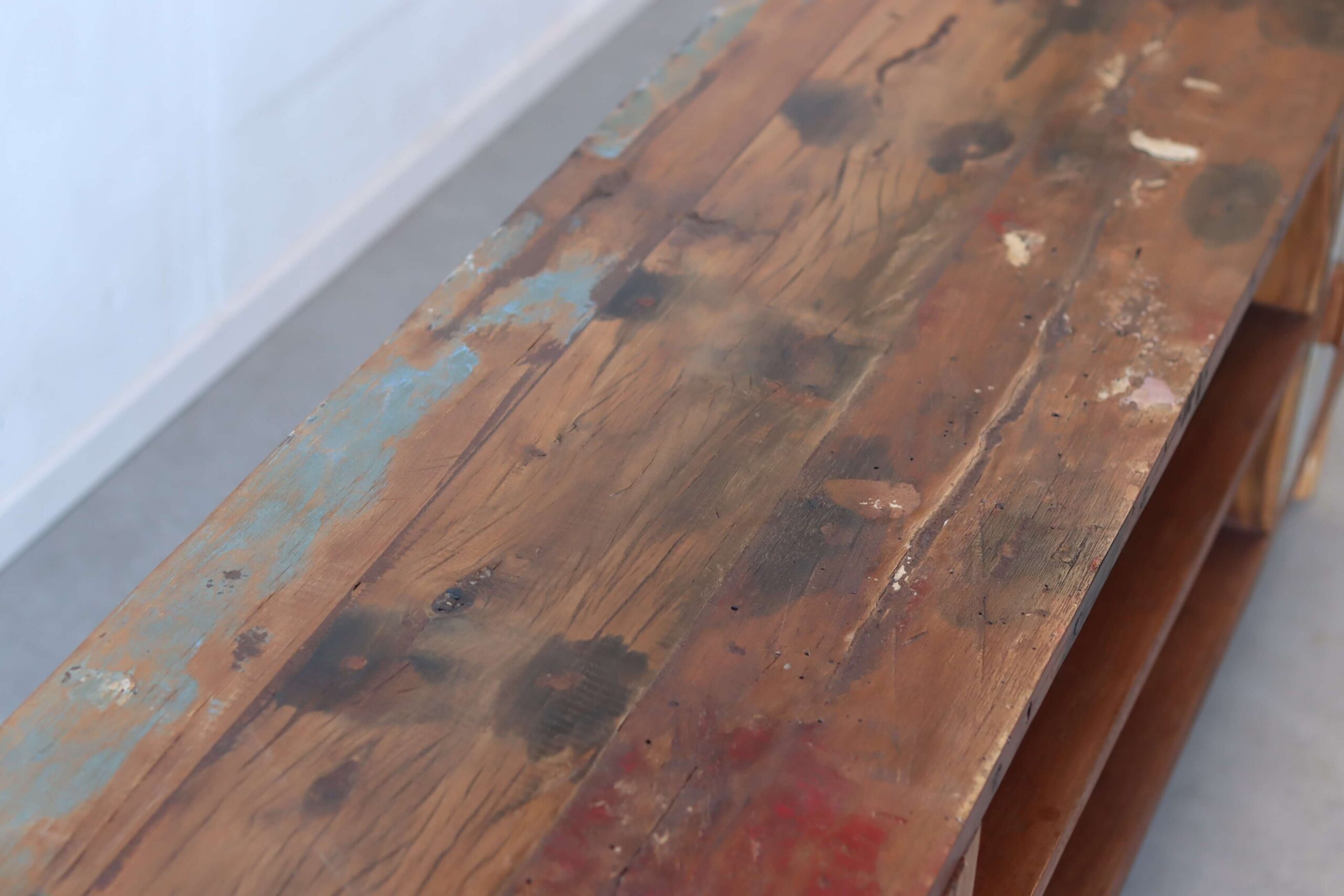 De vissersboten in Indonesië zijn vaak jarenlang blootgesteld aan de zee en hebben door de vele lagen verf unieke kleurenpatronen gekregen. Namen van boten of families zijn soms nog zichtbaar, wat elk meubel een stukje geschiedenis meegeeft. Door het hergebruik van dit hout dragen we bij aan een duurzamere omgang met grondstoffen, zonder concessies te doen aan stijl of kwaliteit.