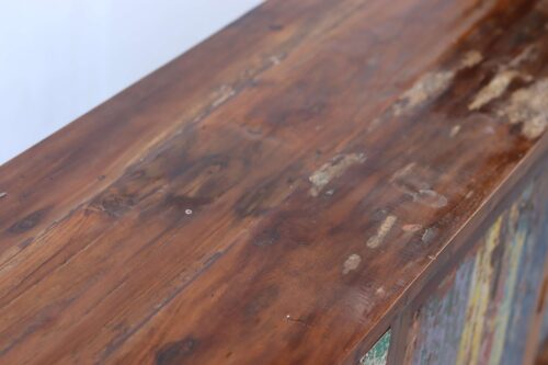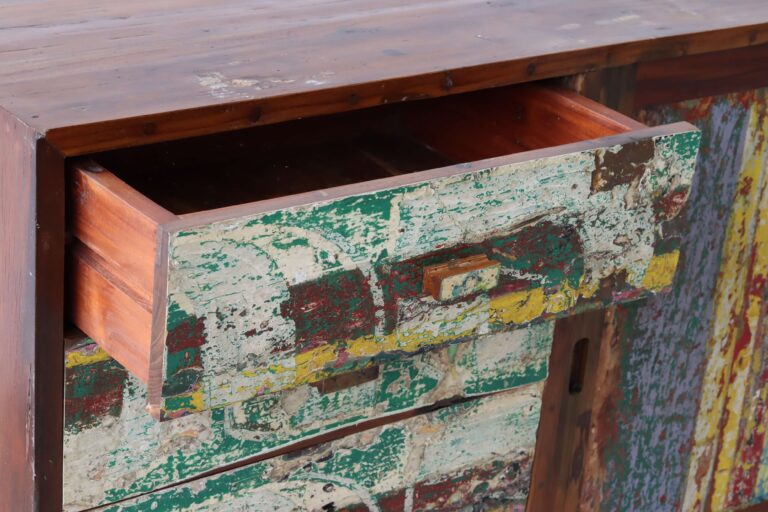 De vissersboten in Indonesië zijn vaak jarenlang blootgesteld aan de zee en hebben door de vele lagen verf unieke kleurenpatronen gekregen. Namen van boten of families zijn soms nog zichtbaar, wat elk meubel een stukje geschiedenis meegeeft. Door het hergebruik van dit hout dragen we bij aan een duurzamere omgang met grondstoffen, zonder concessies te doen aan stijl of kwaliteit.