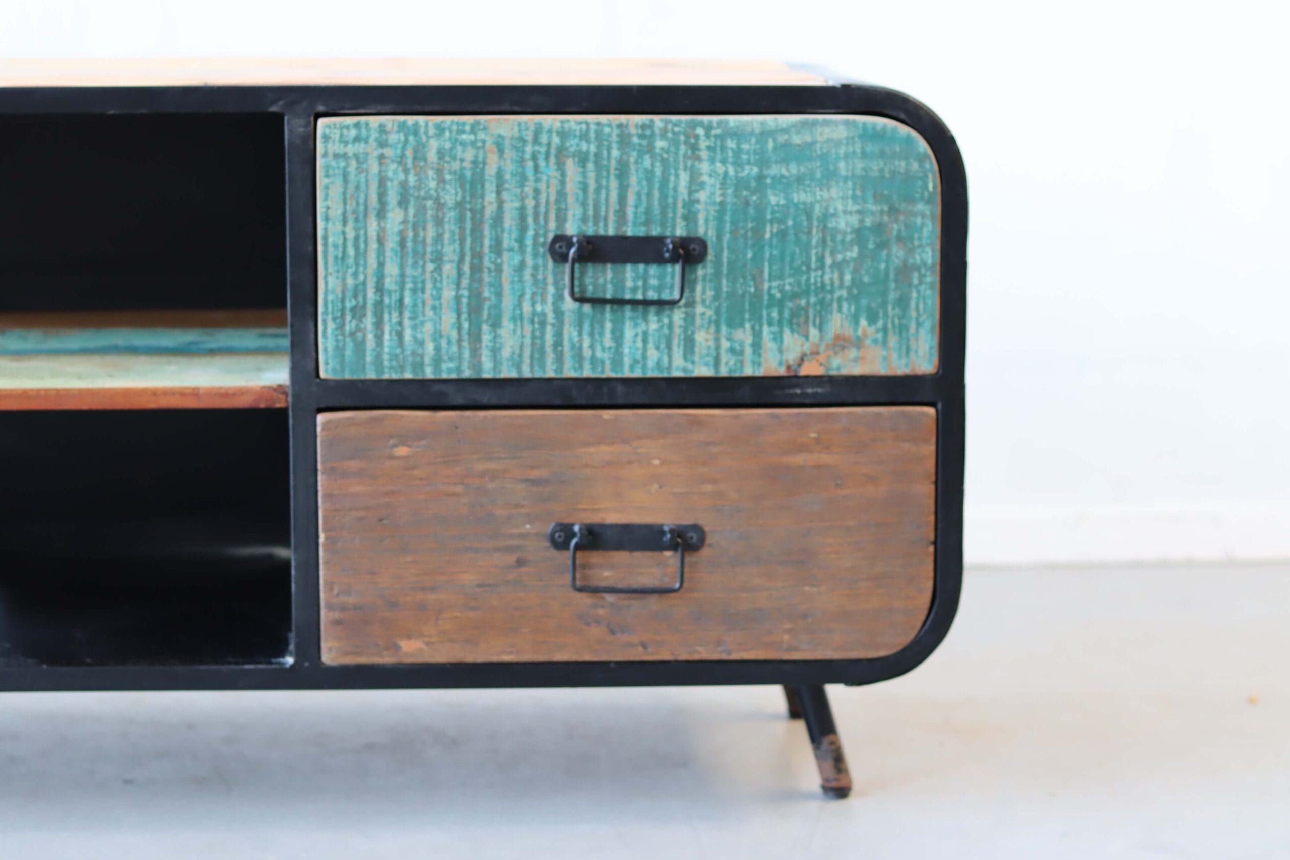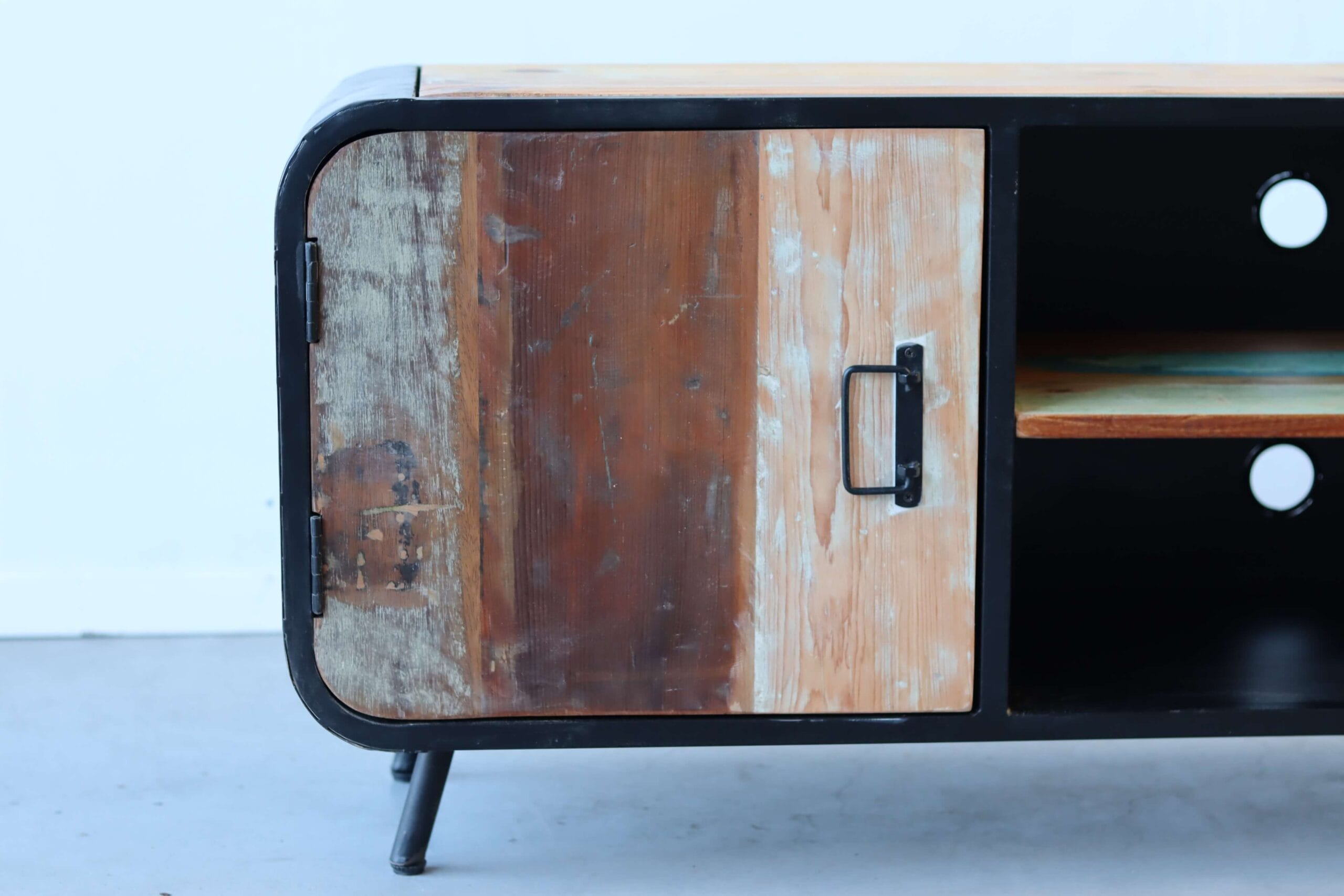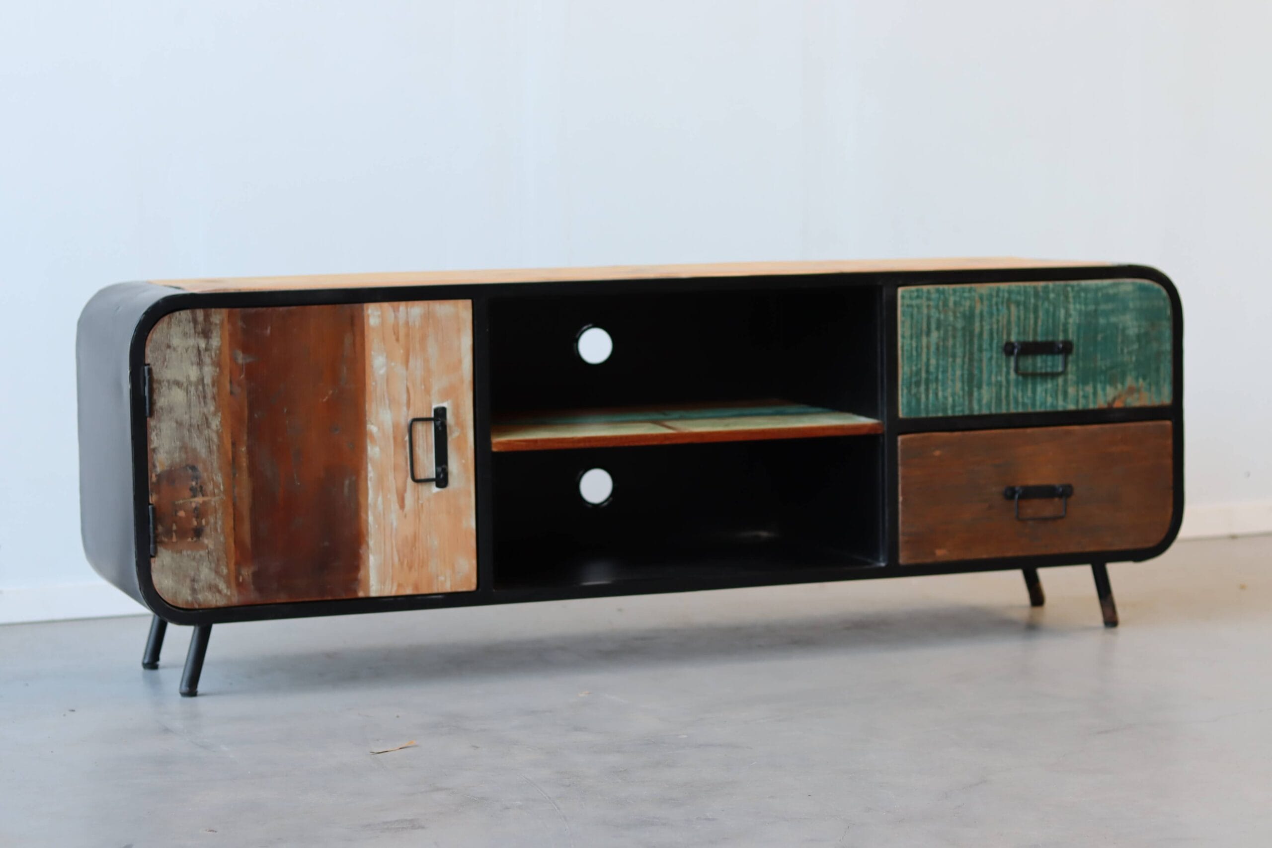 Houd je van een speelse, eigenzinnige look? Dan zijn ook de tv meubels uit de Viscollectie van Daan Hout een goede keuze. Deze meubels worden gemaakt van kleurrijk teruggewonnen hout uit Jodhpur en hebben een stijlvol visgraat motief. Elk stuk hout heeft al een heel leven achter de rug en is afkomstig van oude gebouwen, schepen, deuren of plafonds. Onze lokale ambachtslieden in India transformeren dit hout tot unieke TV meubels die niet alleen duurzaam, maar ook echte eyecatchers zijn. Het stoere zwarte onderstel zorgt voor een krachtig contrast met de warme houtkleuren, waardoor deze meubels in vrijwel ieder interieur passen.