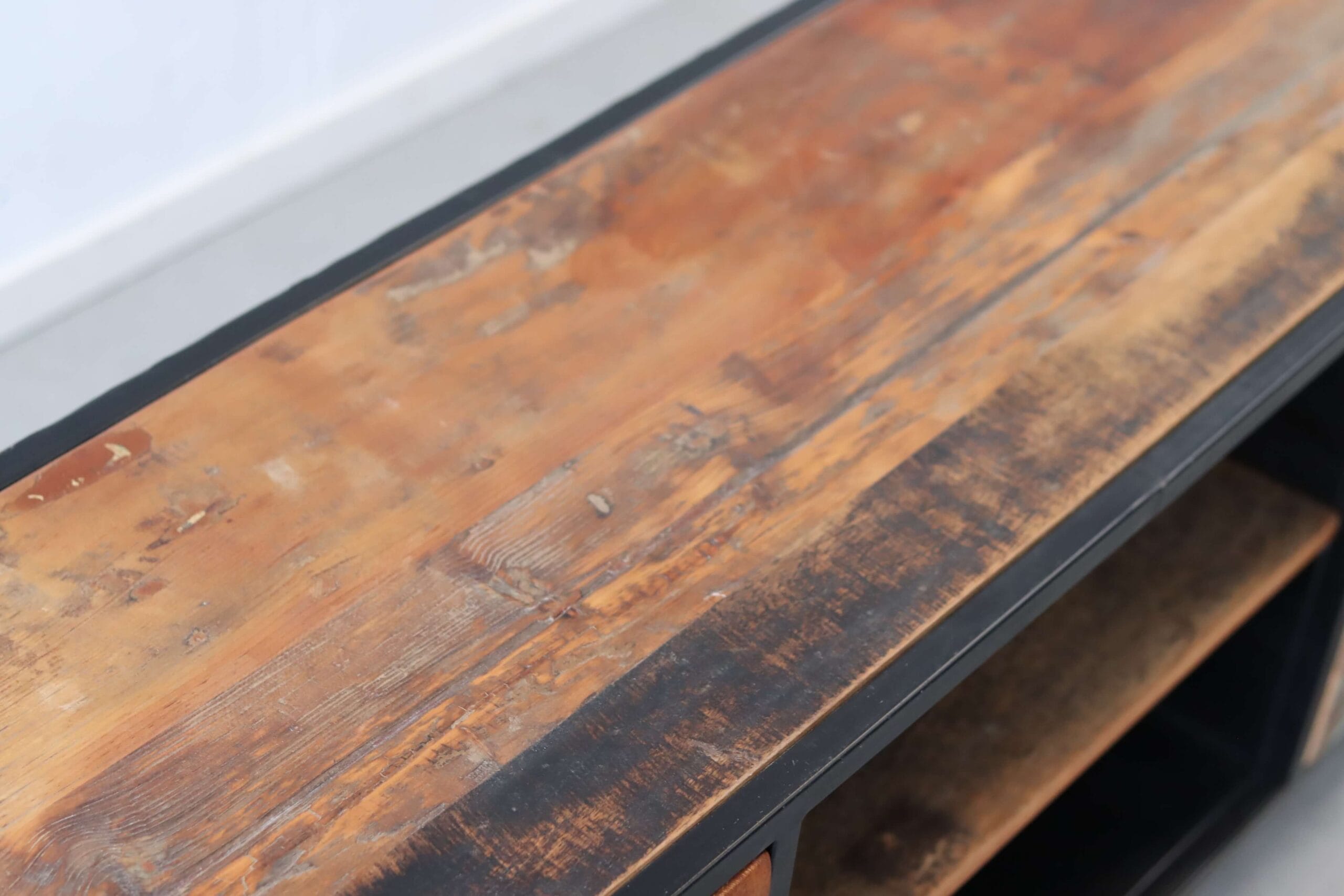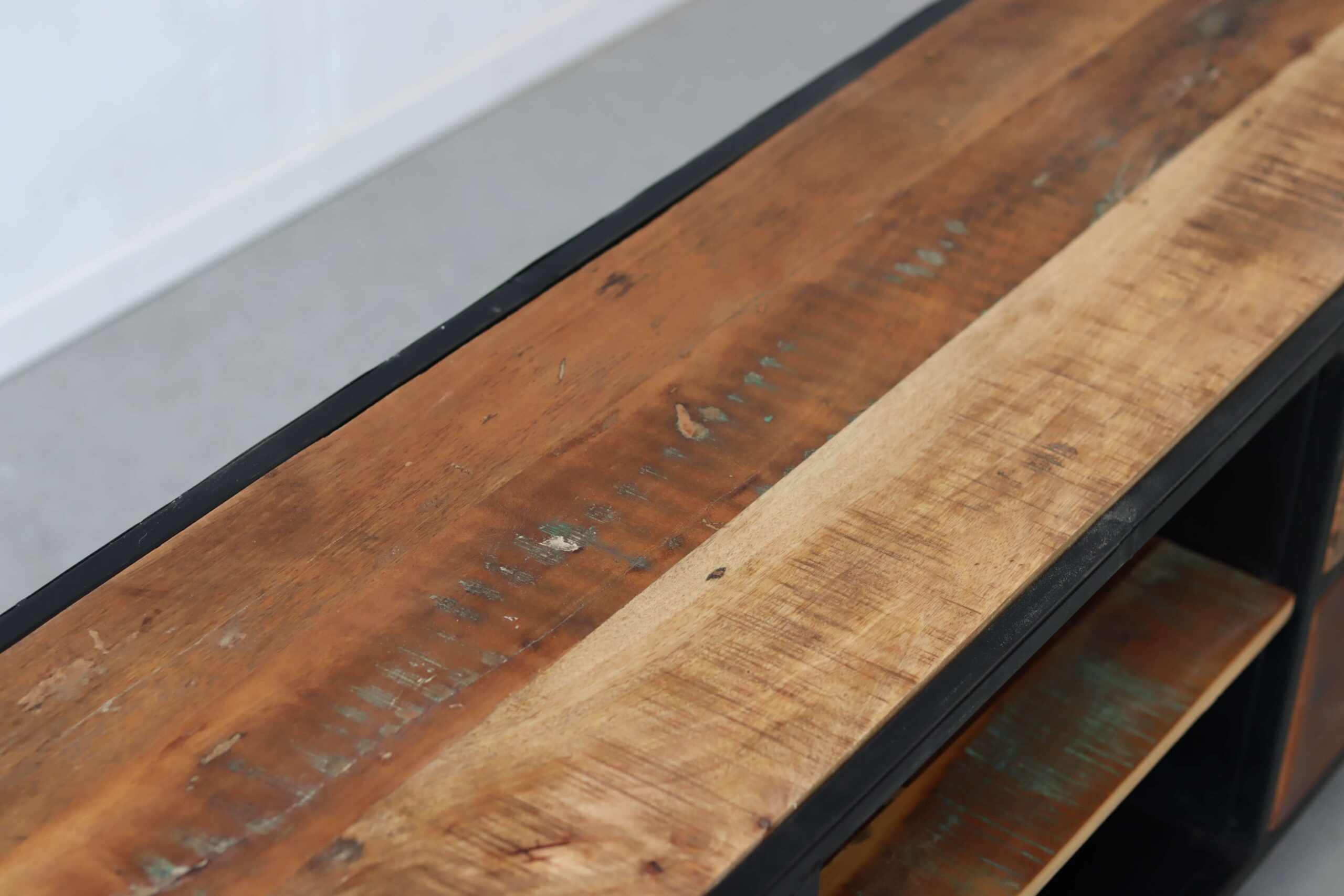 Voor dit meubel is gebruik gemaakt van hout uit gesloopte huizen in India. Oude balken, kozijnen en deuren die jarenlang een ander leven hebben geleid, krijgen hier een nieuwe bestemming. De sporen van het verleden zijn zichtbaar in elk paneel: verfrestjes, nerven, kleine oneffenheden. Allemaal dragen ze bij aan de charme van dit meubel.