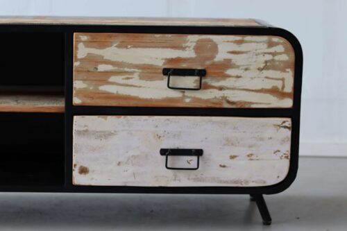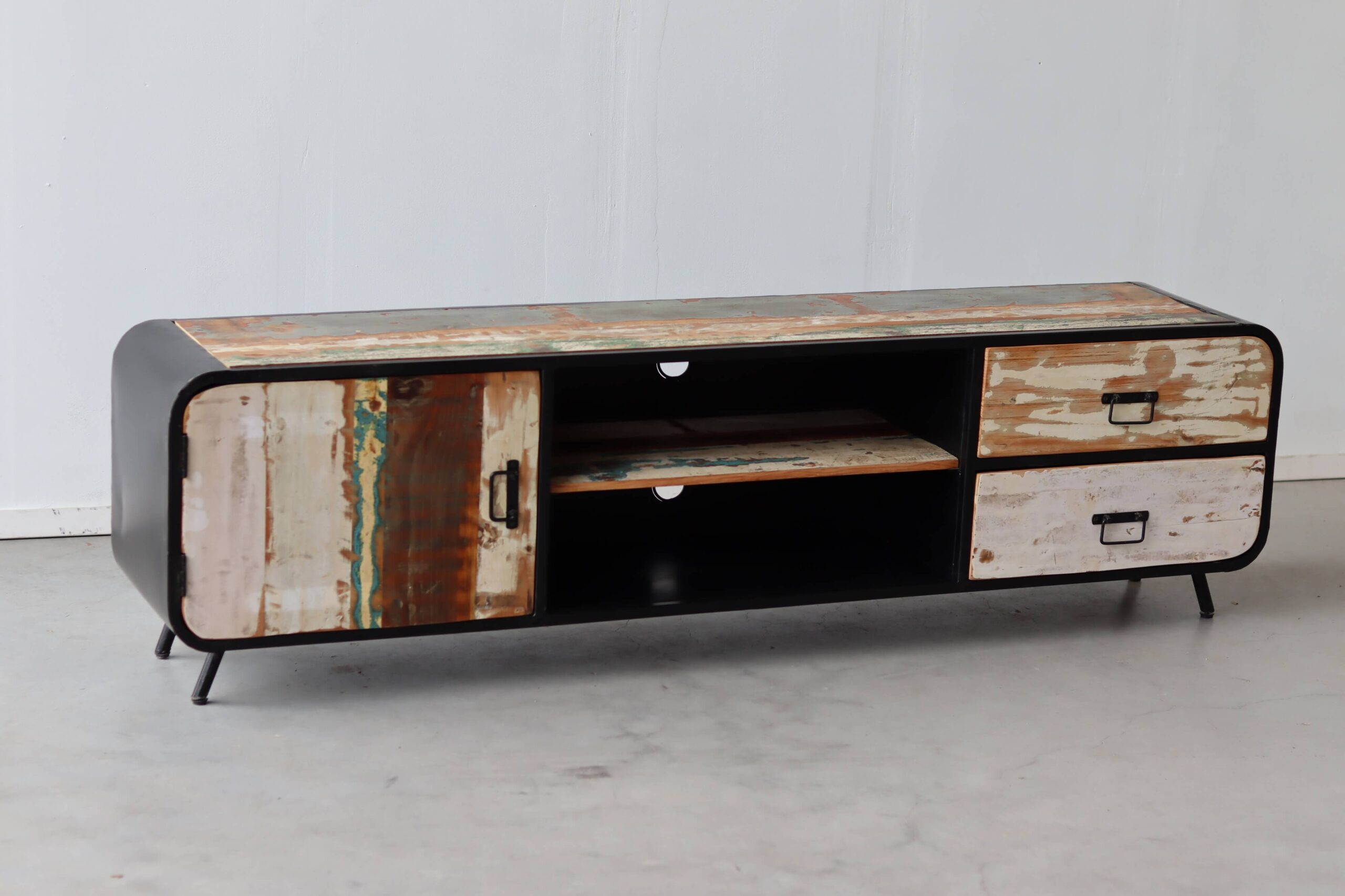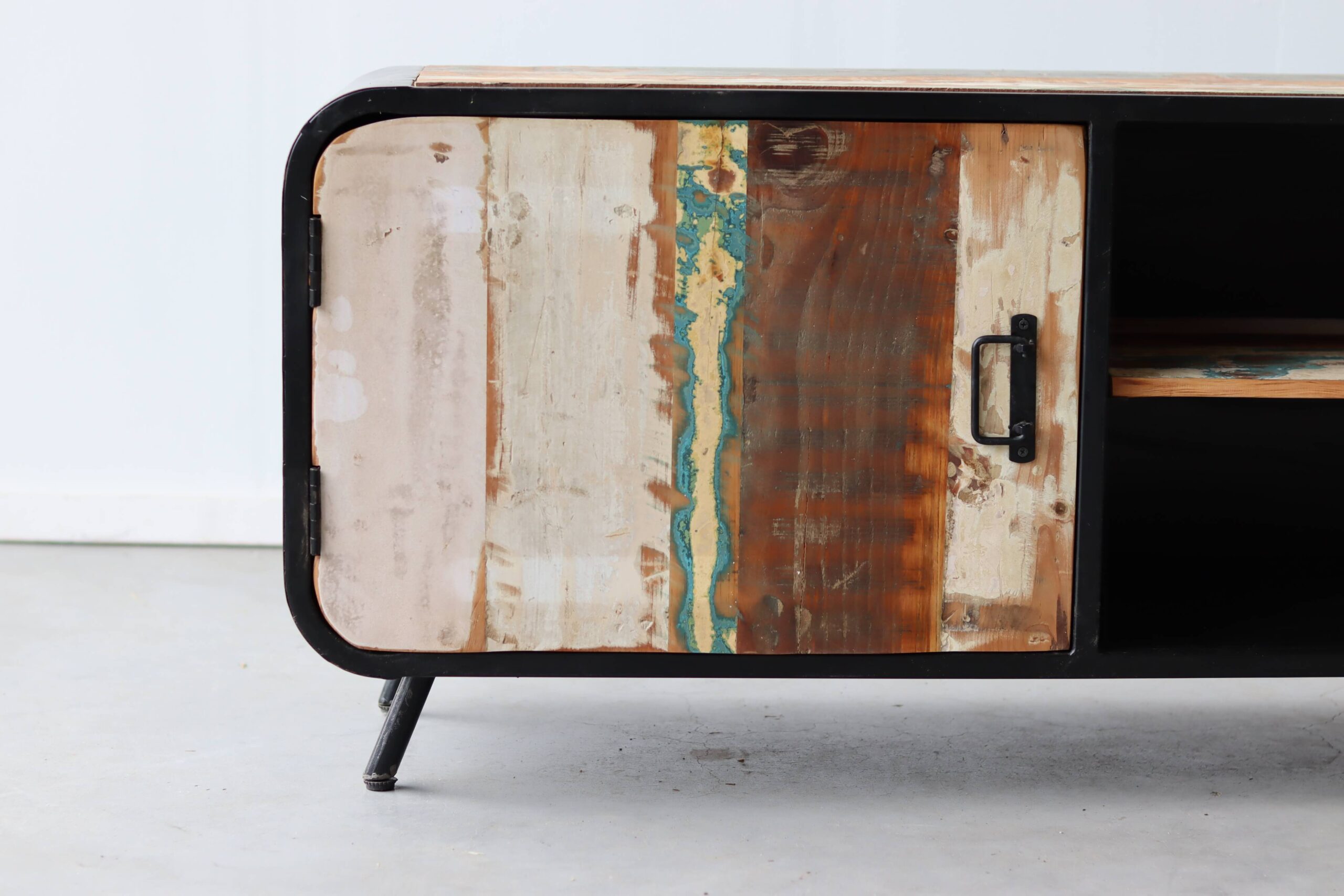 Ontdek ons stoere TV meubel, een authentiek meubelstuk gemaakt van industrieel sloophout en stevig staal. Dit meubel is vervaardigd uit hout afkomstig uit oude huisjes in India. Voor onze meubels gebruiken we uitsluitend gerecycled hout dat niet langer geschikt is voor bouwdoeleinden. Dit hout, vaak mango-, teak- of acaciahout, heeft door zijn rijke geschiedenis en verweerde uitstraling een unieke charme.