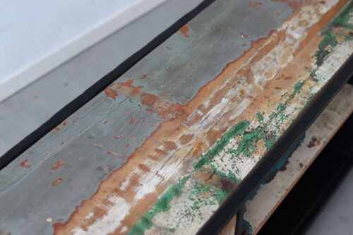 Onze meubels worden volledig met de hand vervaardigd in onze werkplaatsen in India, waar ambachtslieden vakmanschap combineren met creativiteit. Het hout dat we gebruiken, afkomstig uit oude Indiase huizen, heeft soms wel een leeftijd van 60 tot 100 jaar. De sporen van de tijd, zoals oude verfresten en natuurlijke markeringen, maken elk meubel uniek.