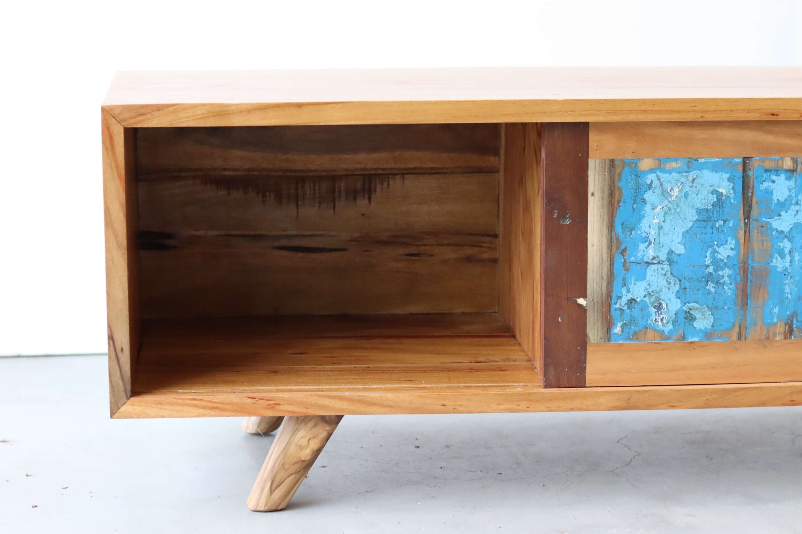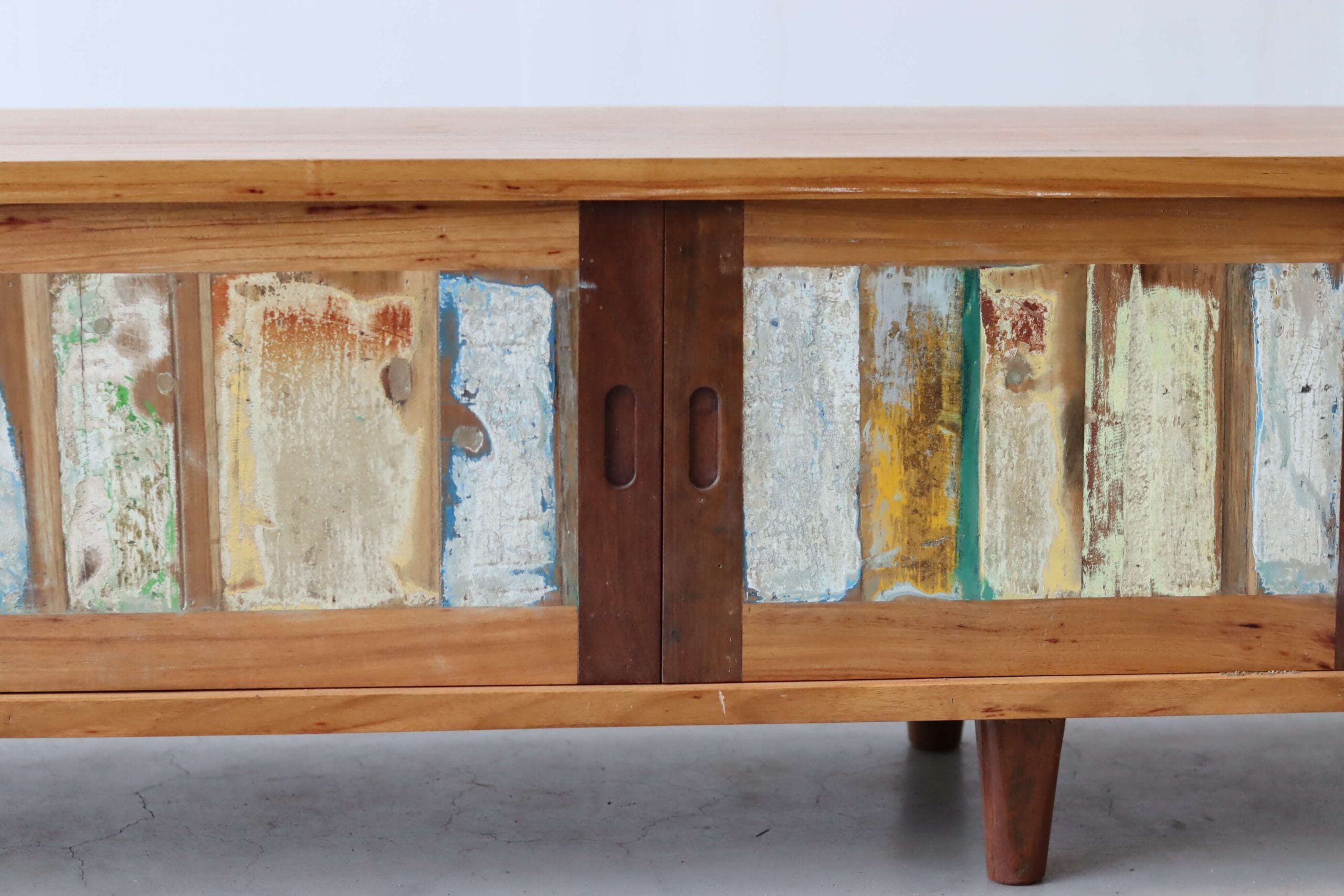 De vissersboten in Indonesië zijn vaak jarenlang blootgesteld aan de zee en hebben door de vele lagen verf unieke kleurenpatronen gekregen. Namen van boten of families zijn soms nog zichtbaar, wat elk meubel een stukje geschiedenis meegeeft. Door het hergebruik van dit hout dragen we bij aan een duurzamere omgang met grondstoffen, zonder concessies te doen aan stijl of kwaliteit.