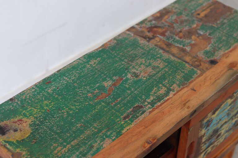 De vissersboten in Indonesië zijn vaak jarenlang blootgesteld aan de zee en hebben door de vele lagen verf unieke kleurenpatronen gekregen. Namen van boten of families zijn soms nog zichtbaar, wat elk meubel een stukje geschiedenis meegeeft. Door het hergebruik van dit hout dragen we bij aan een duurzamere omgang met grondstoffen, zonder concessies te doen aan stijl of kwaliteit.
