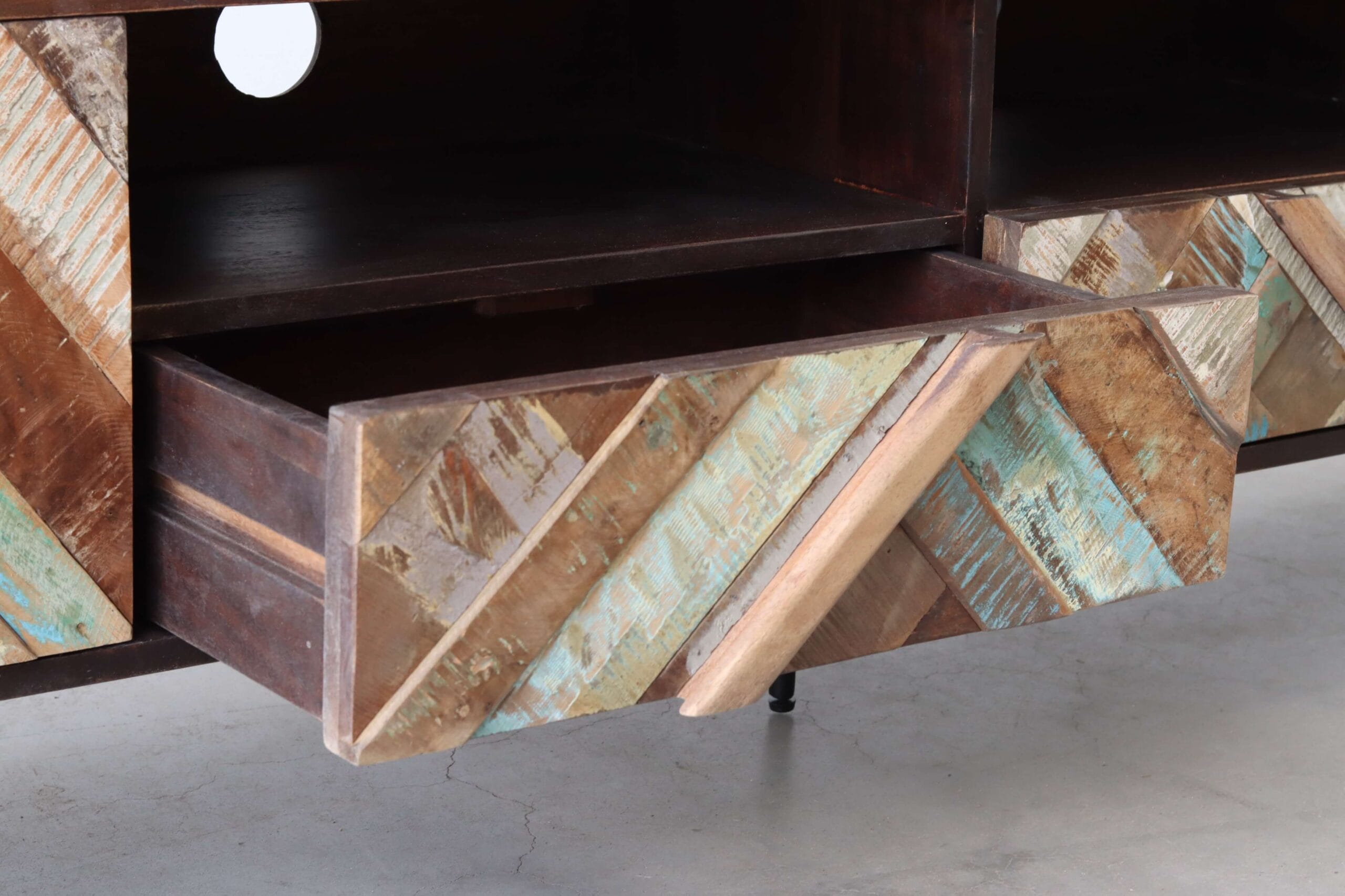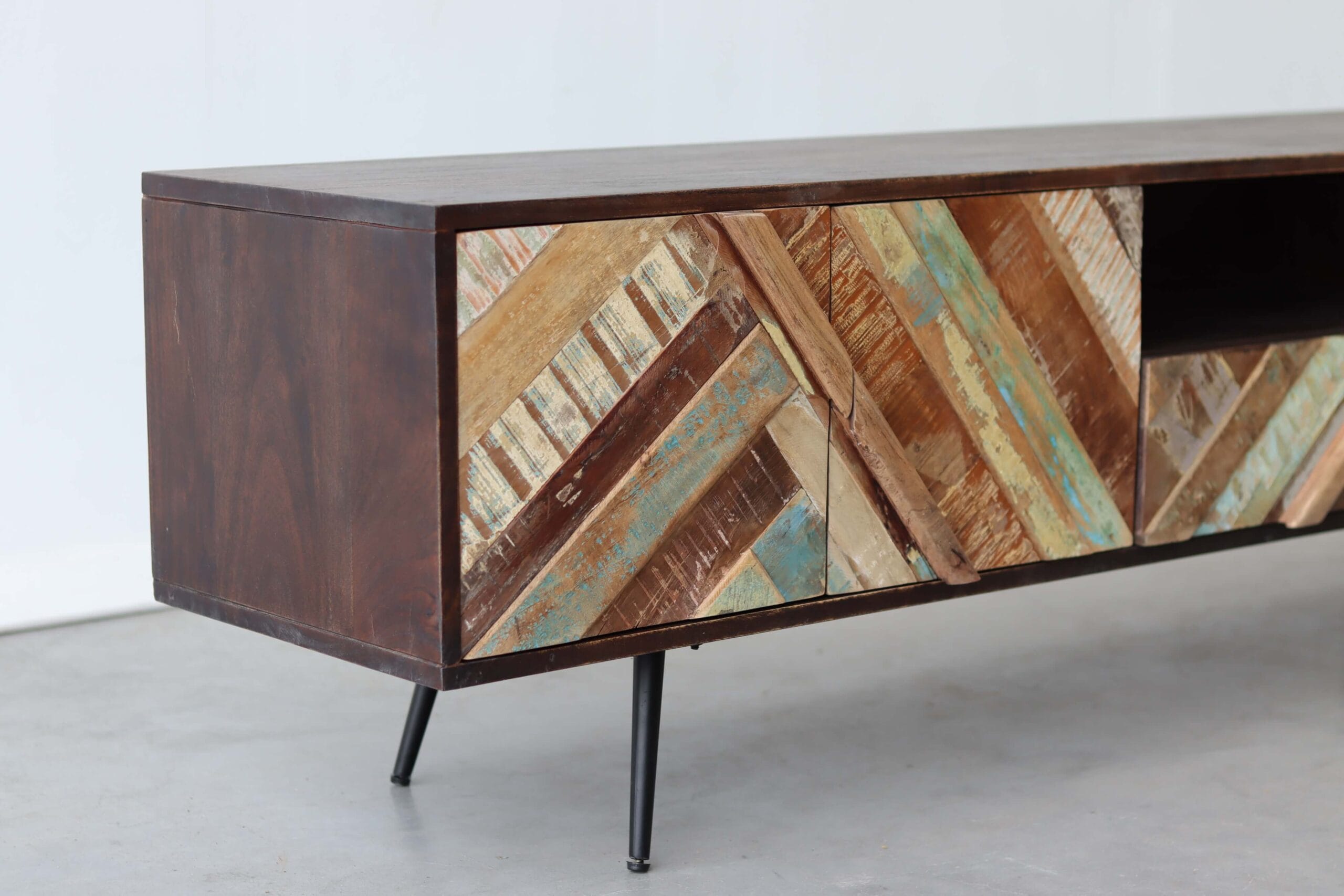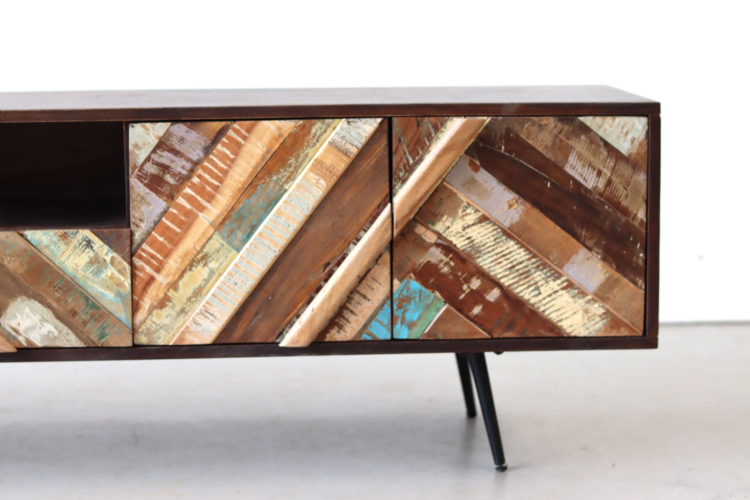 Let op: door het gebruik van gerecycled hout kan het geleverde meubel subtiele nuances vertonen ten opzichte van het exemplaar op de foto. Dit maakt elk stuk authentiek en uniek.