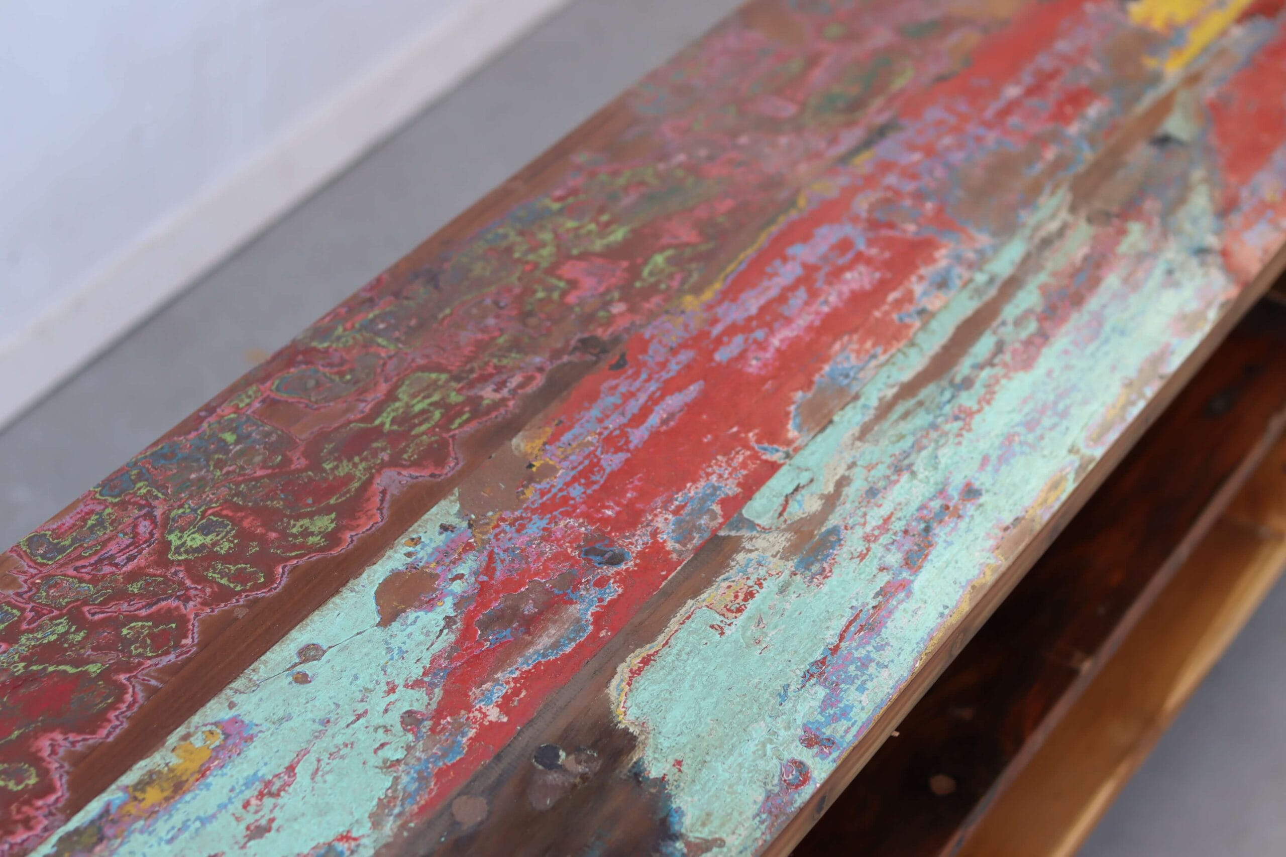 Het hout van dit meubel is afkomstig van oude vissersboten uit Indonesië. Jarenlang hebben deze boten de zee getrotseerd, voordat ze hun laatste rustplaats vonden. Wat overblijft, is hout met kleur, textuur en karakter – dat wij nieuw leven geven in de vorm van dit bijzondere meubel.