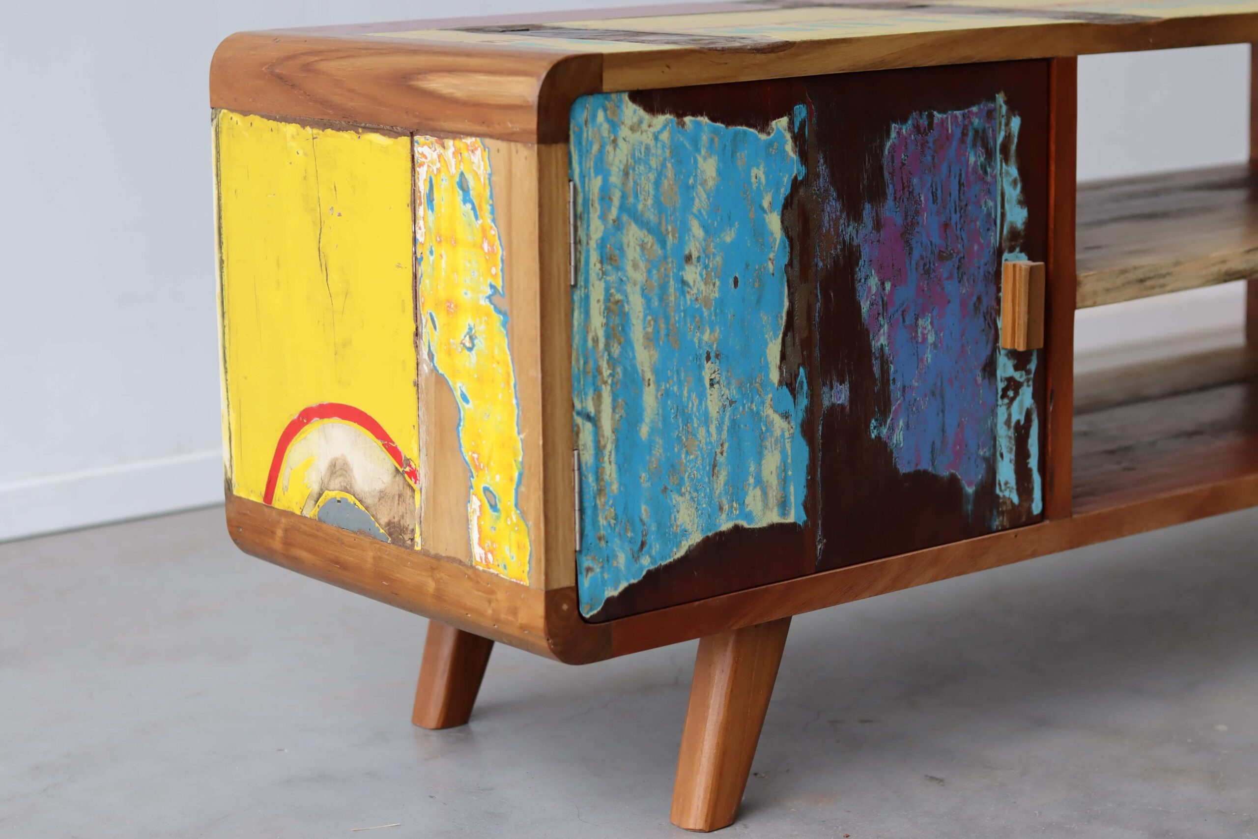 Elk meubelstuk is met de hand vervaardigd door vakmensen die oog hebben voor detail en kwaliteit. Het gerecyclede bootshout, met zijn kleurrijke en verweerde uitstraling, maakt elk exemplaar uniek. Geen enkel TV meubel Senang is hetzelfde, waardoor je een écht one of a kind meubelstuk in huis haalt.