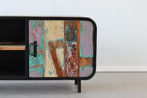 De sporen van het verleden – verfrestjes, krassen en verkleuringen – blijven zichtbaar en maken ieder meubel one of a kind. In combinatie met het zwarte staal ontstaat een TV-kast met een industrieel karakter, maar wél met een warme, doorleefde uitstraling.