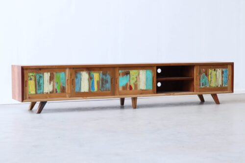 Het TV meubel 250 cm uit de Java-serie is dé keuze voor wie een royaal, karaktervol meubel zoekt. Handgemaakt van gerecycled Indonesisch boothout en afgewerkt met schuifdeuren en open vakken, is dit meubel praktisch in gebruik én een blikvanger in de woonkamer. Met zijn lengte van 250 cm biedt de Java volop ruimte voor grote televisies en voegt hij warmte en persoonlijkheid toe aan elk interieur.