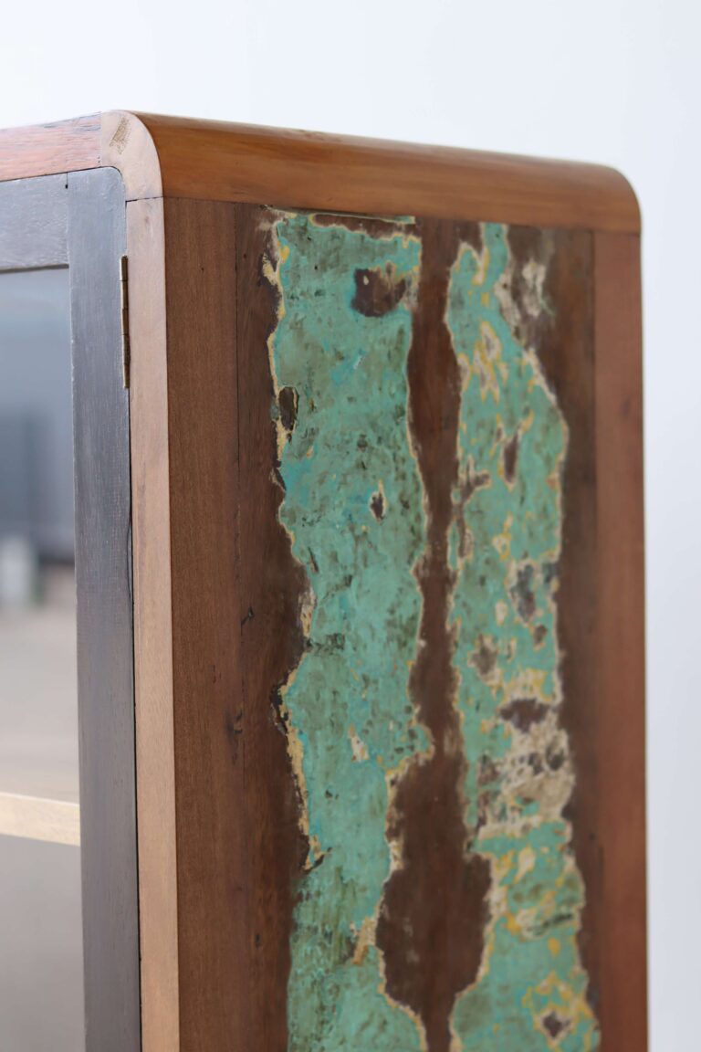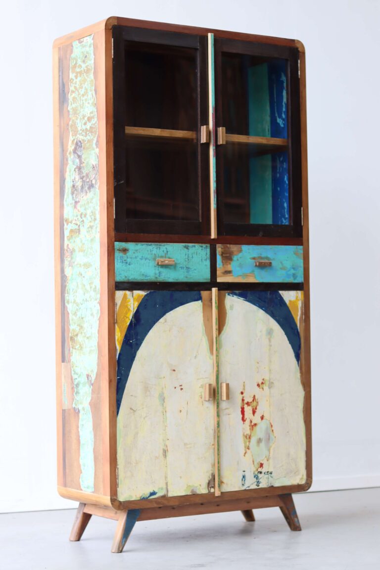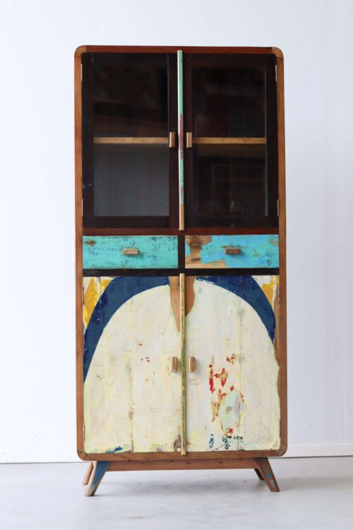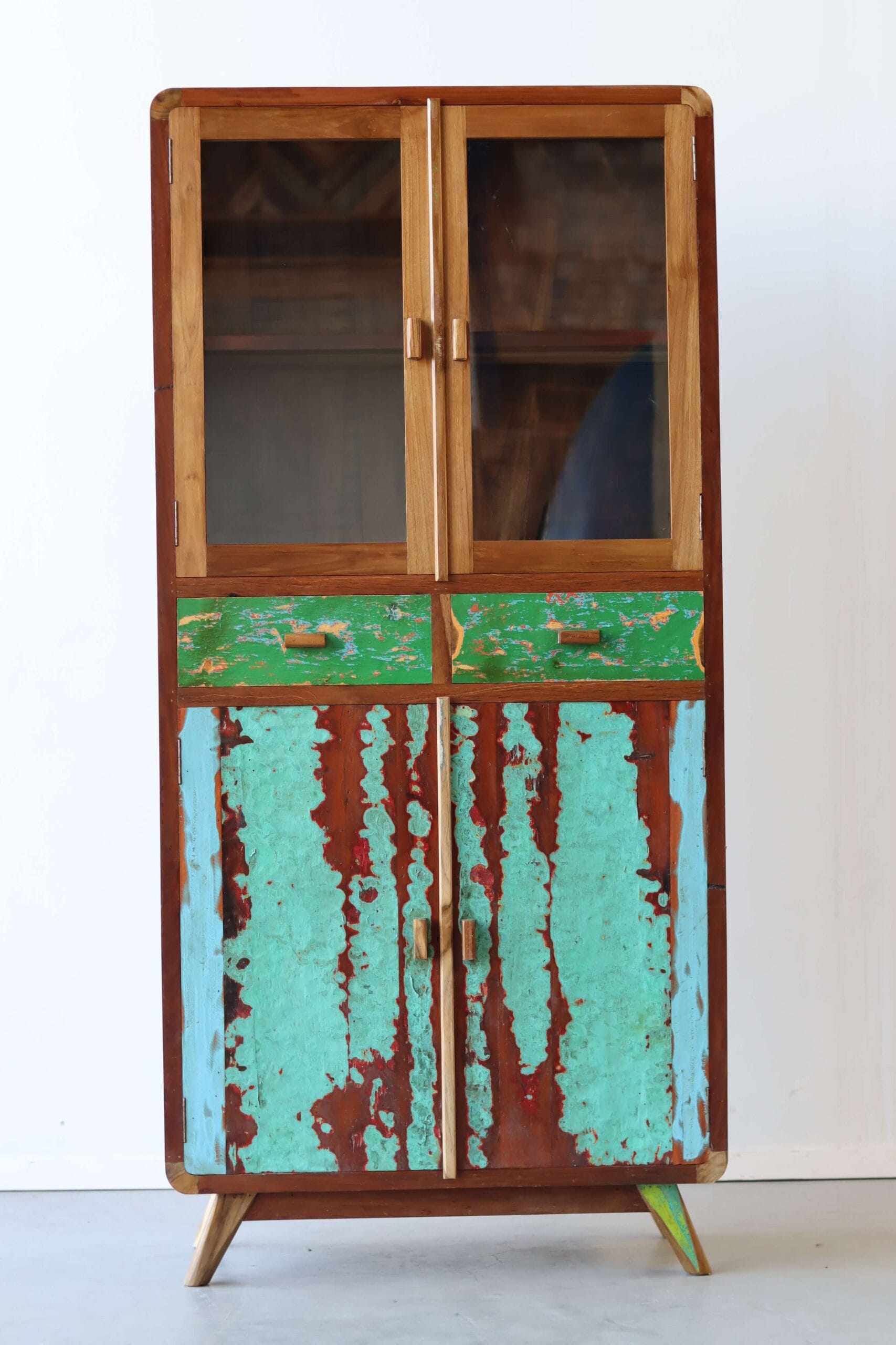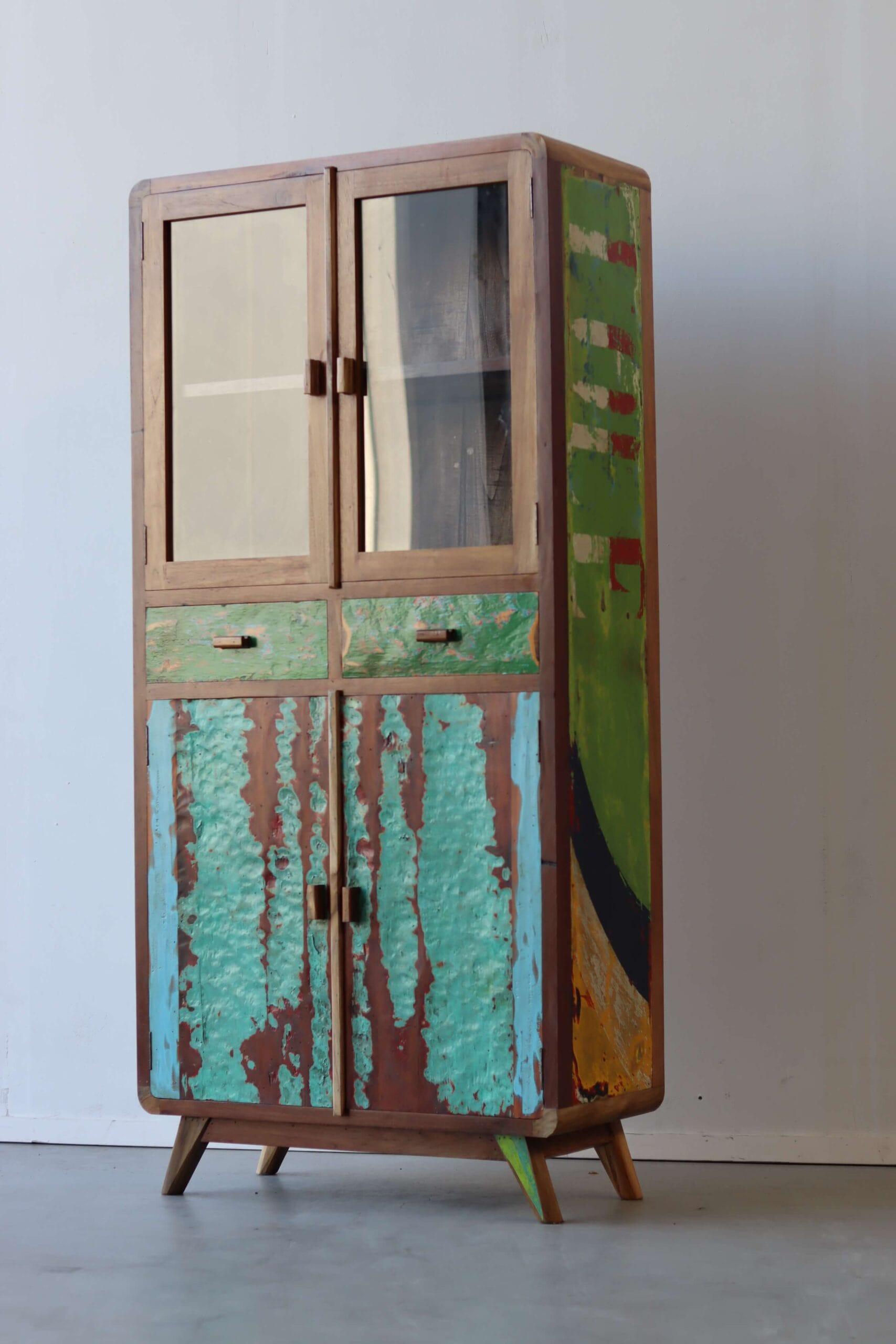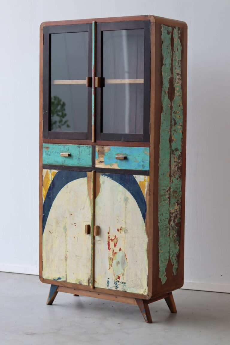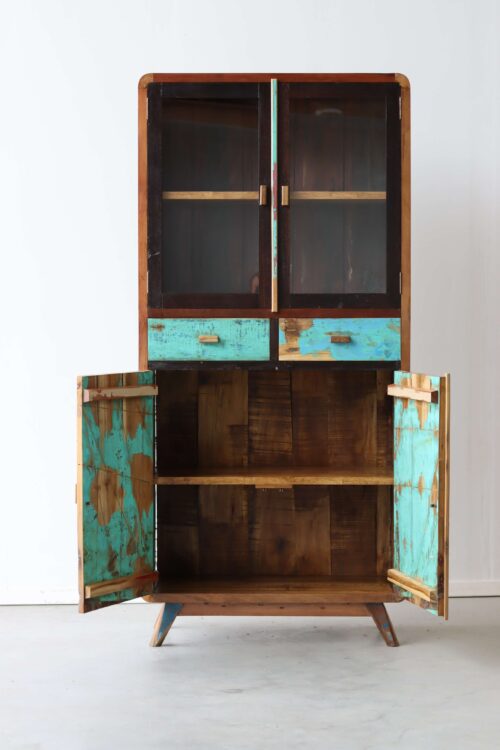 Het hout dat ooit de golven trotseerde, krijgt een nieuw leven in deze vitrinekast. Door de combinatie van glazen vitrinedeuren en gesloten opbergruimte is de kast zowel praktisch als sfeervol. De vakken bieden plek voor dierbare herinneringen, mooie serviezen of boeken die het verdienen om gezien te worden.